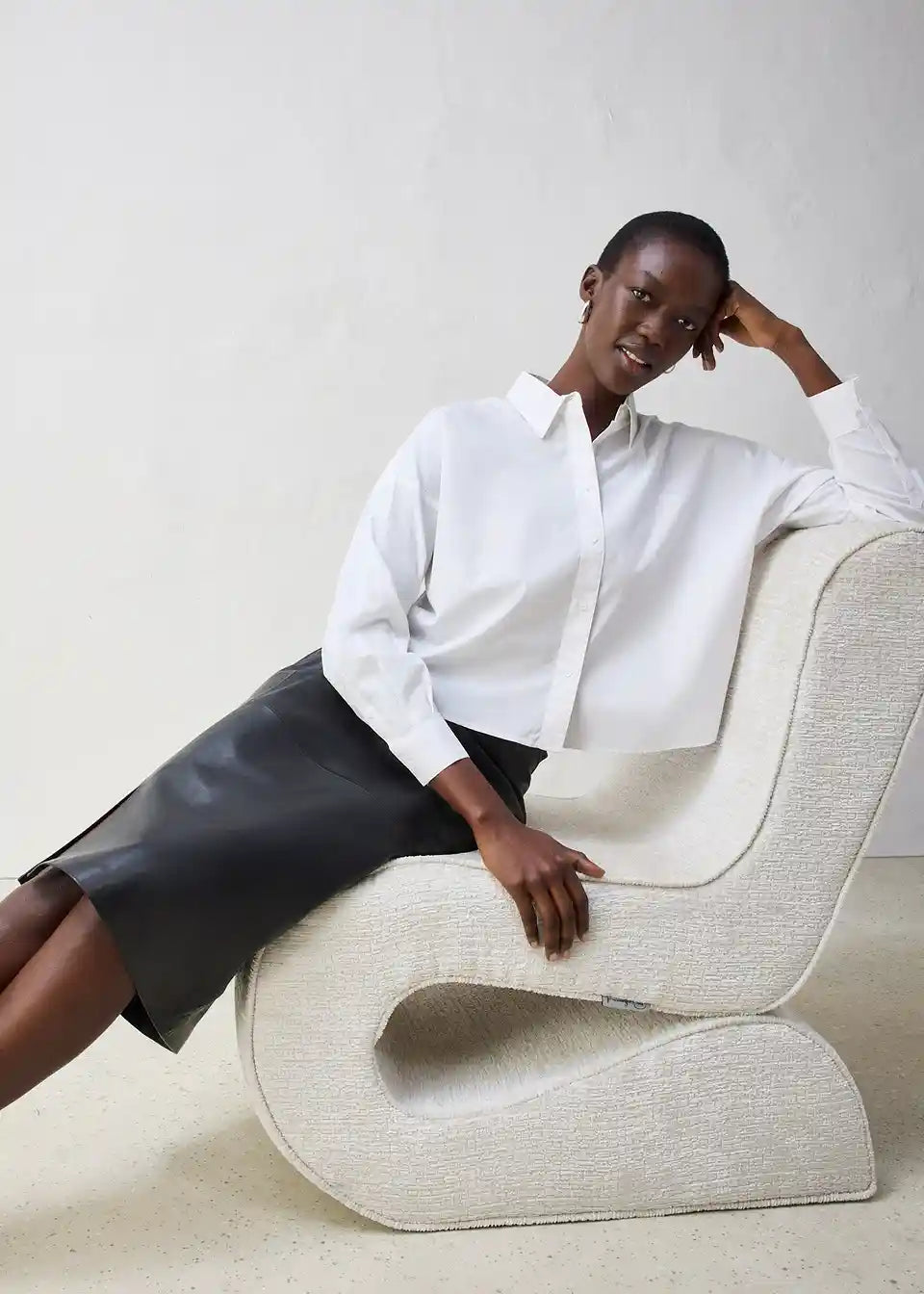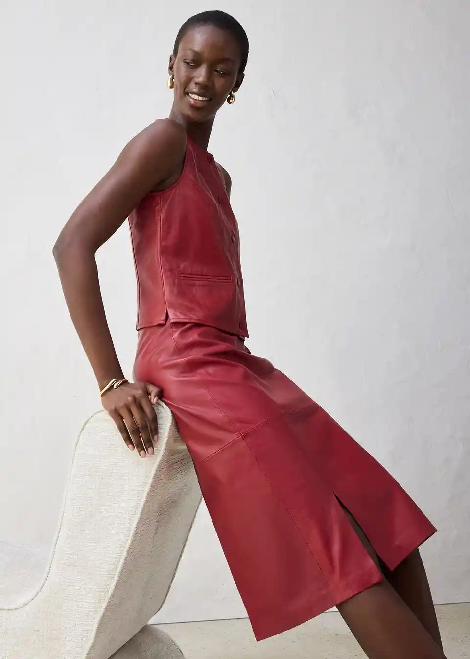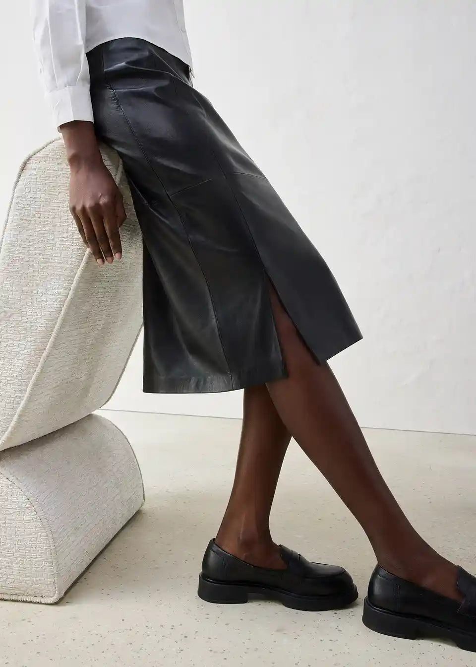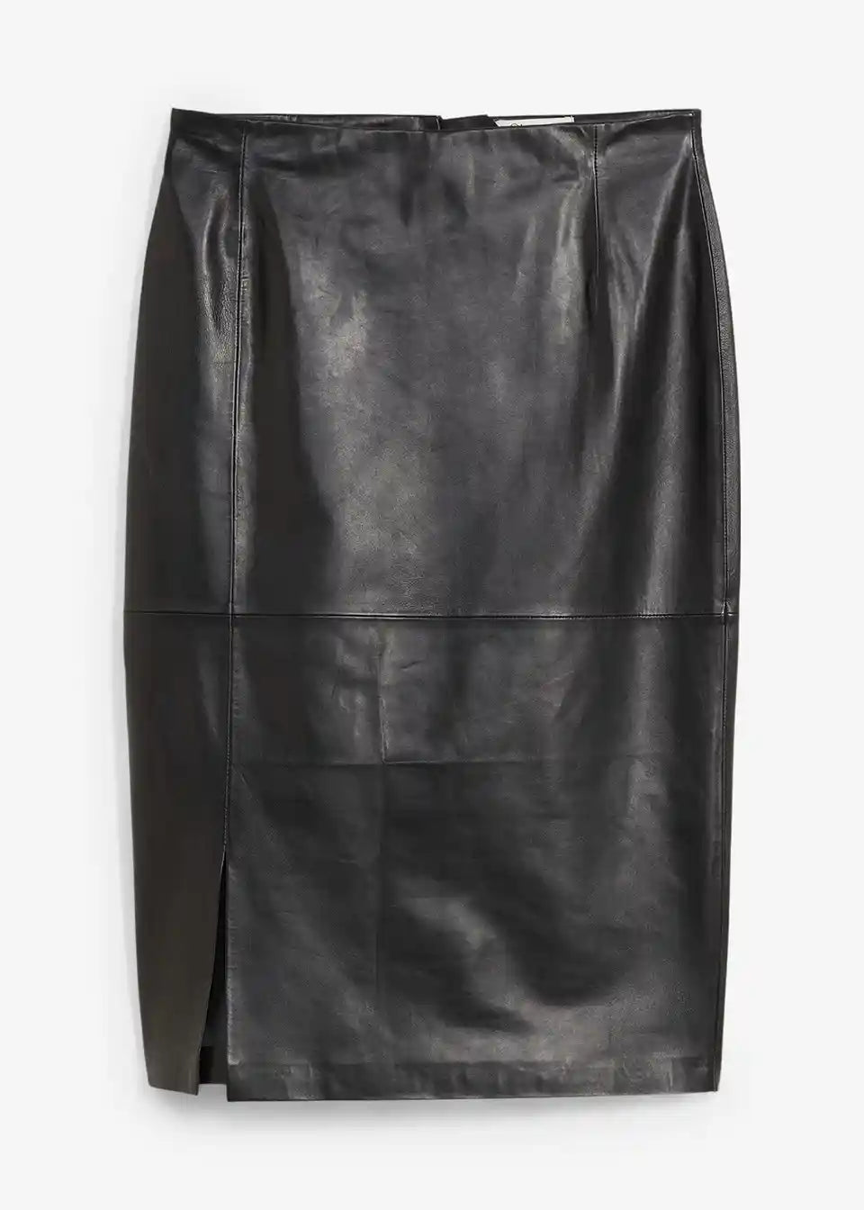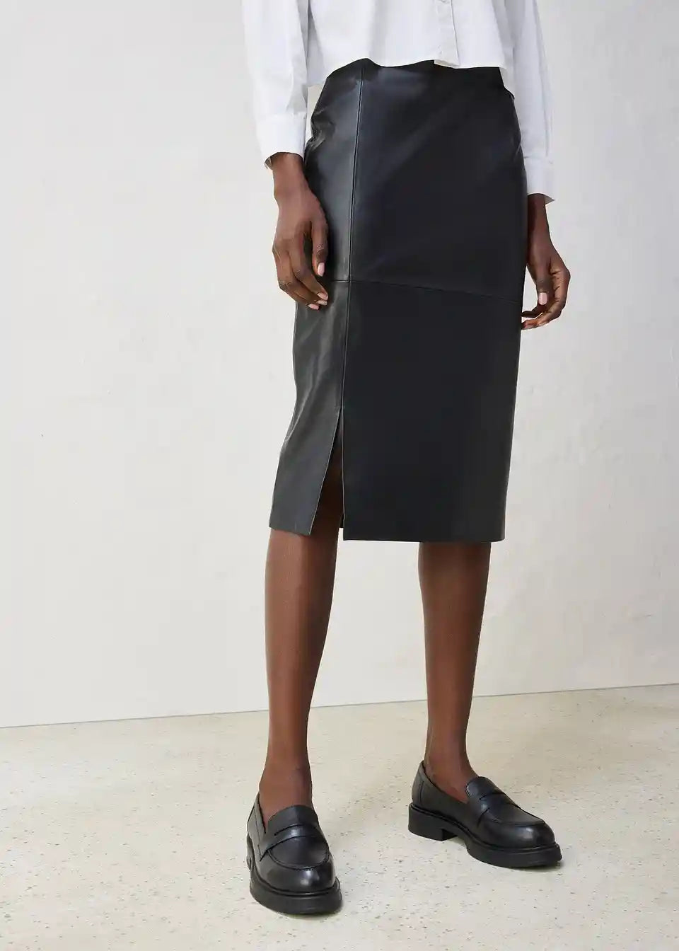 Moderno usnjeno krilo v oprijetem kroju z elegantnim razporkom spredaj