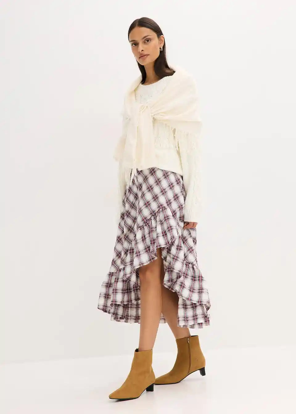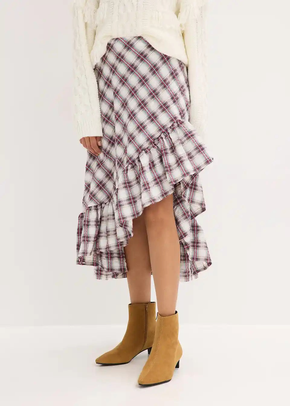 Karirasto zadaj daljše krilo z volani na spodnjem robu