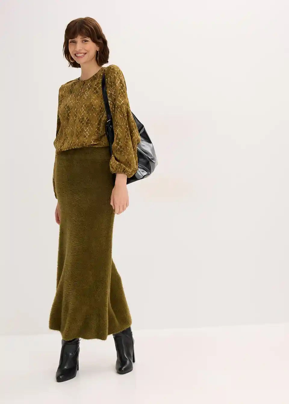 Bluzna tunika z ozkim pokončnim ovratnikom in napihnjenimi rokavi, ki so vse širši proti robu
