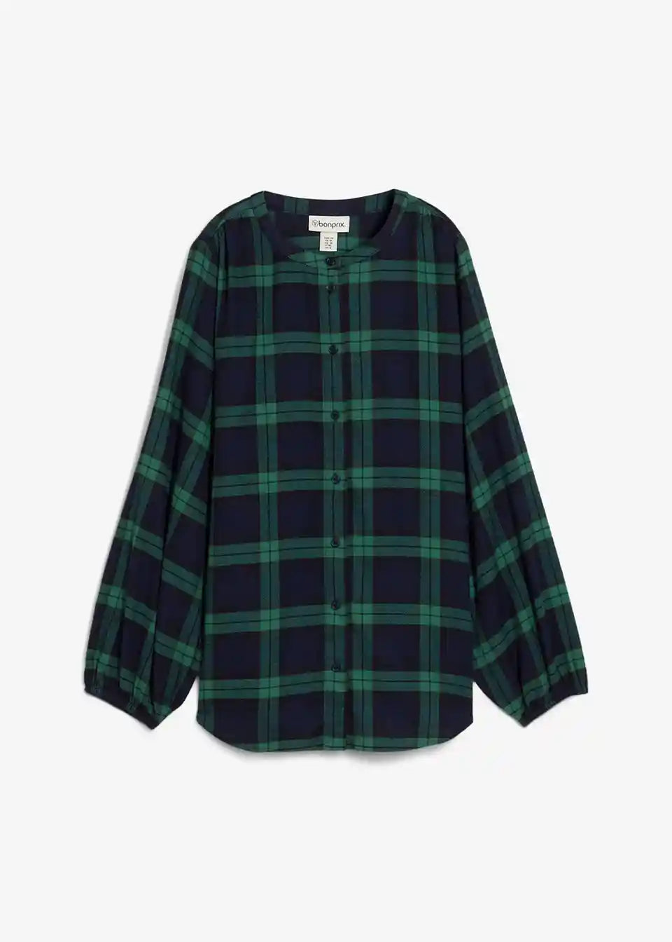 Model z okroglim izrezom v ohlapnem kroju z elastičnimi zaključki na obrobah rokavov.