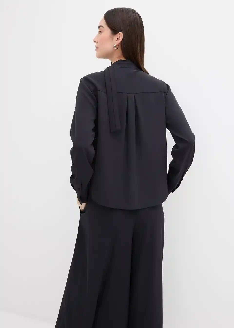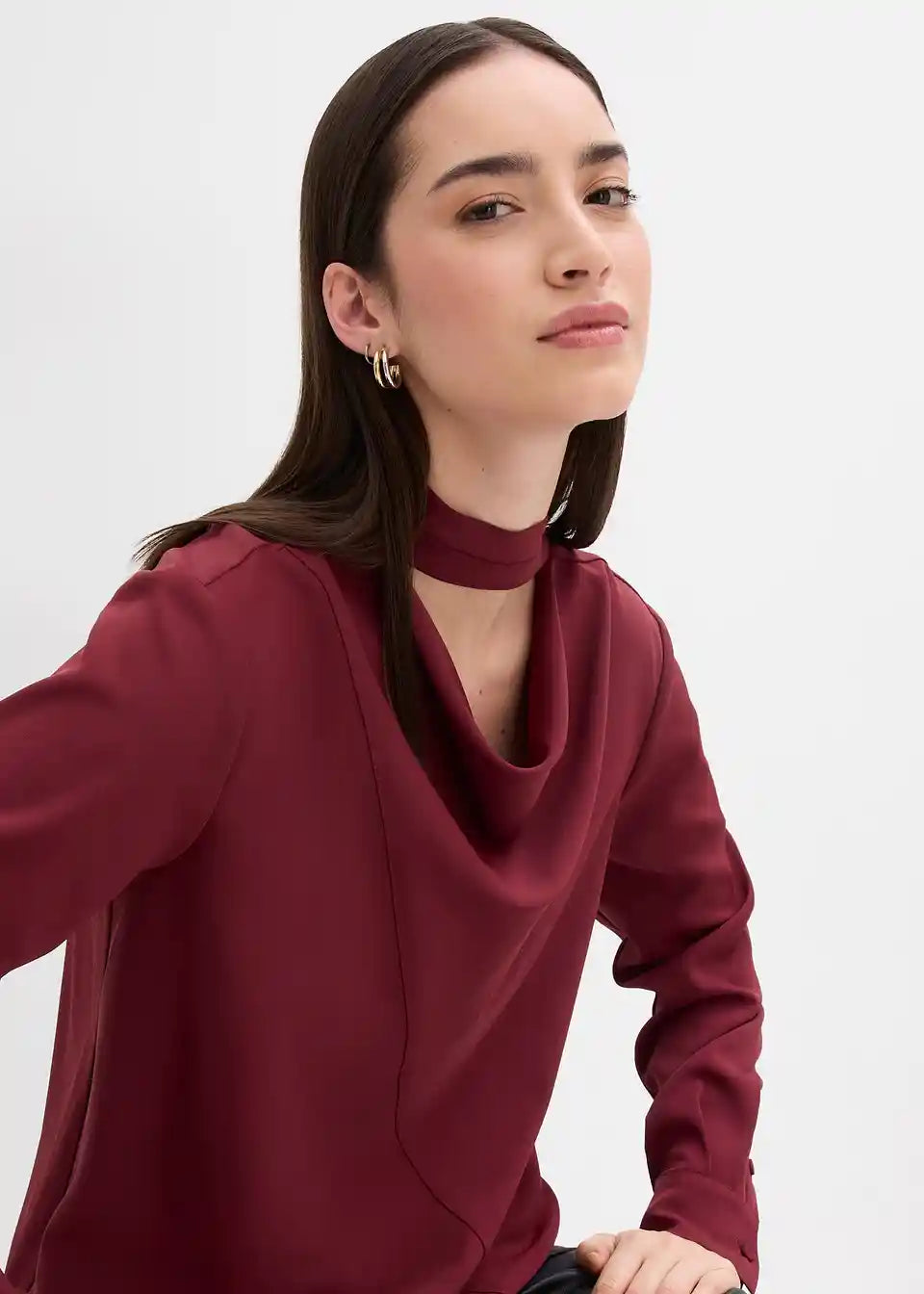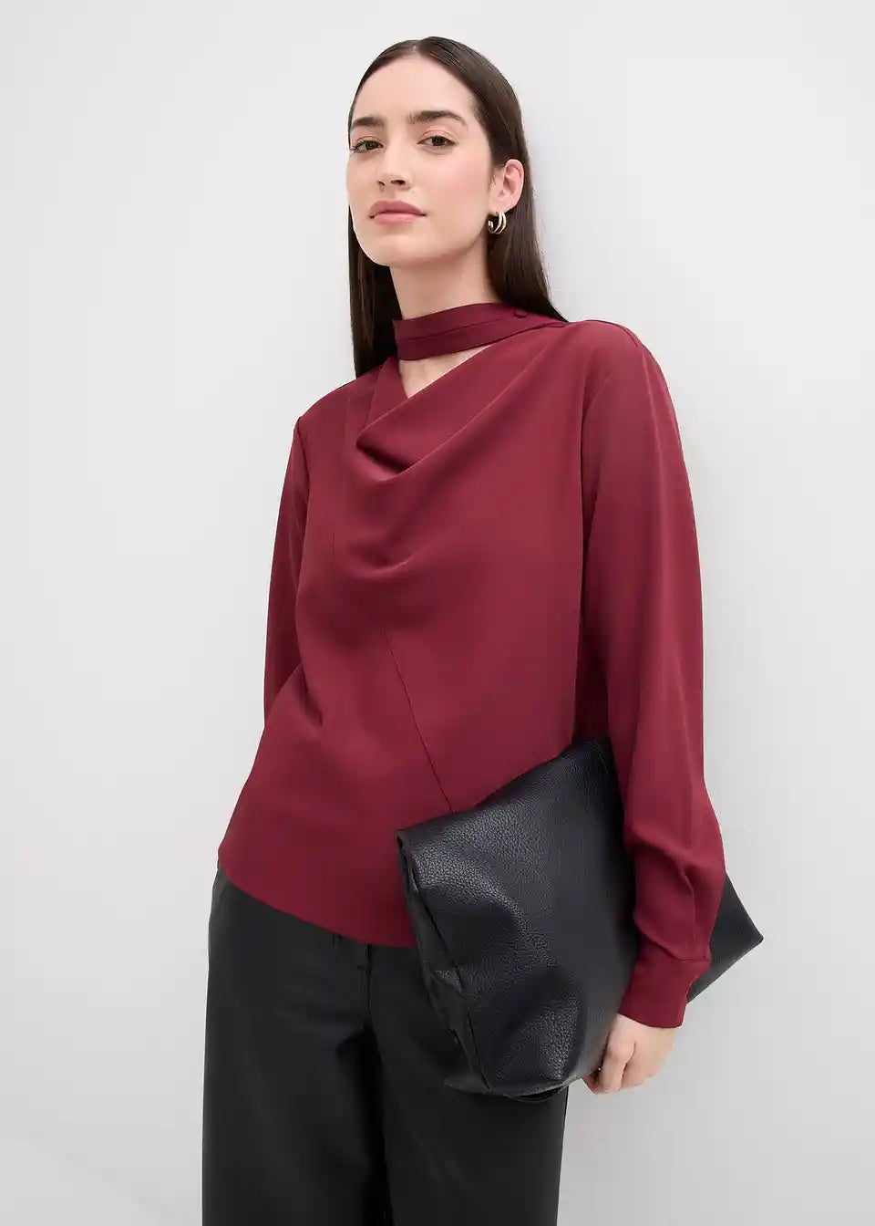 Rahlo sijoča bluza s padajočim nabranim izrezom in detajli vezalk na vratu za nastavitev širine