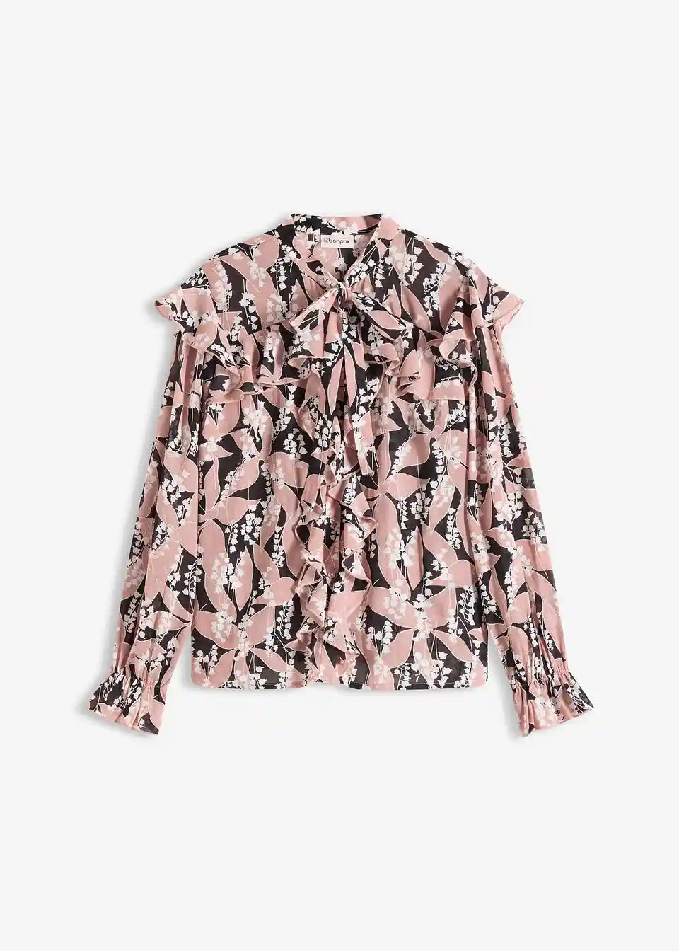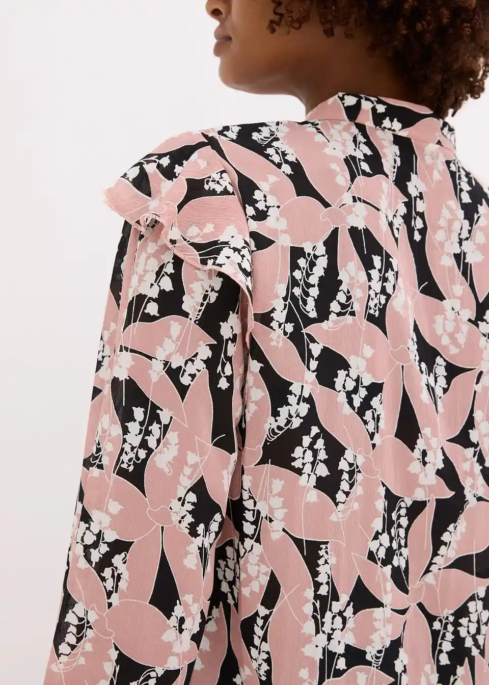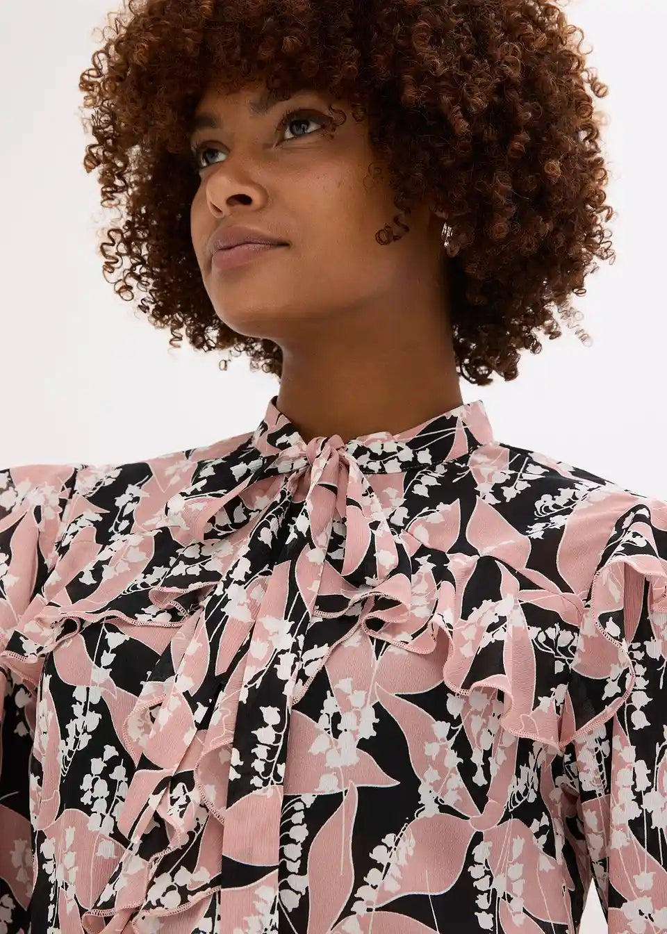 Ženstvena bluza iz šifona z volani in cvetličnim potiskom
