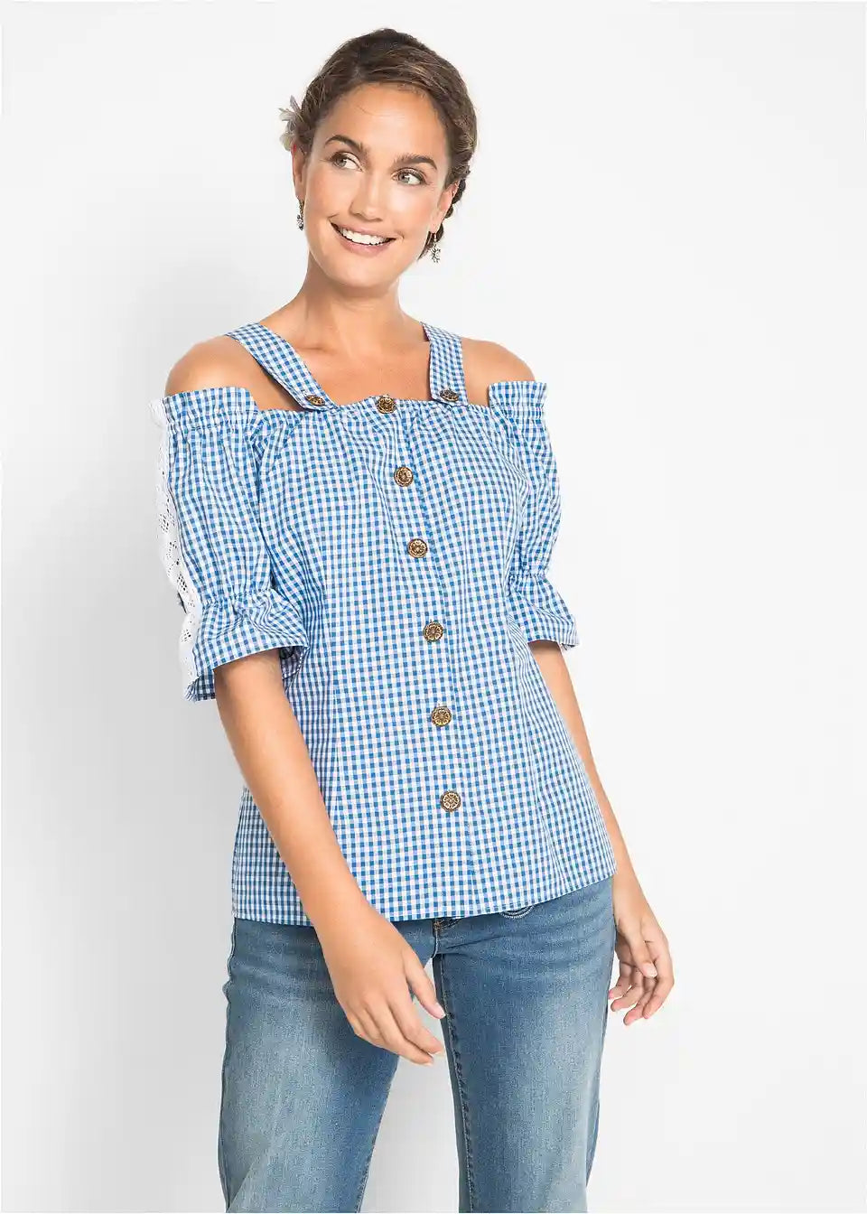 S to čudovito narodno bluzo znamke bpc boste vedno urejene, ne le na Oktoberfestu. Bluza s polovičnim rokavom in gumbi prepriča z iznajdljivo obdelavo rokavov: zaradi elastičnih vložkov nastanejo značilni napihnjeni rokavi. Rokavi so ob strani okrašeni s kvačkanimi čipkami. Široke naramnice so nastavljive po dolžini, kar zagotavlja dobro prileganje. Carmen-izrez poudari ramena in dekolte. Sprednji in zadnji všitki v prsnem in pasnem delu oblikujejo lepo postavo. Karirana narodna bluza se odlično kombinira z ustreznimi narodnimi hlačami.