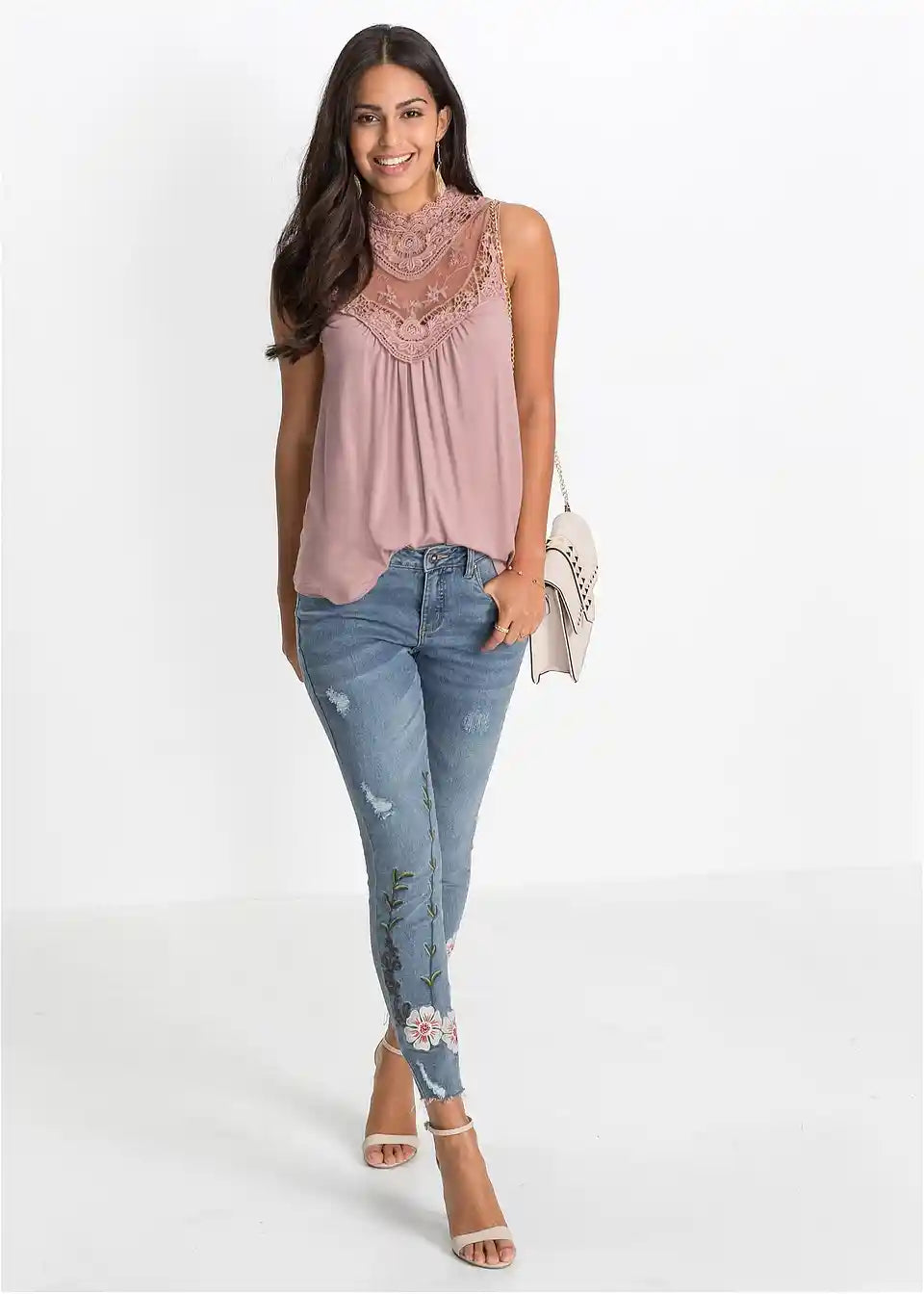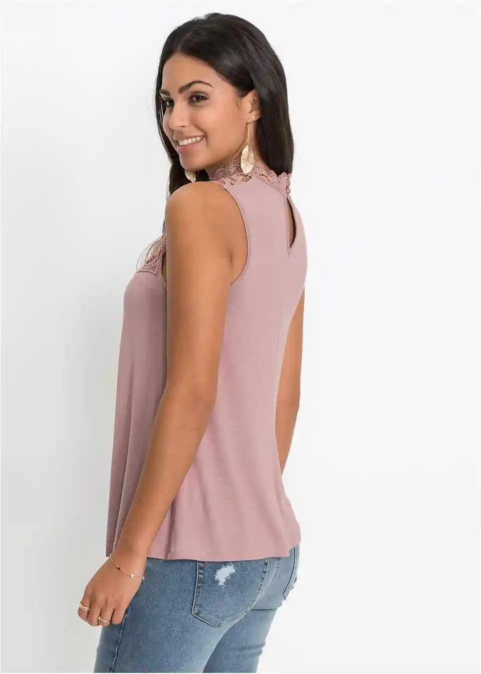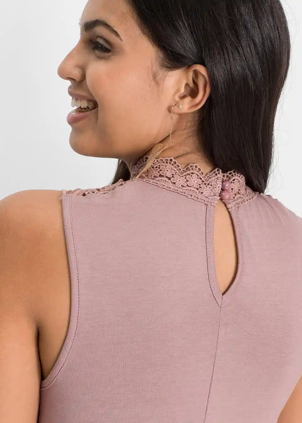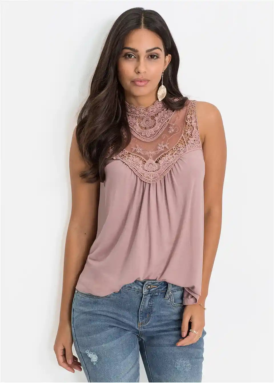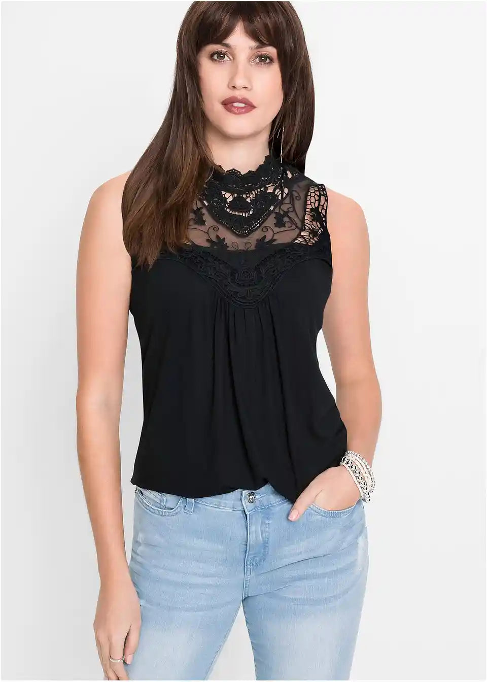 Ta brezrokavna srajčna bluza znamke BODYFLIRT navdušuje s svojim elegantnim dizajnom. Odlikuje jo mehko padajoča tkanina z ohlapnim krojem. Izrez je okrašen s prefinjenim čipkastim vložkom, ki bluzo obogati z romantičnim pridihom. Poseben poudarek je na majhnem stoječem ovratniku, ki se na zatilju zapenja s pomočjo gumba.