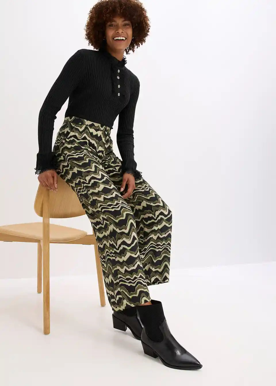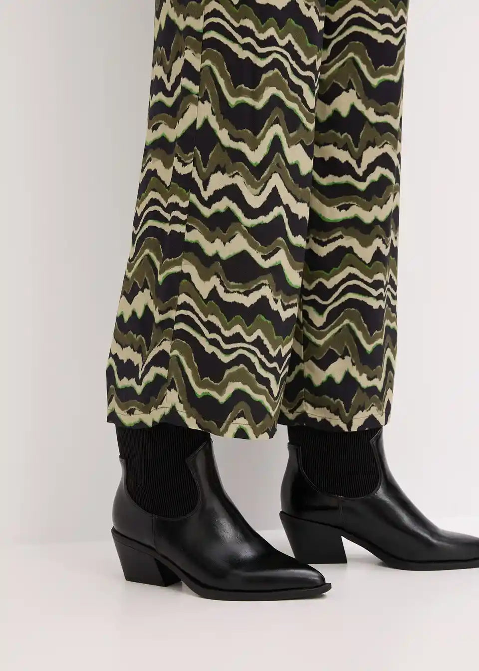 Modno potiskane palazzo hlače iz lahkega viskoznega krepa s kljukicami in obročki za zapenjanje spredaj
