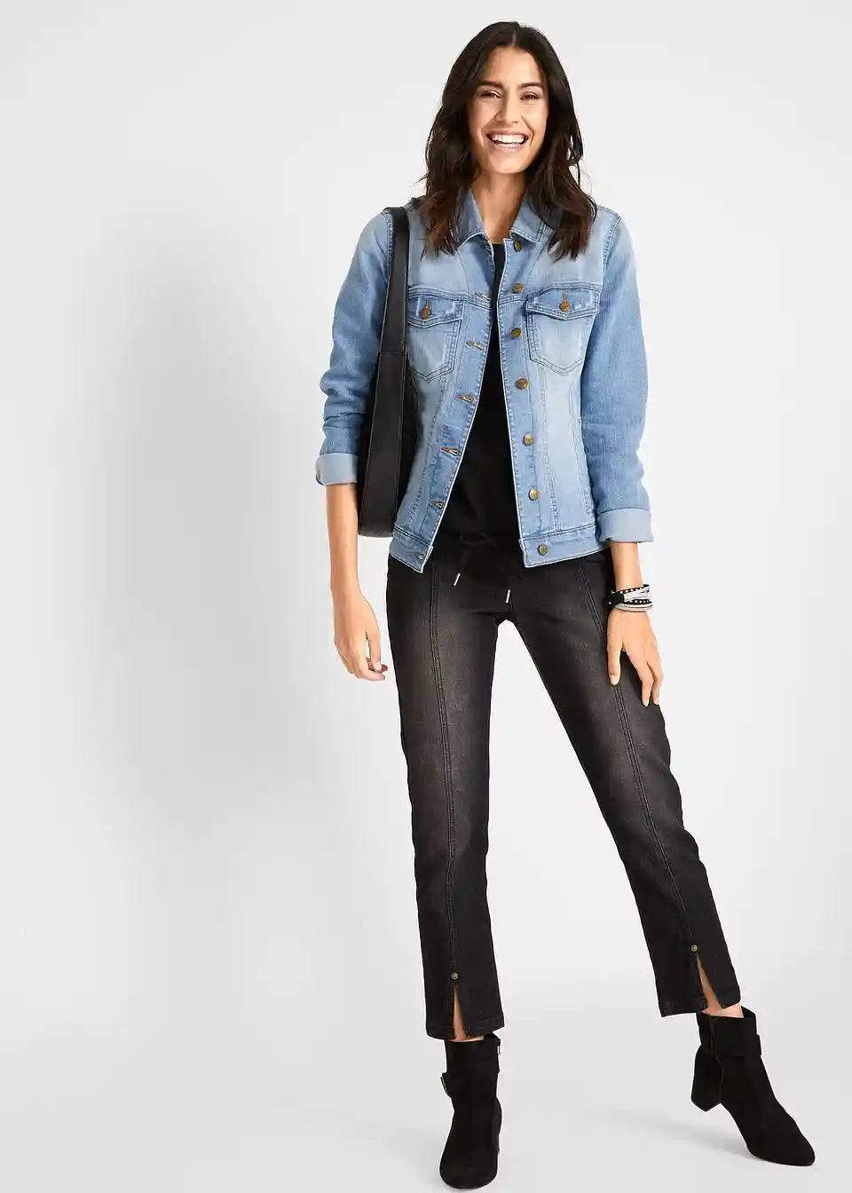 Vsakodnevna kombinacija z jeans jakno in stranskim rebrastim všitkom