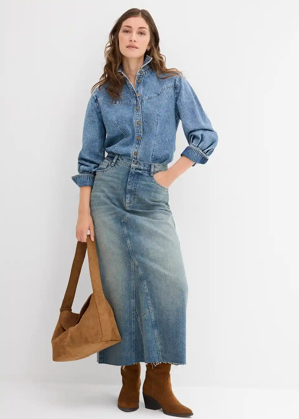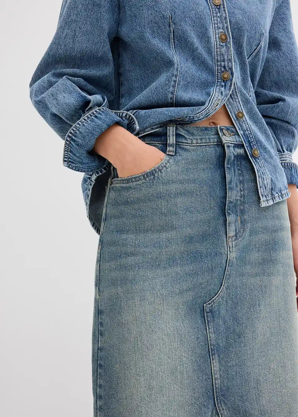 Jeans krilo iz trpežnega bombažnega denima, ki je sprva nekoliko togo, vendar z več nošenji postane mehkejše in bolj sproščeno. To jeans krilo ima zaradi spranega videza moderen used učinek. Rahla izguba barve pri nošenju in pranju je značilnost tega jeans krila. Skupna dolžina pri št. 42 ca. 90 cm, pralno v pralnem stroju.