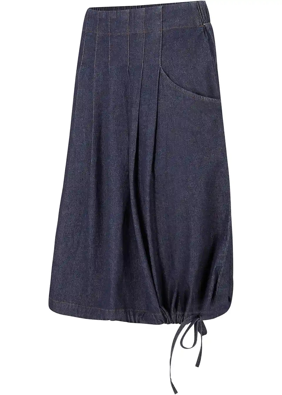 Stretch krilo iz jeansa z ozkimi prešitimi gubami, s trakom za zavezovanje in udobnim pasom
