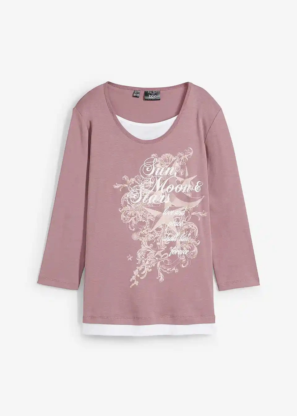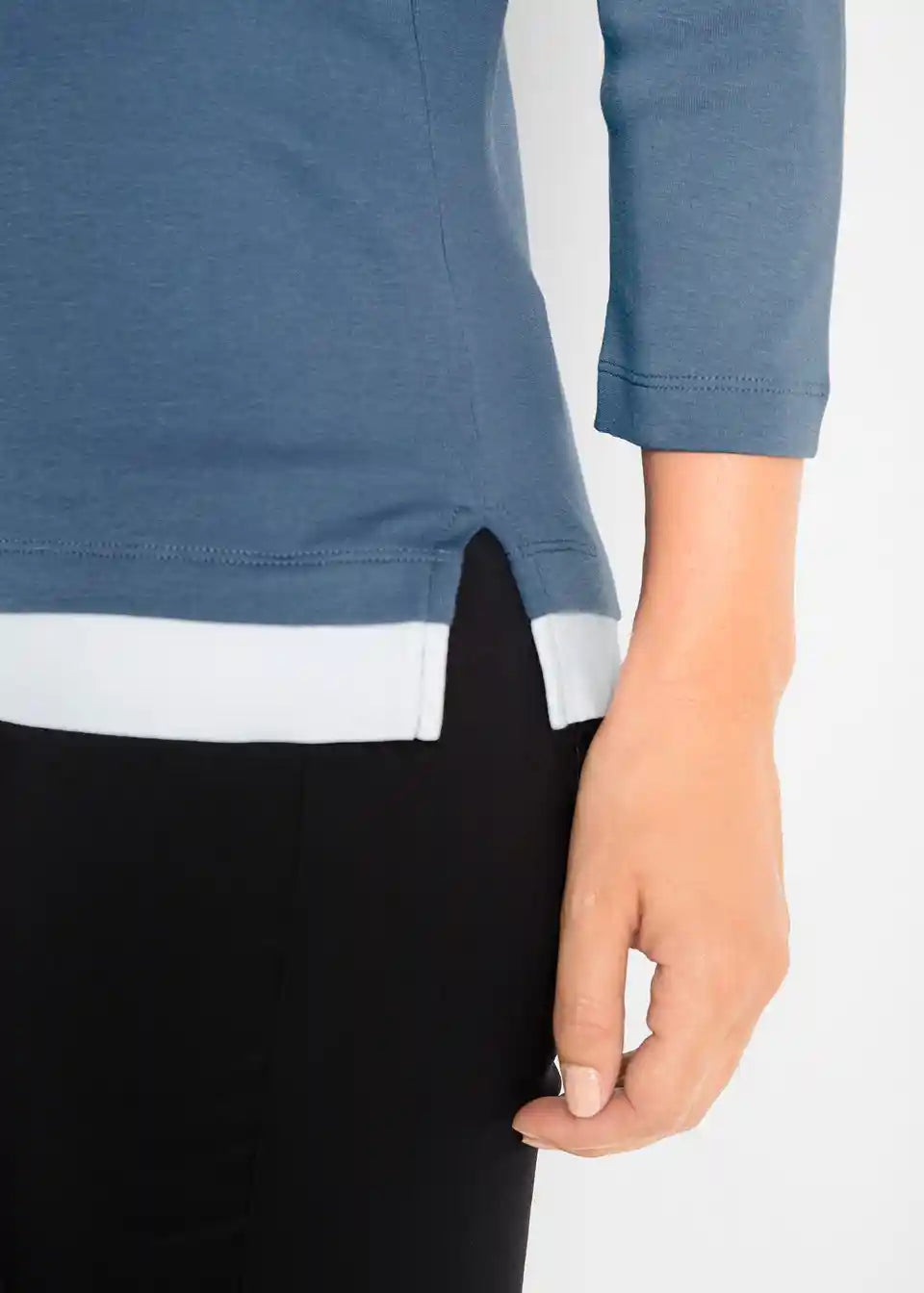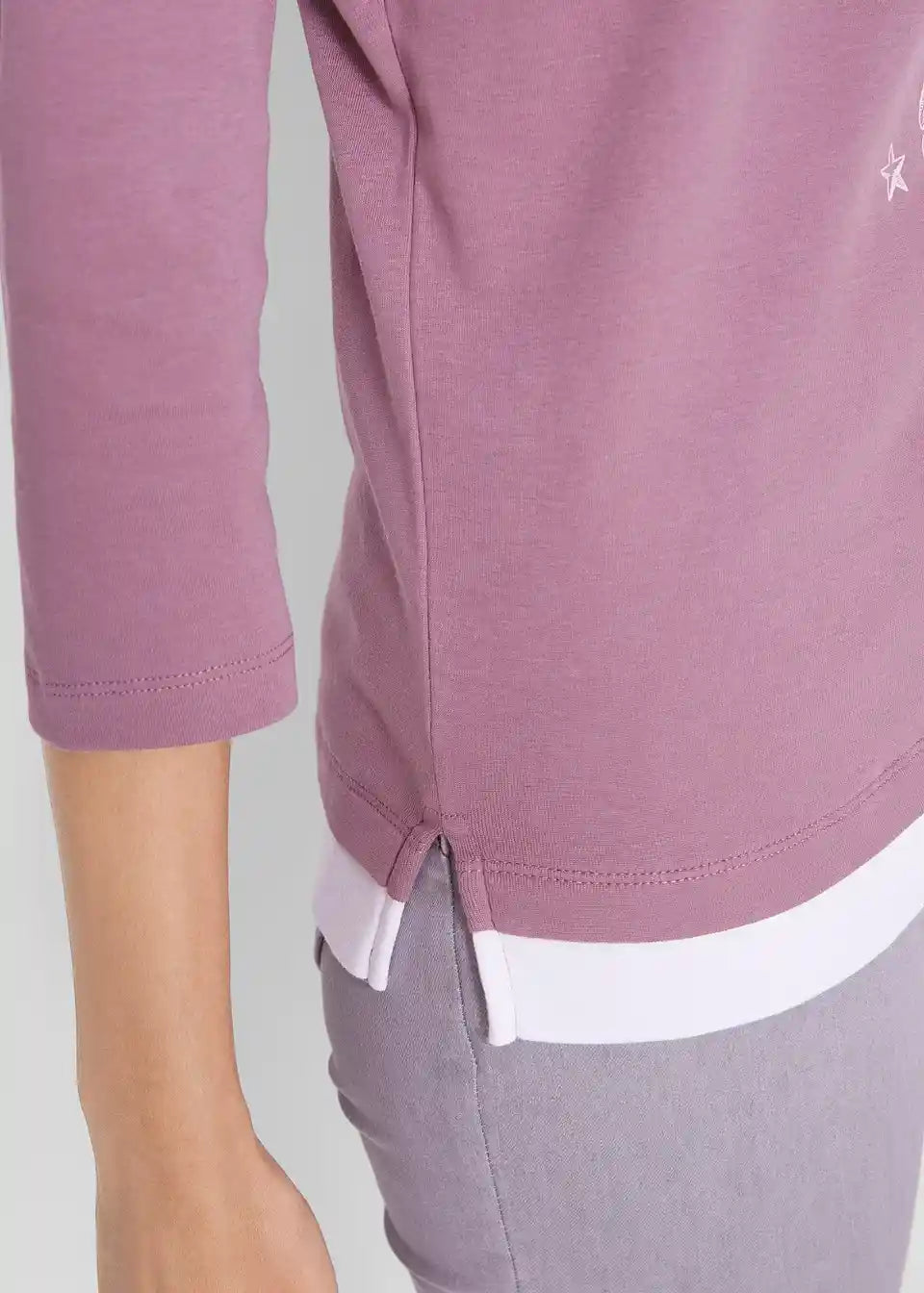 Zahvaljujoč sproščenemu kroju laska 2-v-1 majica s 3/4 rokavi ženskemu telesu. Mehka bombažna tkanina in razporki ob straneh zagotavljajo udobno nošenje zgornjega dela znamke bpc. Čudovita majica navdušuje z atraktivnim dvojnim videzom. Z drugače obarvanimi vložki na izrezu in zaključku deluje model kot dve majici, nošeni ena na drugi. Na sprednji strani velik tisk pritegne pozornost.