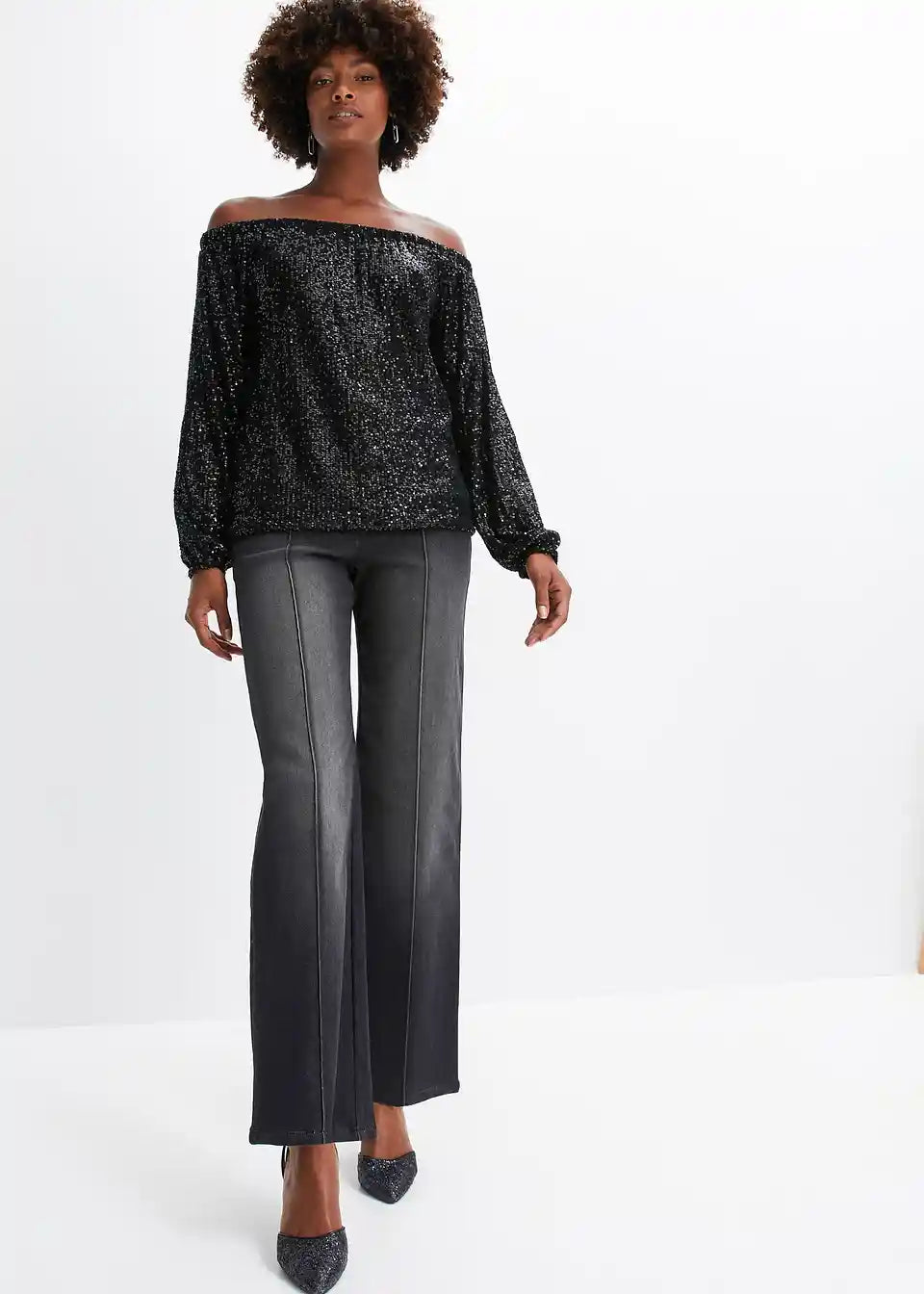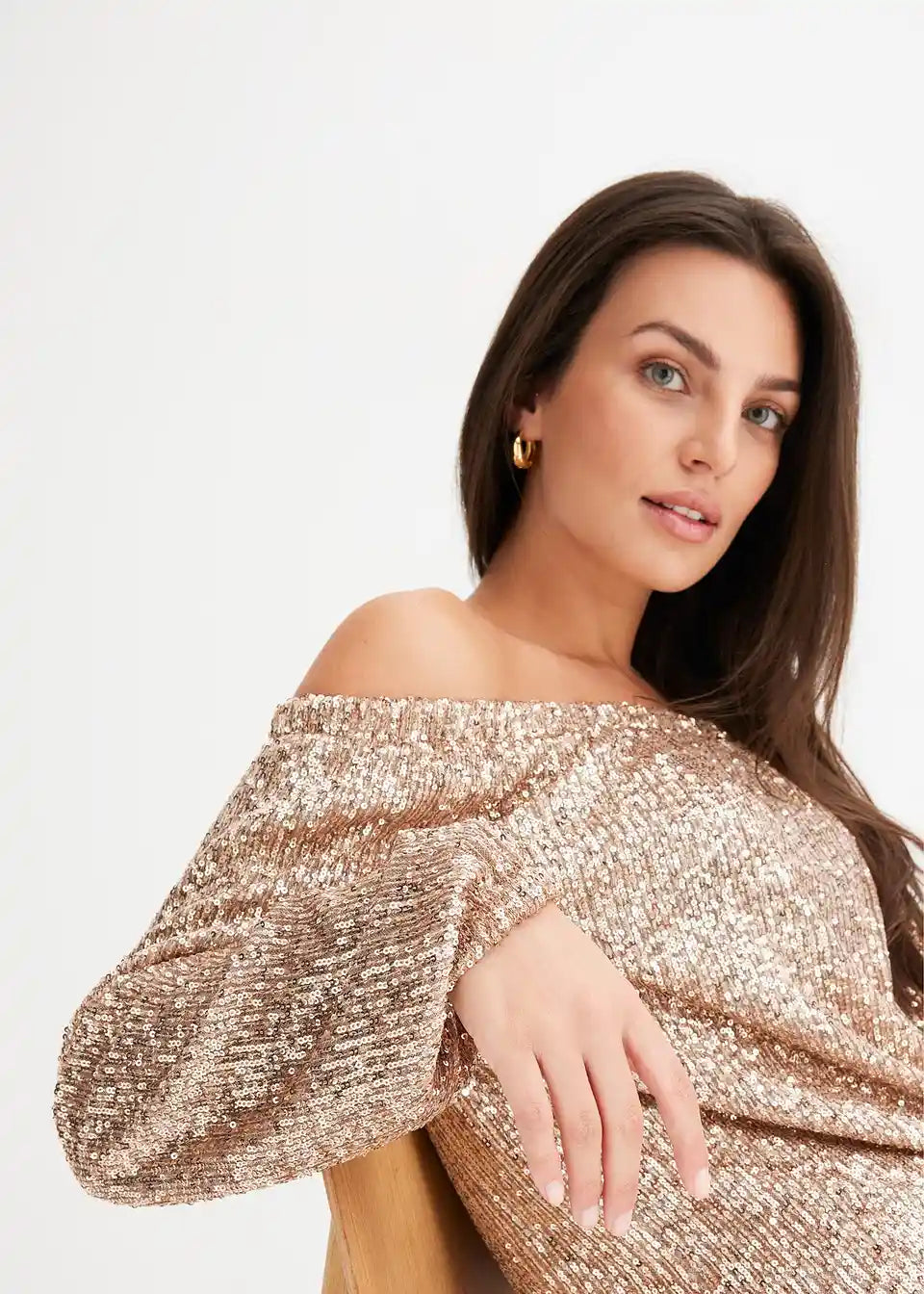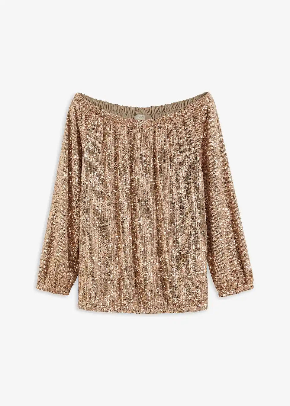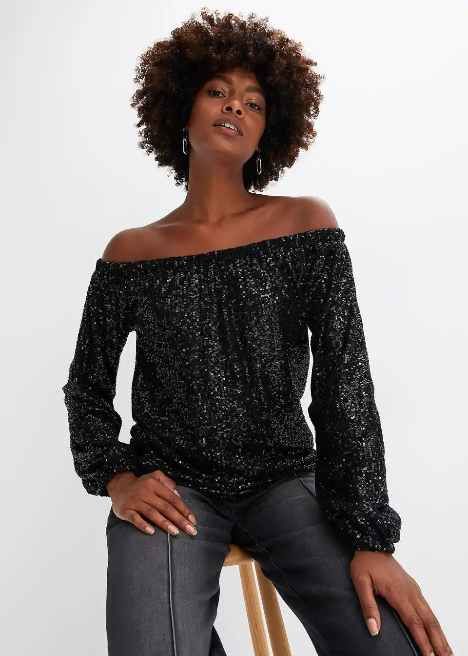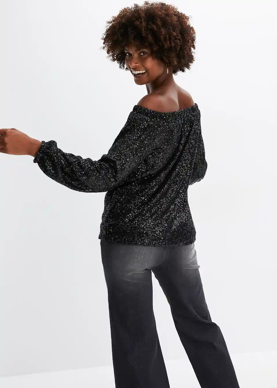 Majica s carmen izrezom v ohlapnem kroju z bleščicami