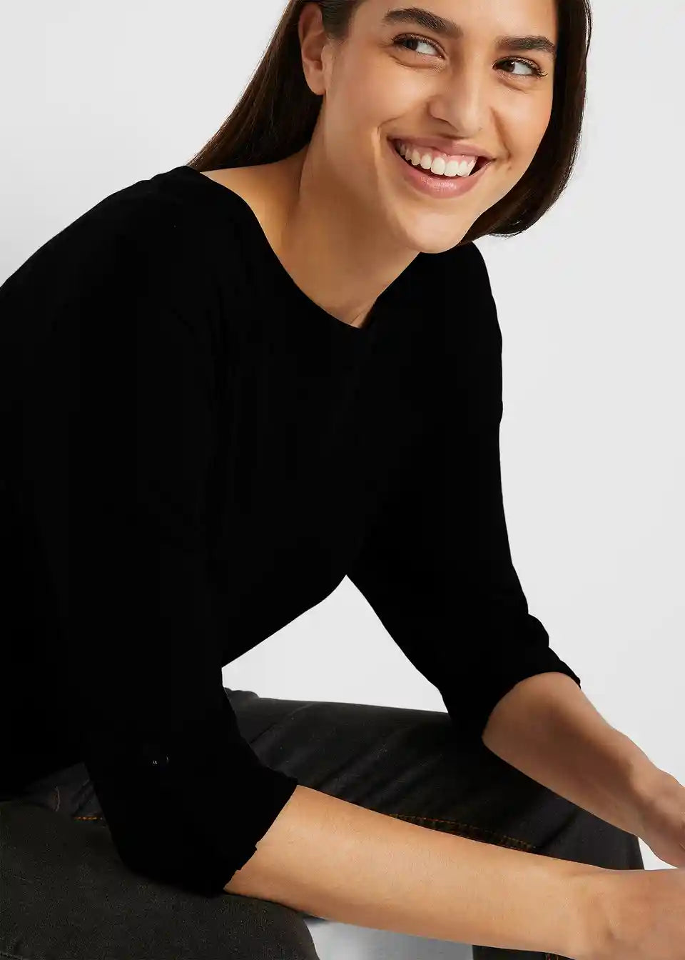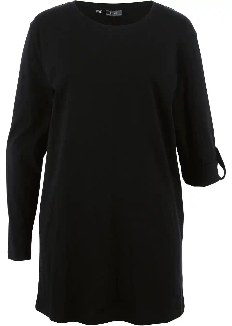Široka dolga majica z dolgimi rokavi z diskretnim okroglim izrezom, z dolgimi rokavi s funkcijo zavihanja in sproščenim krojem.