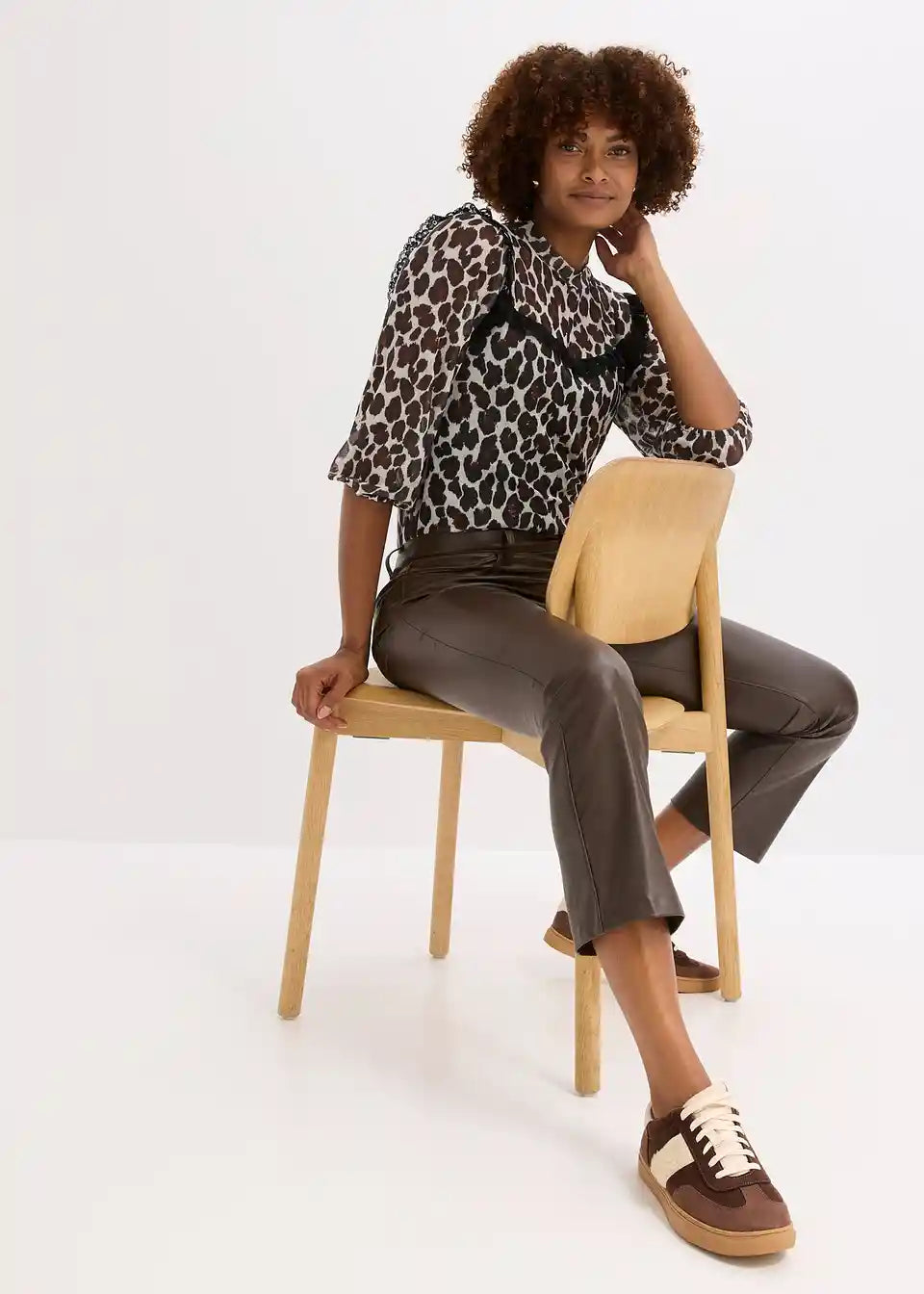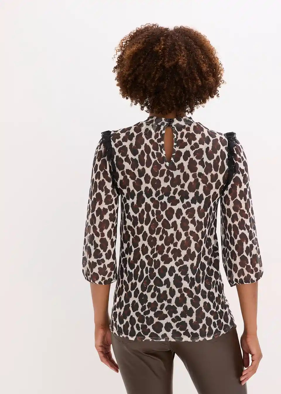 Modno potiskana majica iz mehke mreže z balonastimi rokavi, detajlom iz čipke in podlogo v sprednjem delu