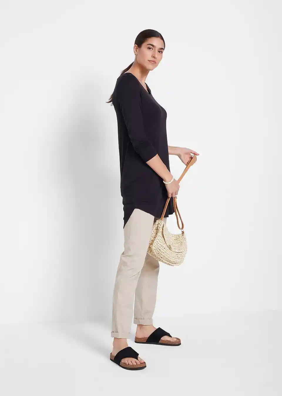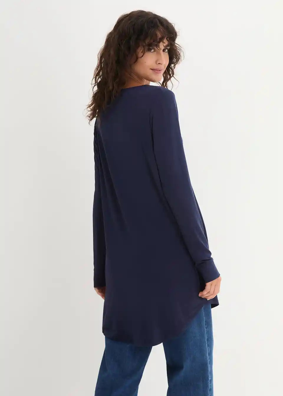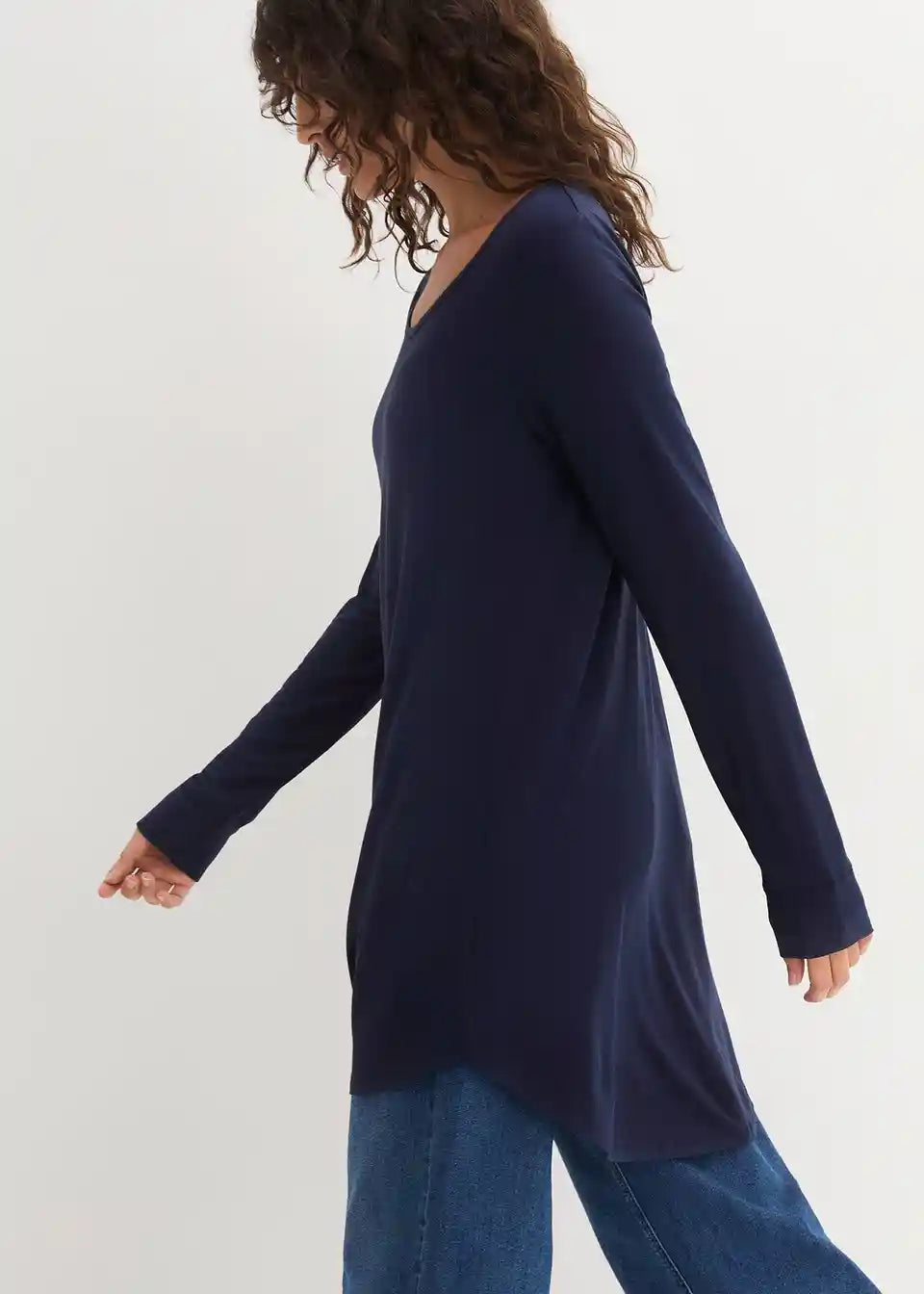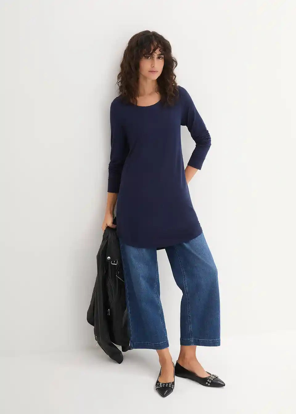 Zahvaljujoč svoji jasni silhueti je dolga majica z dolgimi rokavi vsestransko uporabna. Velik izrez v stilu čolna poudari predel vratu ali pritegne pozornost k nakitu. Izjemno dolg in rahlo oblikovan model iz kolekcije bpc je zadaj daljši kot spredaj. Legice z vzorcem, škornji ter izrazita ogrlica dajejo dolgi majici z dolgimi rokavi modni pridih. Raztegljive kavbojke in superge ji dodajo privlačen vsakodnevni videz. Za visok faktor udobja poskrbi kombinacija z grobo pletenim jopičem.