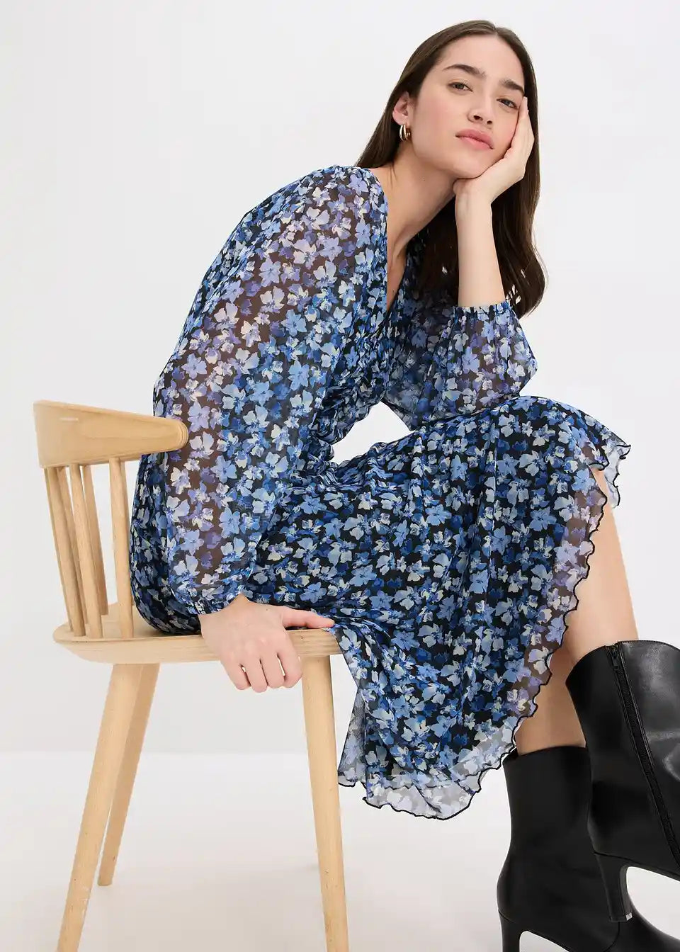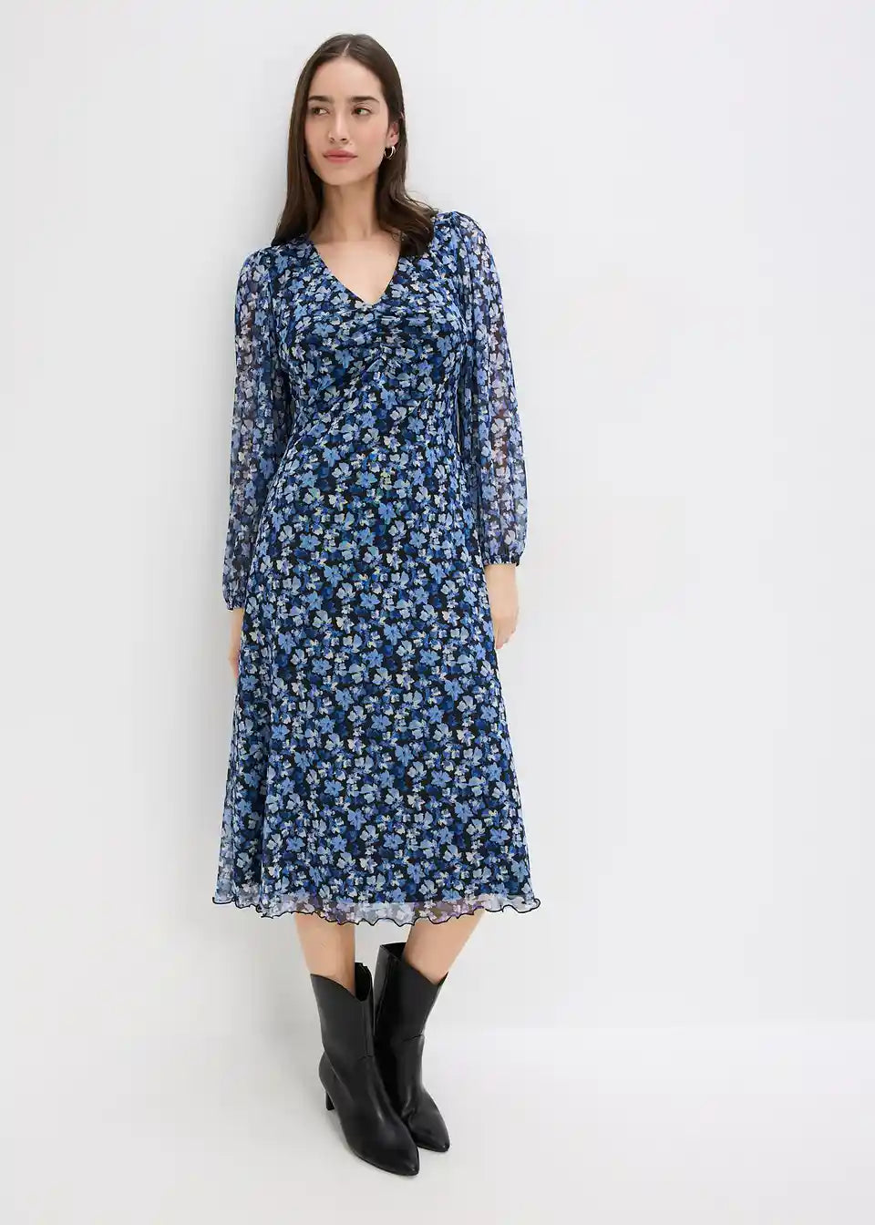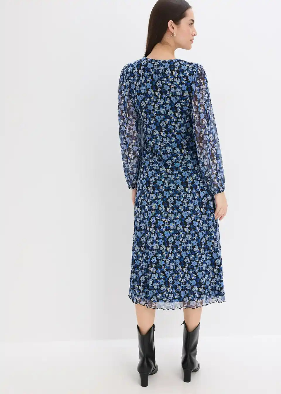 Ženstvena mrežasta midi obleka z naborki spredaj