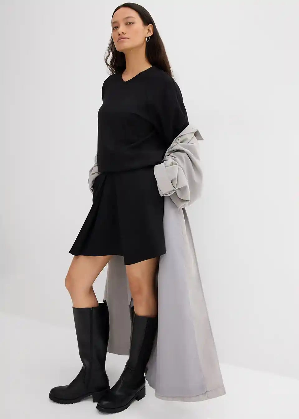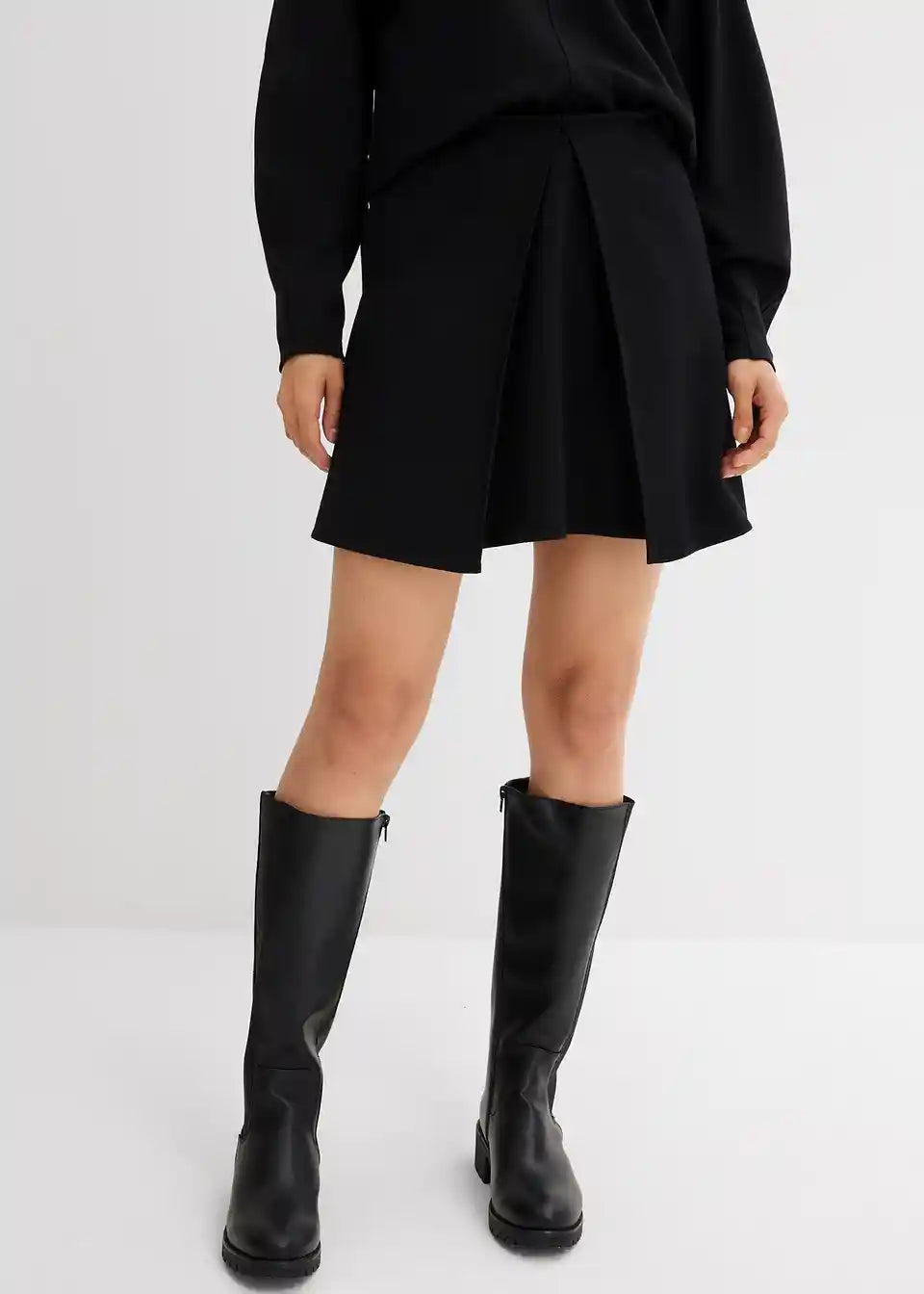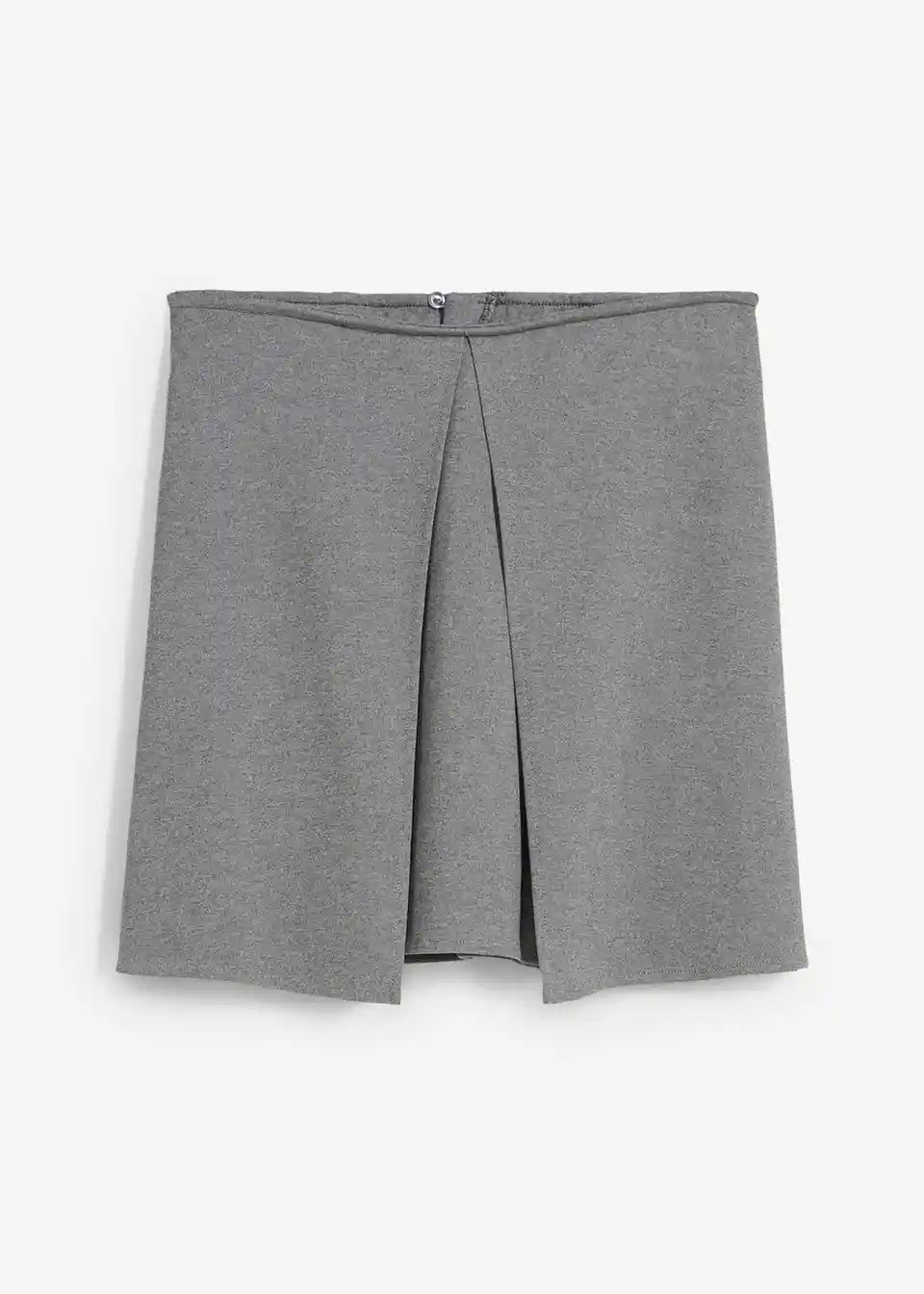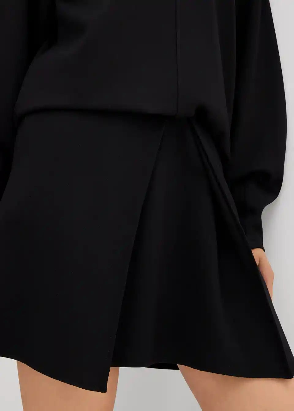 Spodaj razširjeno mini krilo z dvojno zunanjo gubo na sprednji strani in zapenjanjem z zadrgo zadaj
