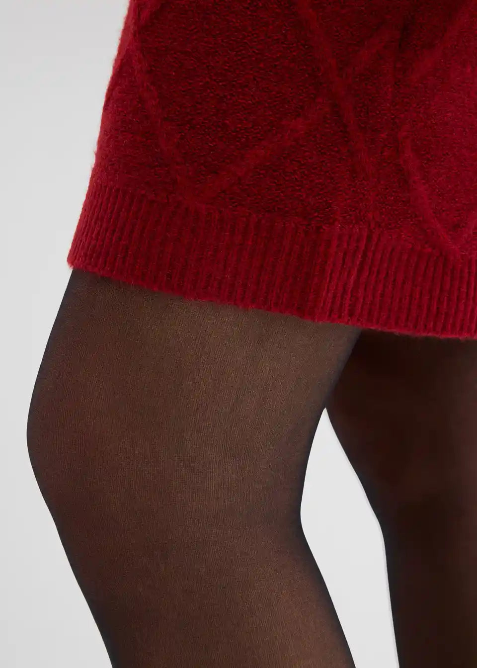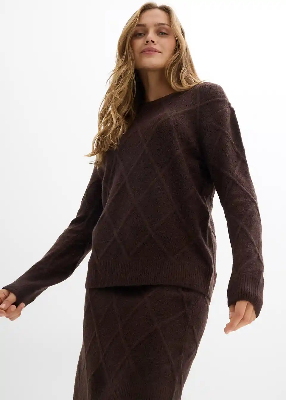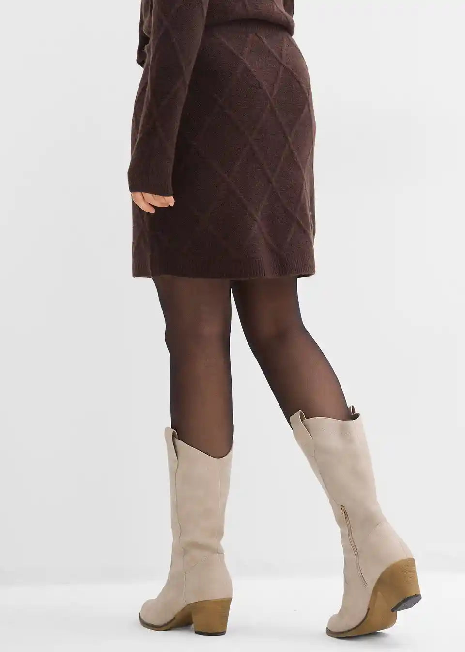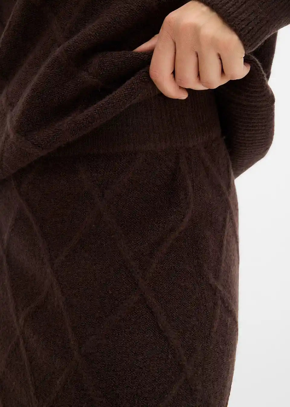 Udobno pleteno krilo iz kitaste pletenine. Visok krojena model z rebrasto pletenino v pasu in na spodnjem robu.