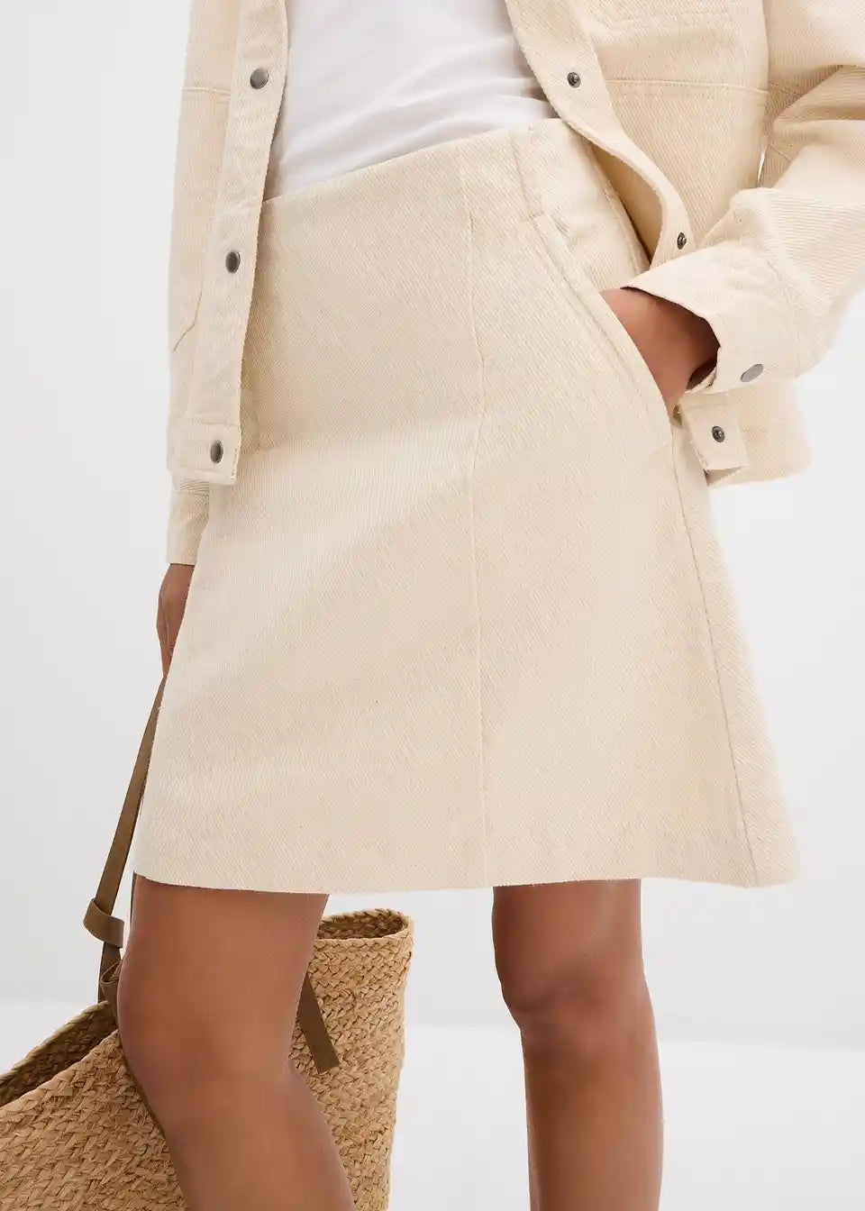 Kratko twill krilo z barvno usklajenimi delilnimi šivi ter stranskimi všitimi žepi