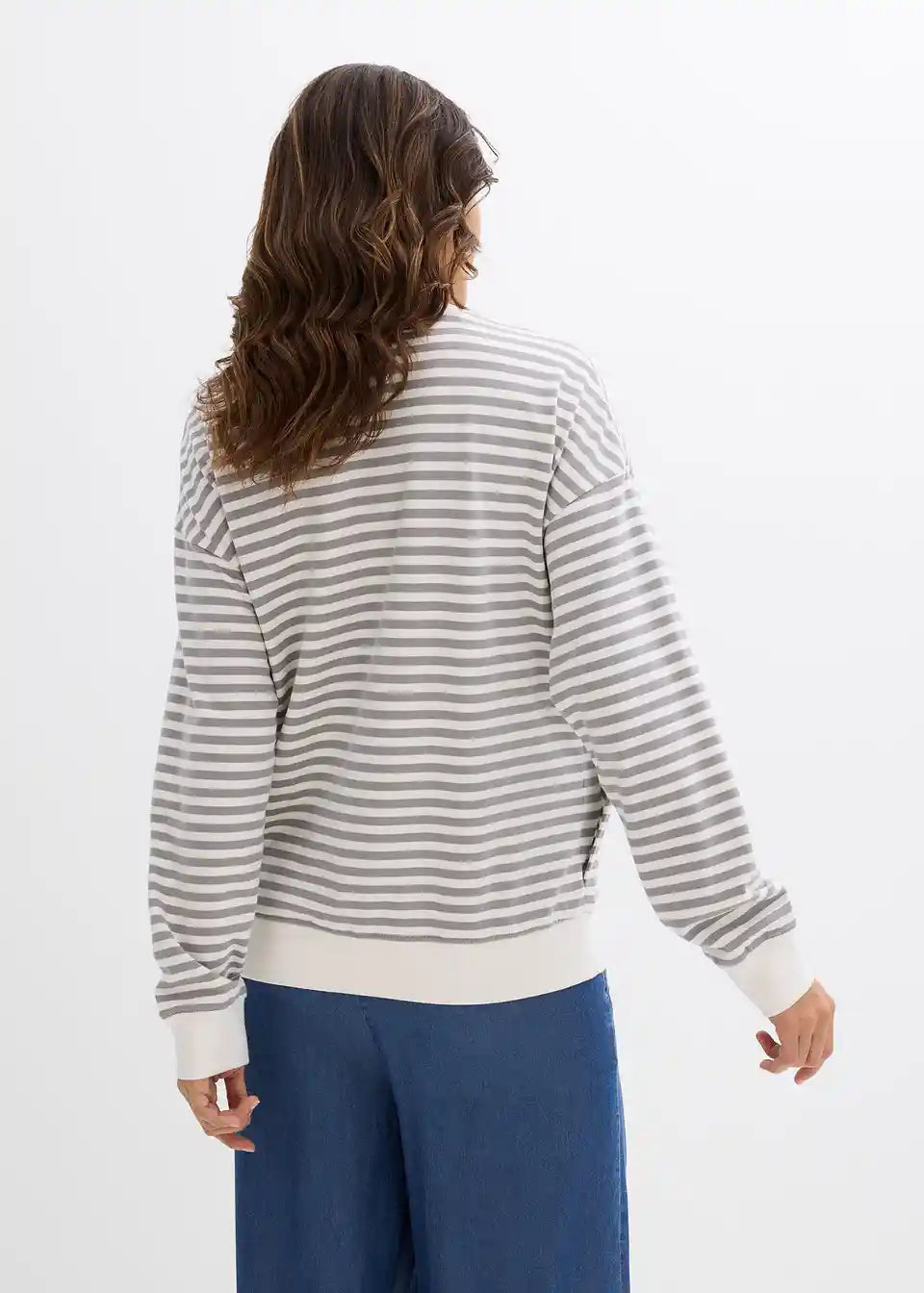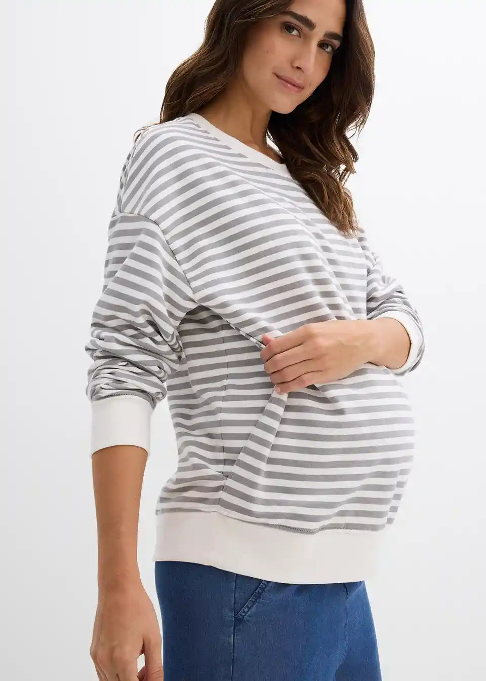 Majica iz ekološkega bombažnega trikoja z rahlo kosmateno notranjostjo. Nevpadljive odprtine na obeh straneh omogočajo preprosto in diskretno dojenje. Majica iz trikoja je primerna za nošenje tako med nosečnostjo kot tudi po njej.