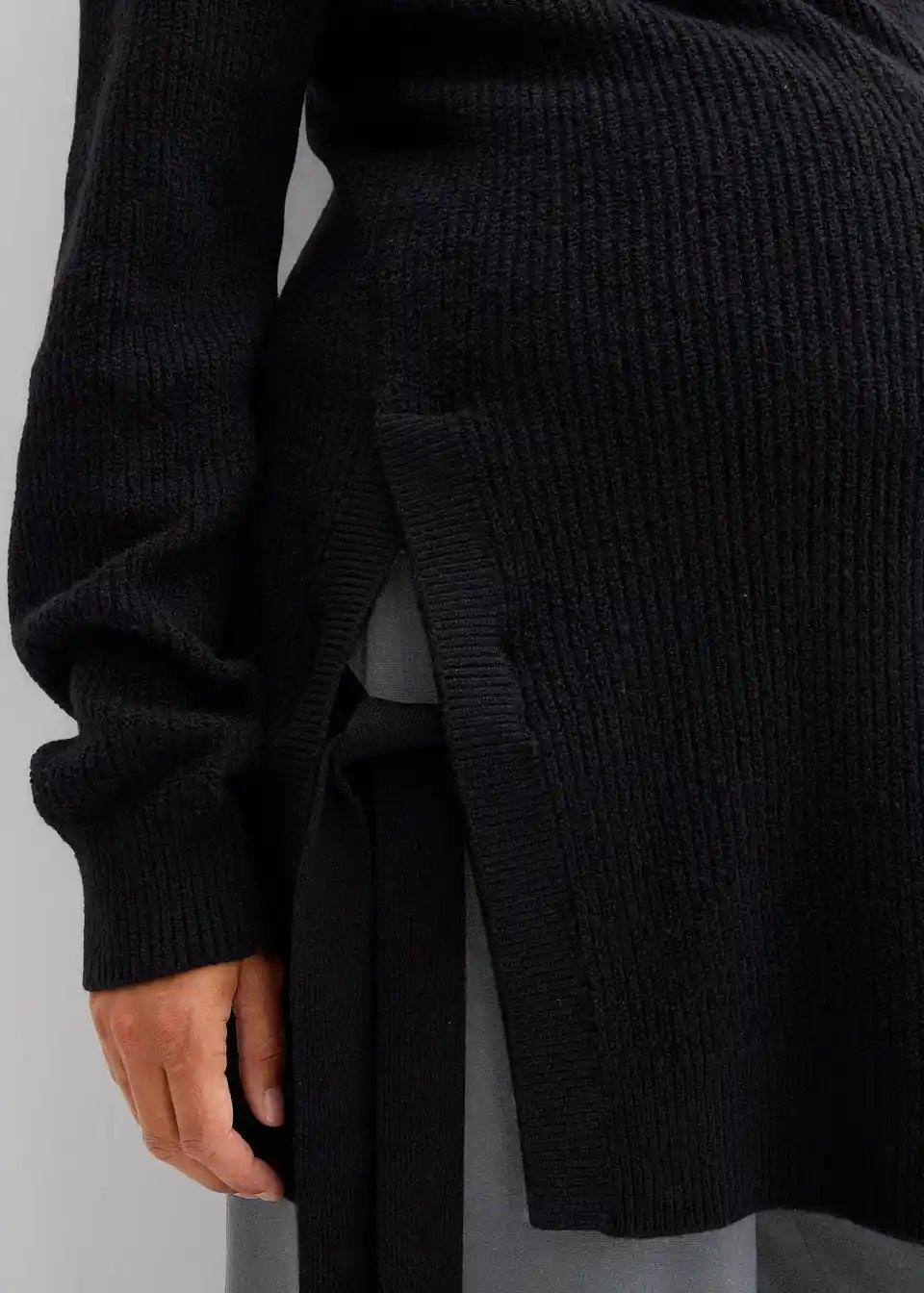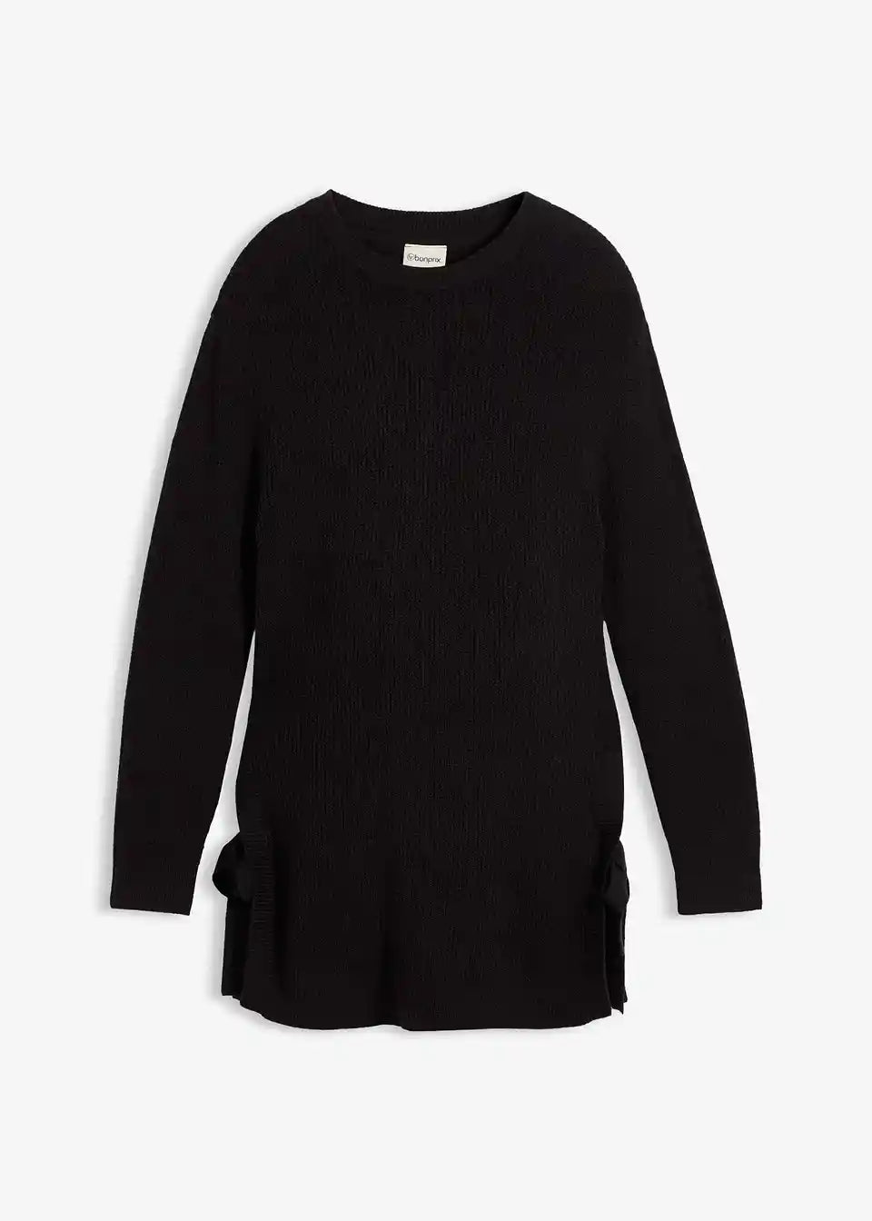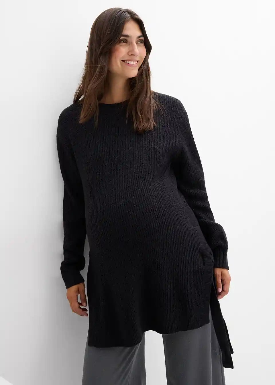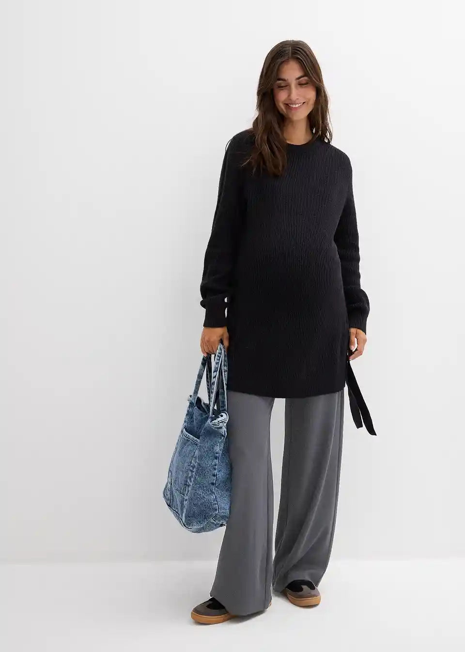 Mehko kosmat pulover za nosečnice s praktičnimi odprtinami za dojenje in dekorativnimi trakovi. Zaradi dolžine, ki sega čez boke, se vsestransko kombinira z legicami, hlačami ali kavbojkami.