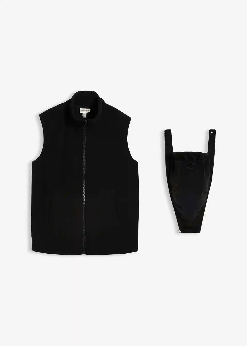 Funkcijski telovnik s stoječim ovratnikom in vložkom za nošenje dojenčka. Vložek za dojenčka ima majhno oporo za glavo z nastavljivo vrvico. Telovnik ima nastavljive vrvice na robu, da se širina prilagodi posameznemu mesecu nosečnosti. Z žepi na sprednji strani. Brez vložka ga lahko nosite kot običajen brezrokavnik.