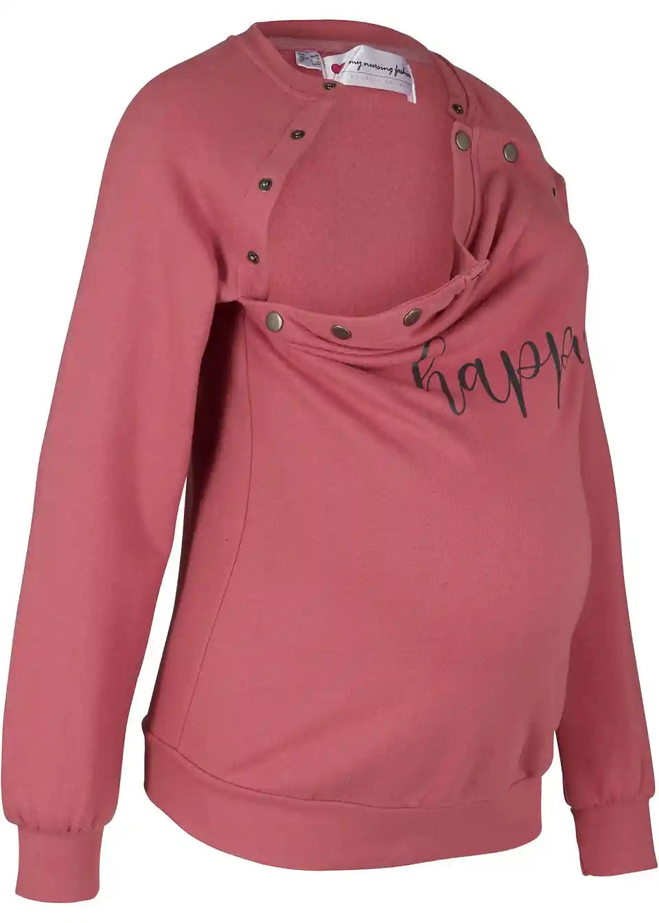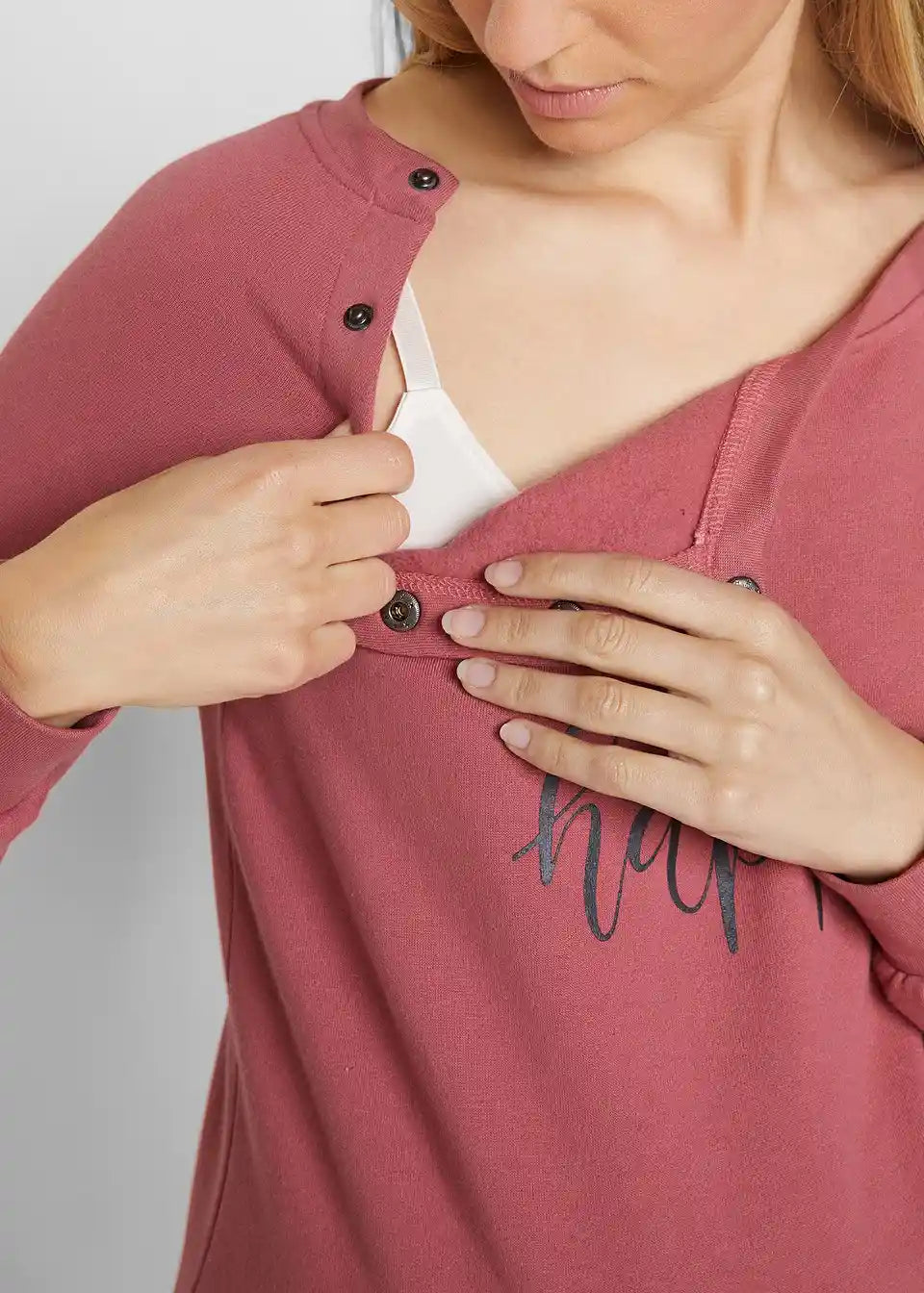 Udobna majica iz mehke bombažne mešanice z rahlo brušeno notranjo stranjo. Pritrdilni gumbi na zgornjem delu omogočajo enostavno in diskretno dojenje. Mehke rebraste manšete na rokavih, robu in izrezu zagotavljajo prijetno udobje pri nošenju. Idealen za nosečnost in obdobje dojenja.