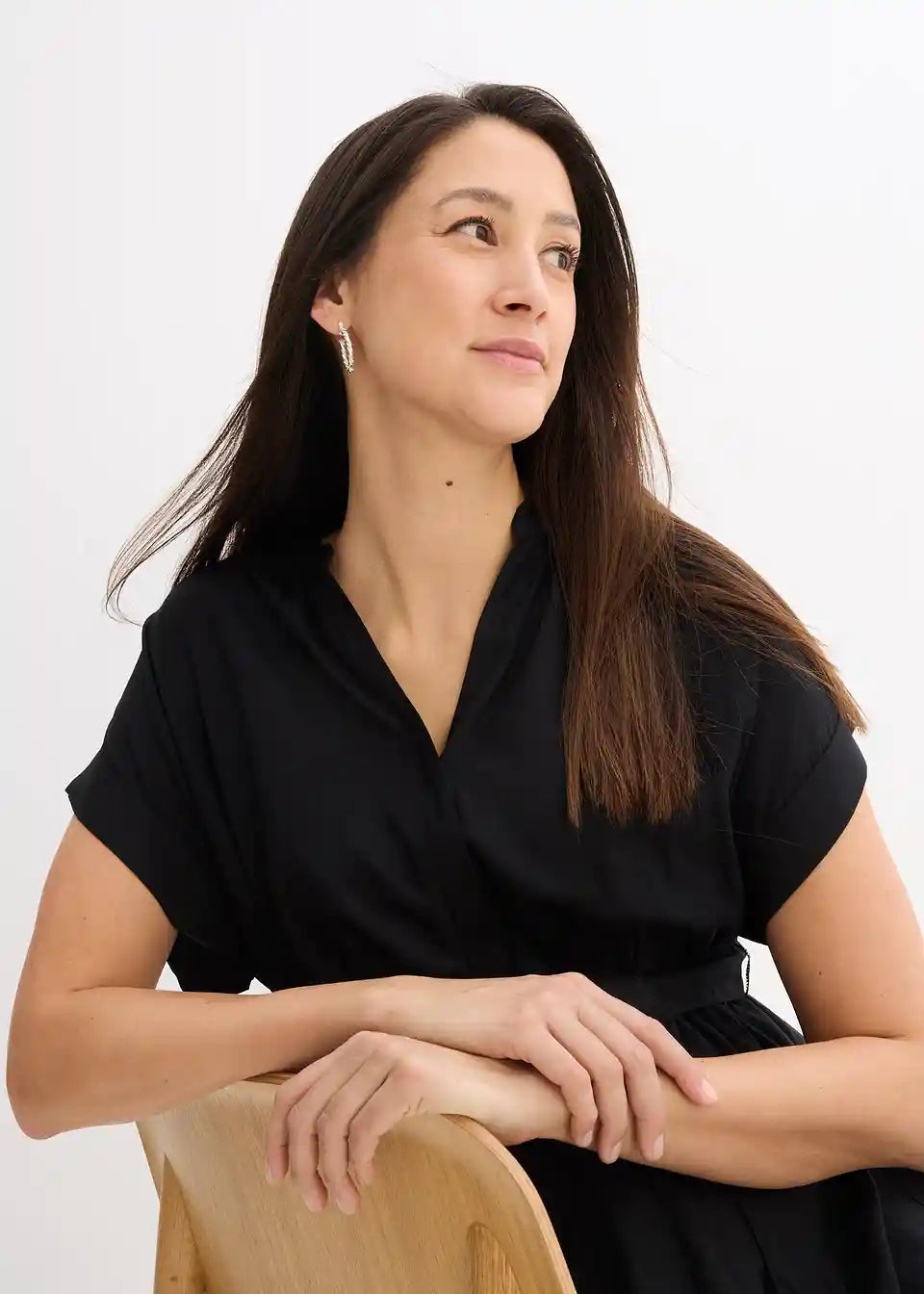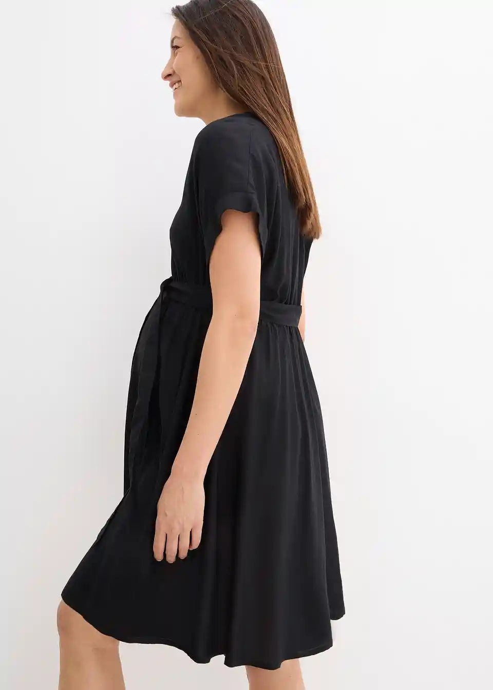 Srajčna obleka iz viskoze z gumbi po celotni dolžini in skritim zapenjanjem, segajoča nad koleni. Ima srajčni ovratnik, spuščen ramenski del in udobne, zračne netopirske rokave. Širok, snemljiv pas poudari rastoči trebušček in omogoča individualno prilagajanje širine.