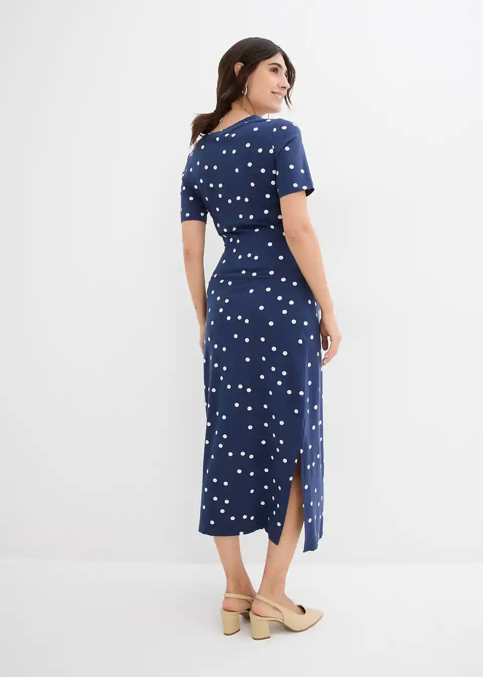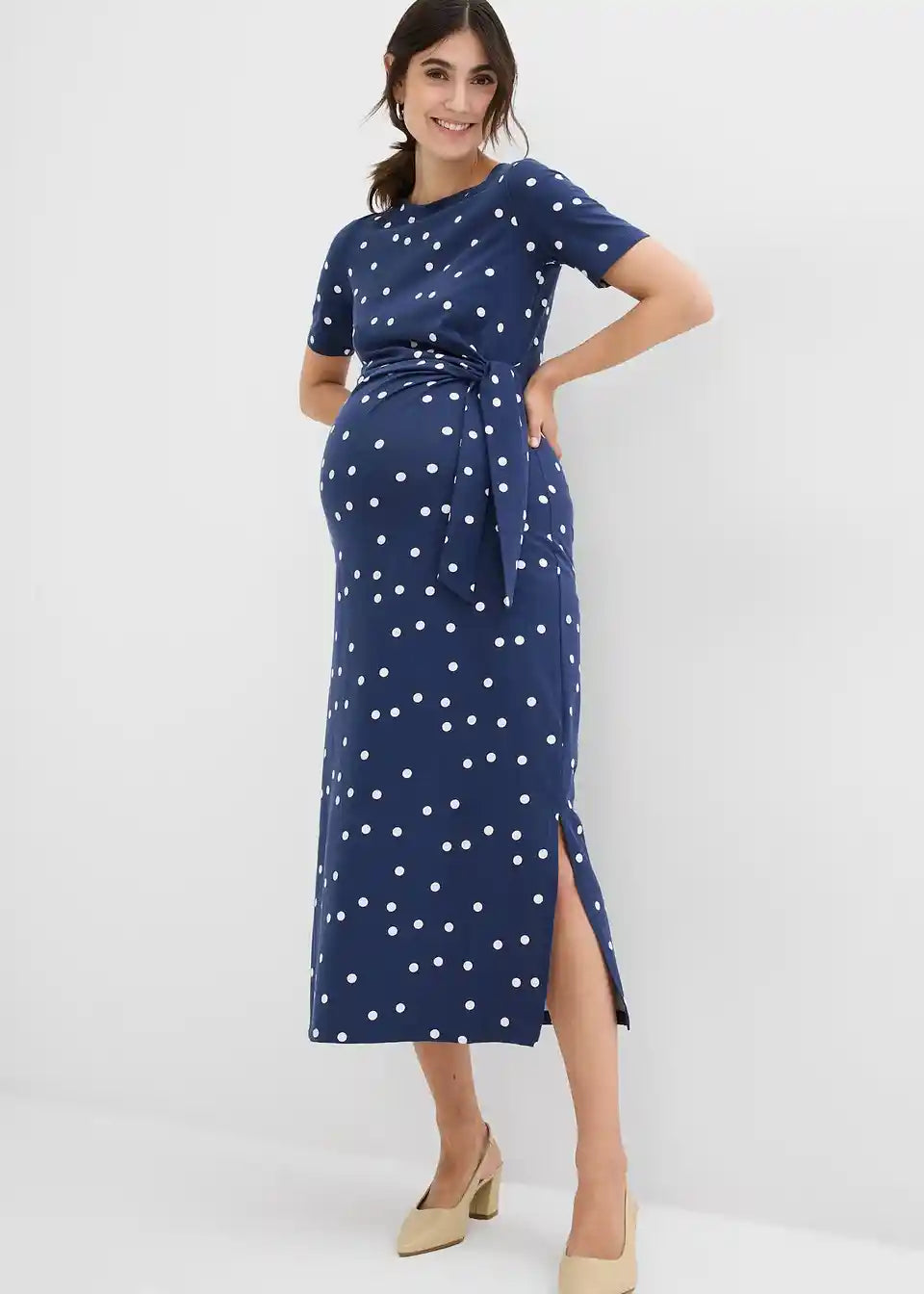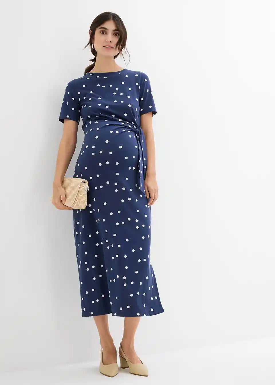 Mehka jersey nosečniška obleka iz organskega bombaža z okroglim izrezom in kratkimi rokavi v laskavi dolžini. Poletna obleka ima prikupen pikčast vzorec in stranske razporke na robu. Dekorativen vozel poudari čudovit nosečniški trebušček.