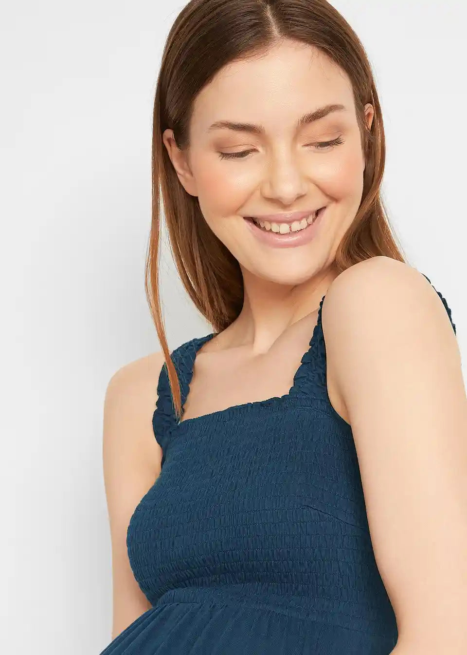 Kratka nosečniška obleka z nabranimi naramnicami in prsnim delom. Nabrani deli zagotavljajo dodatno elastičnost, imperijski kroj pa omogoča trebuhu dovolj prostora za rast.