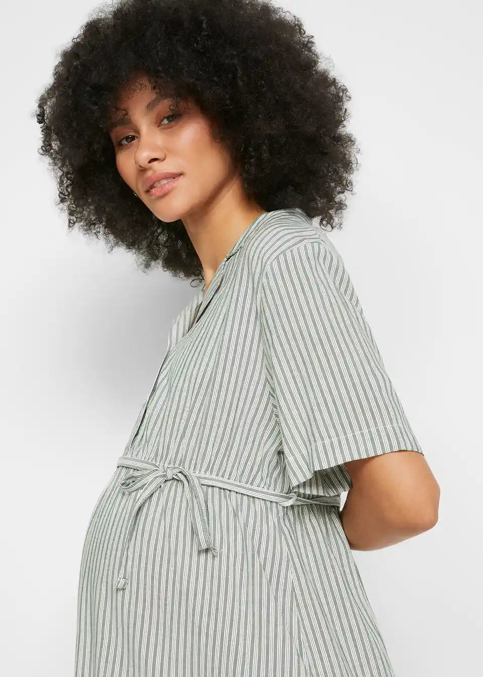 Ta oblačilna in dojenjska bluzasta obleka z zavezovalnim pasom združuje udobje in eleganco na čudovit način. Ohlapen kroj se prilagaja rastočemu nosečniškemu trebuščku in zagotavlja udobno prileganje med nosečnostjo. Zavezovalni pas je mogoče individualno prilagoditi in poudari pas, medtem ko stiliziran dizajn s sprednjimi gumbi omogoča diskretno dojenje tudi po porodu. Izdelana iz mehkih, lahkih materialov, je obleka popolna za tople dni in primerna tako za vsakodnevne kot posebne priložnosti.
