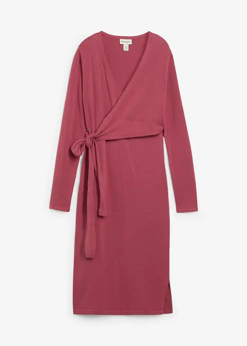 Srednje dolga pletena obleka iz čistega, zračna iz ekološkega bombaža z V-izrezom s trakci za zavezovanje za individualno nastavitev širine, zagotavljajo laskavo silhueto in naredijo obleko primerno tudi po nosečnosti. Kroja omogoča enostavno dojenje ter udobno oblačenje in slačenje. Ekstra dolgi rokavi in majhni stranski razporki na spodnjem robu dopolnjujejo dizajn.