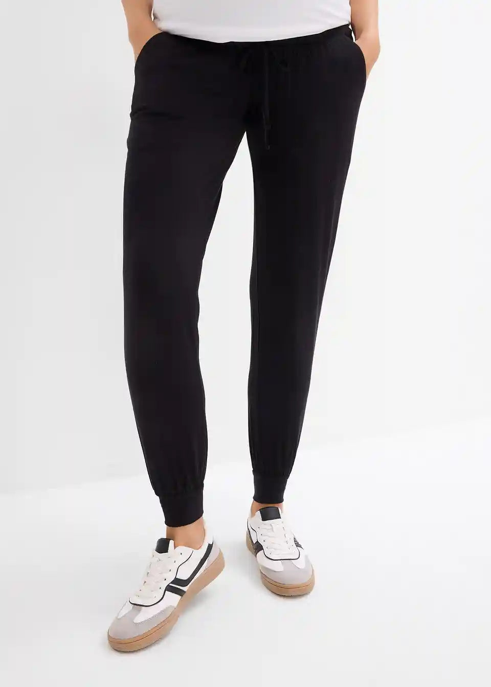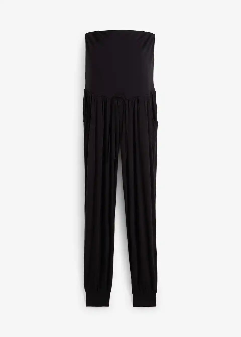 Hlače iz certificirane viskoze z ravnim krojem hlačnic in elastičnim robom. Širok zavihni pas zagotavlja udobno prileganje med nosečnostjo in po njej.