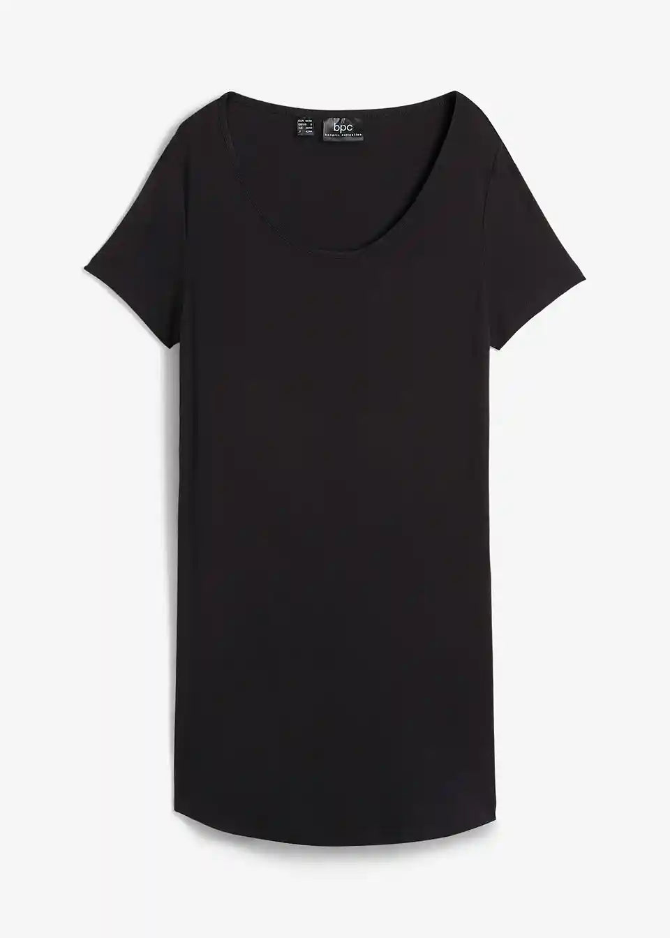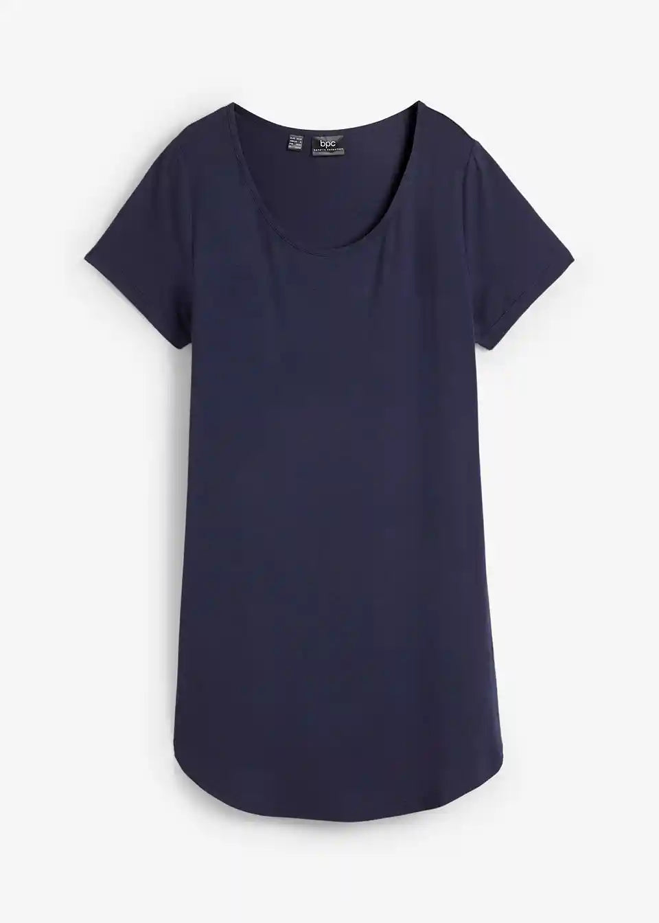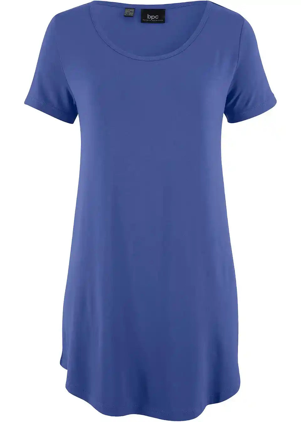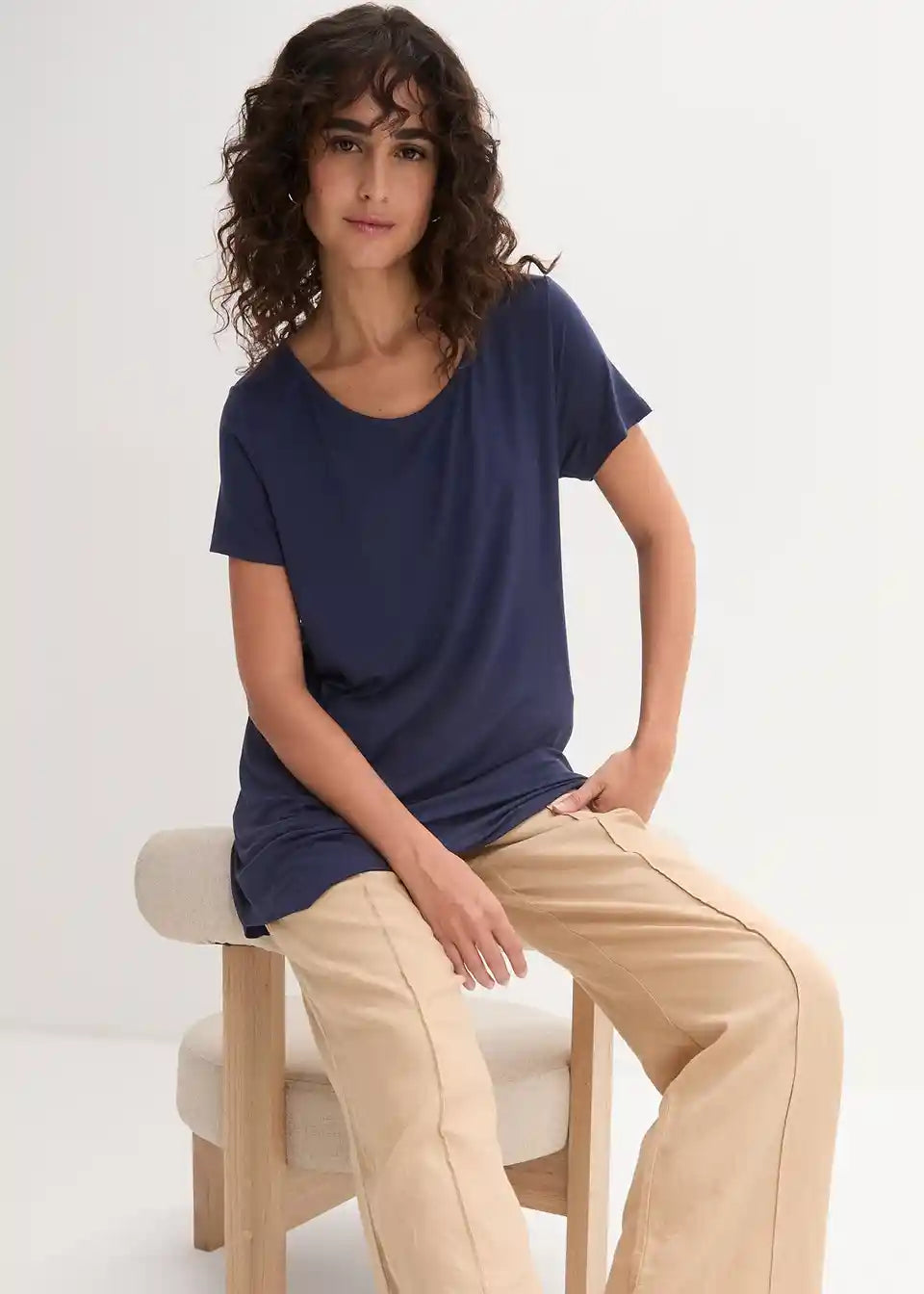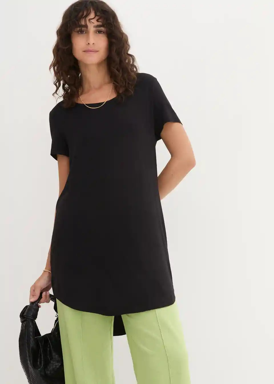 Super udobna in vsestransko kombinirajoča je ta modna dolga majica s kratkimi rokavi in okroglim izrezom. Praktični univerzalni kos v prijetni materialni kakovosti navdušuje z zaobljenim robom, ki je zadaj nekoliko daljši. Čudovita majica blagovne znamke bpc je krojena oprijeto in se odlično kombinira z legicami, nogavicami ali oprijetimi hlačami.