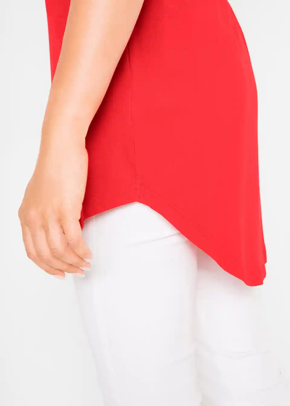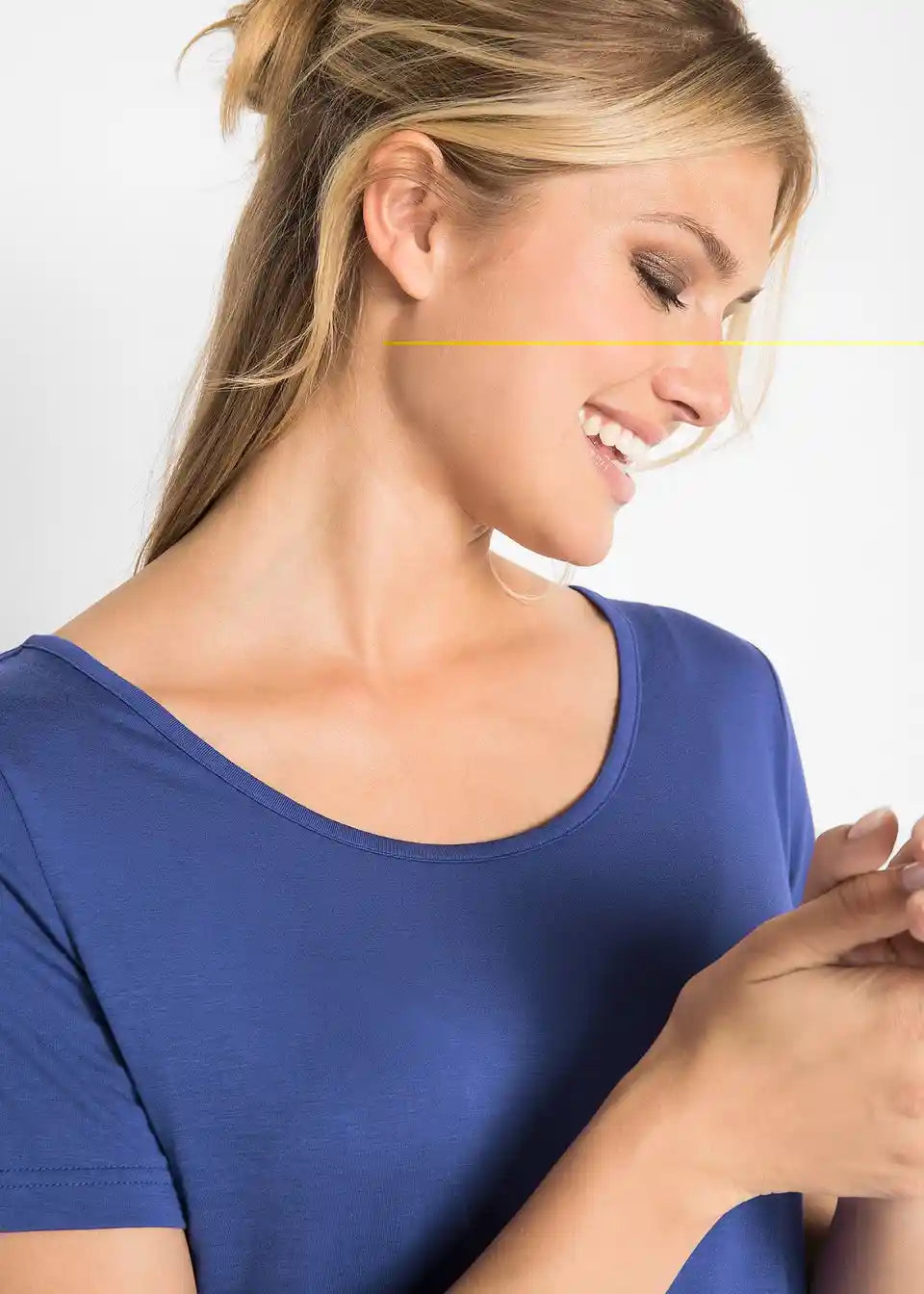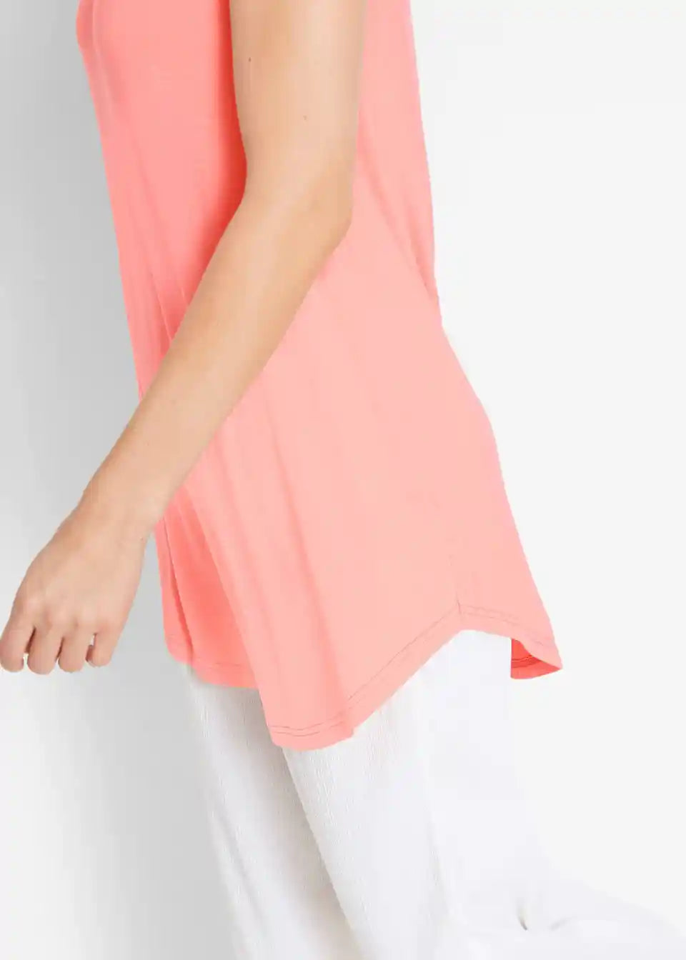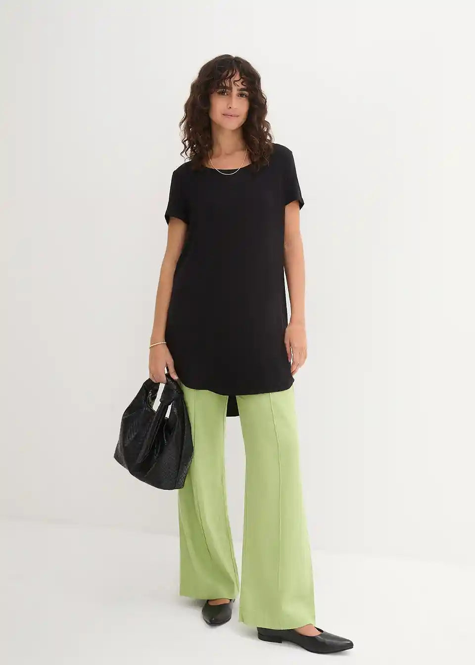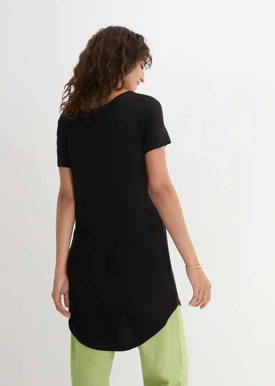 Super udobna in vsestransko kombinirajoča je ta modna dolga majica s kratkimi rokavi in okroglim izrezom. Praktični univerzalni kos v prijetni materialni kakovosti navdušuje z zaobljenim robom, ki je zadaj nekoliko daljši. Čudovita majica blagovne znamke bpc je krojena oprijeto in se odlično kombinira z legicami, nogavicami ali oprijetimi hlačami.