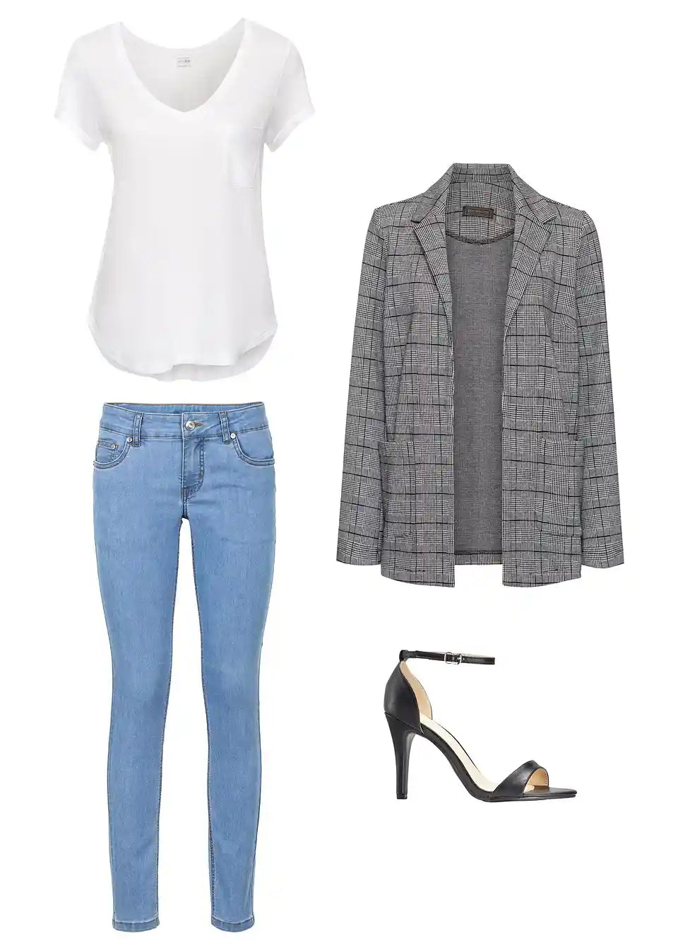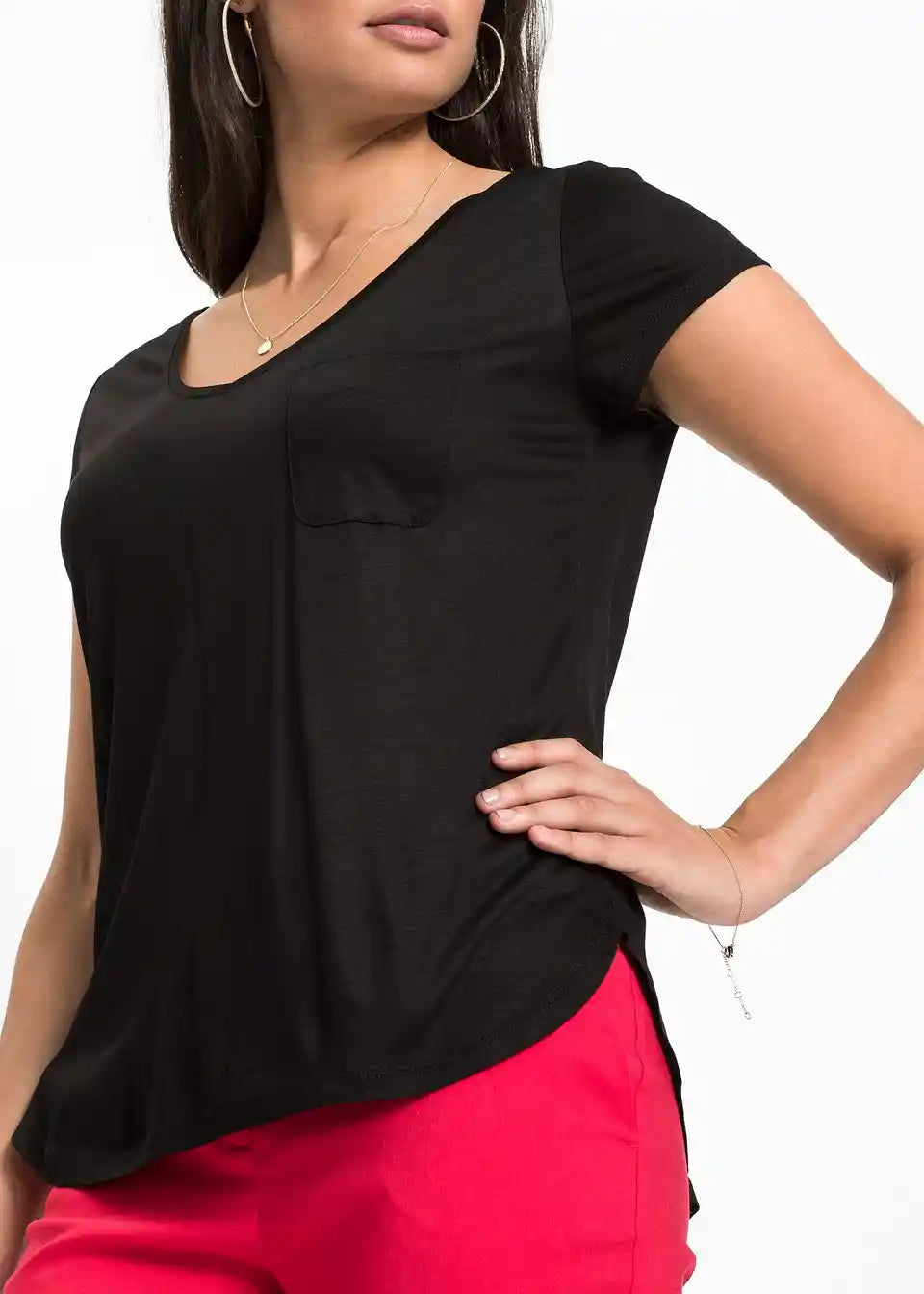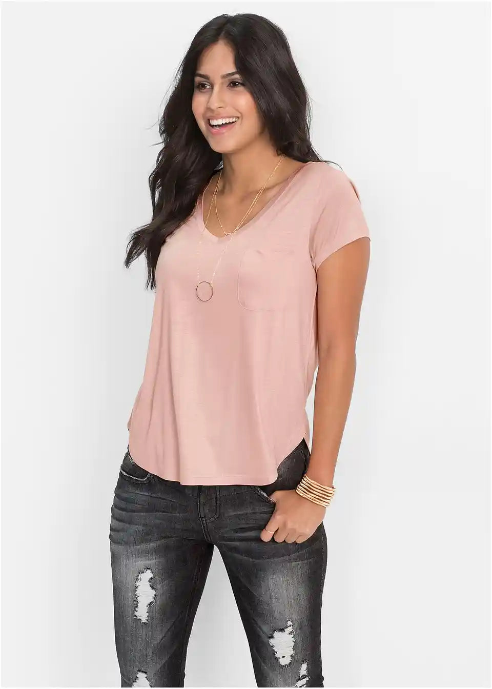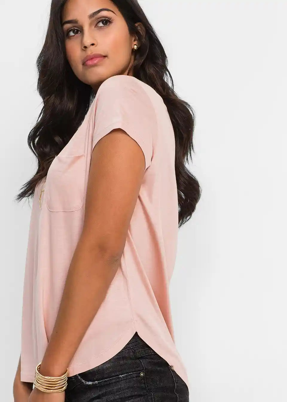 Lepa majica z rahlo sijajnim materialom, diskretnim V-izrezom, zaobljenim robom in majhnim prsnih žepom. Dolžina v velikosti 36/38 pribl. 64 cm.