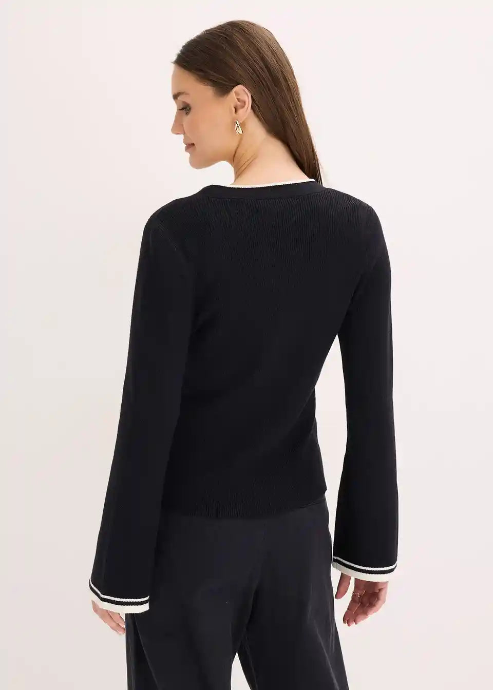 Moderna pletena jopa z zapovedanimi kontrastnimi obrobami in kakovostnimi gumbi