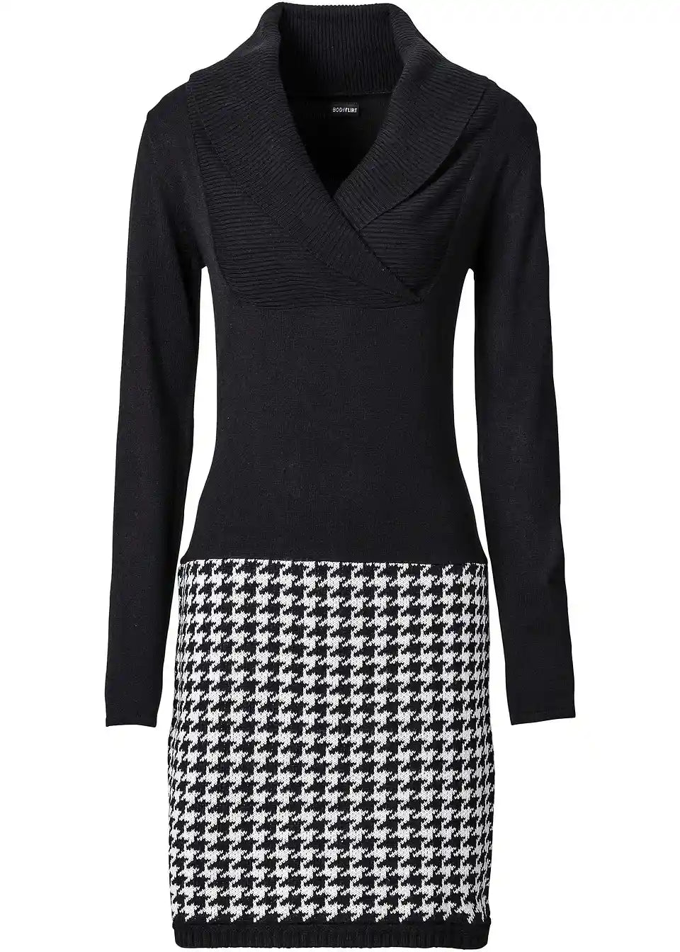 S to obleko boste v pisarni prav tako elegantno oblečeni kot v vsakdanjem življenju. Ženska pletena obleka znamke BODYFLIRT ima spodnji del izdelan z vzorcem. Dolgi rokavi zgornjega dela krasijo čudovit zavihan ovratnik v rebrastem videzu, ki očara z atraktivnim V-izrezom in poudarja dekolte. Ozek kroj privlačno oblikuje žensko postavo.