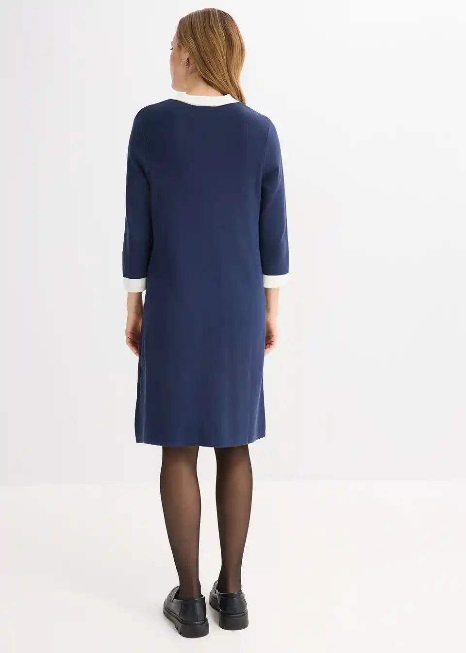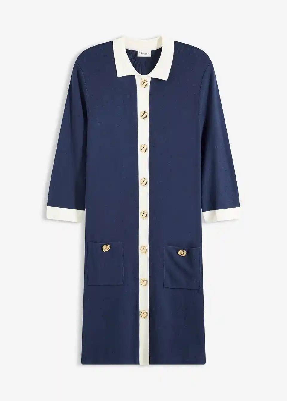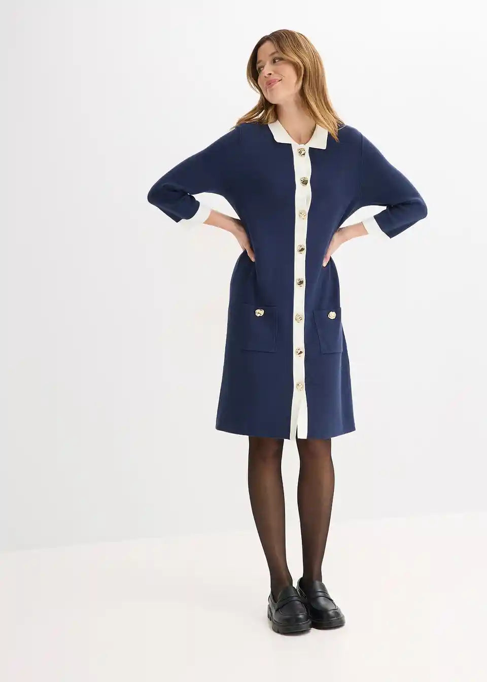 Modna pletena obleka z okrasnimi gumbi