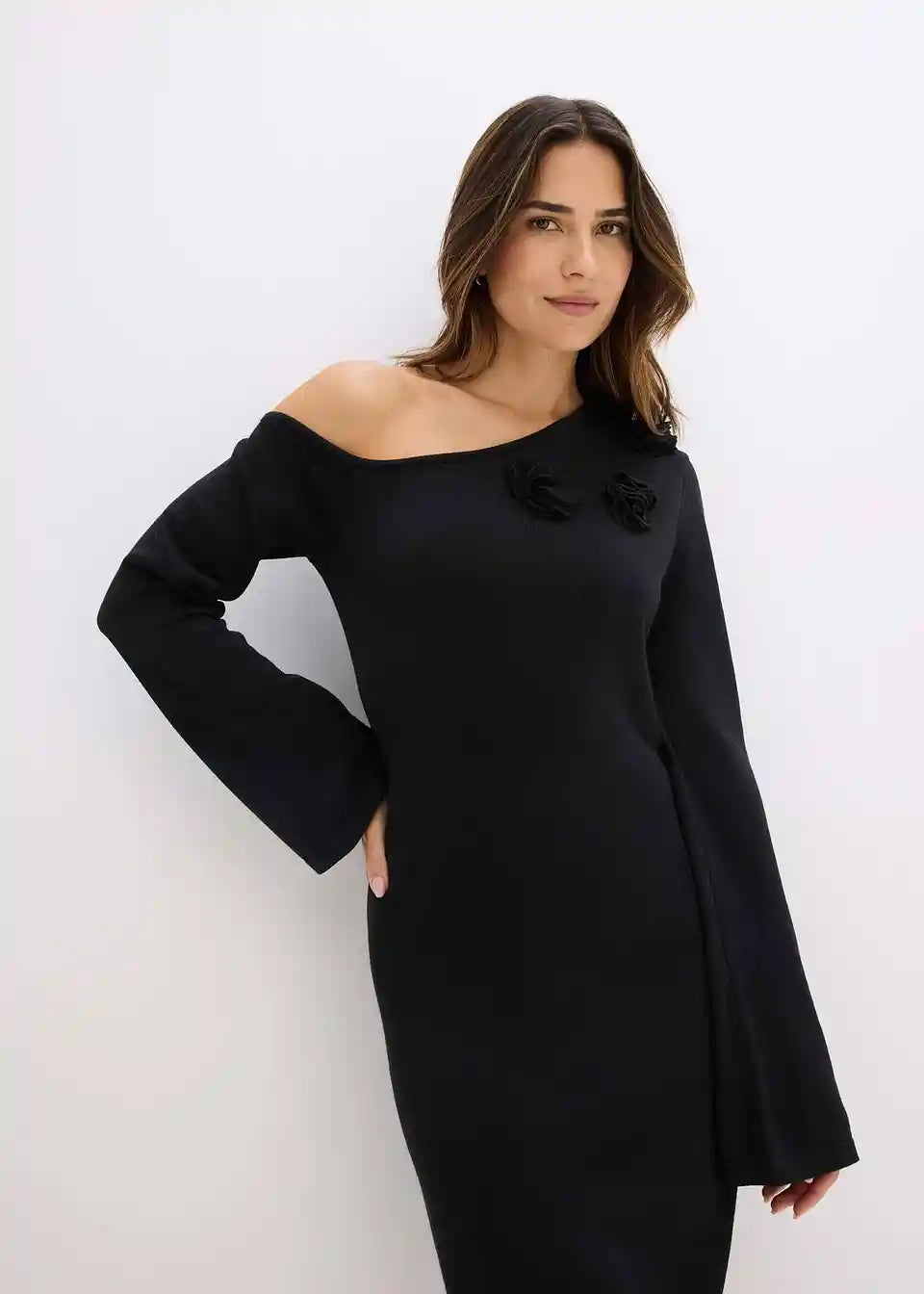 Pletena obleka s cvetlično aplikacijo
