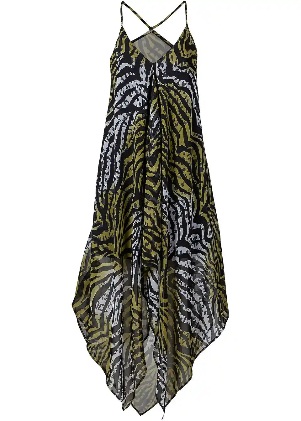 S to lahkotno, zračno plažno obleko so elegantne dame ob morju optimalno oblečene.Privlačna obleka iz aktualne kolekcije bpc selection posebej očara s svojim prefinjenim krojem: Ima globok V-izrez, naramnice, ki se na hrbtu prekrižajo, in krajše strani kot na sprednji in zadnji strani.