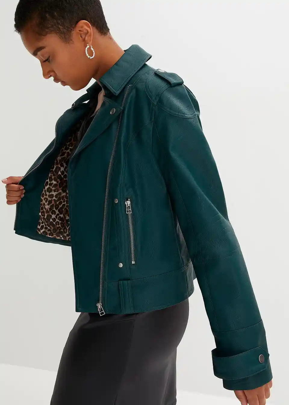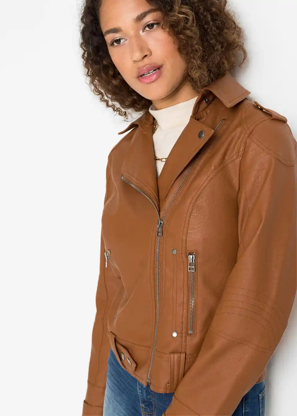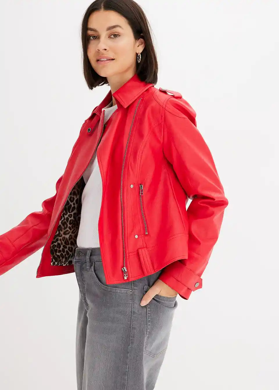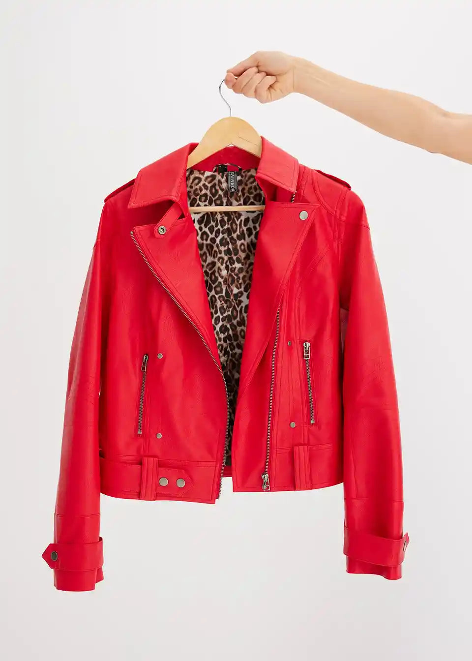 Biker-Jakna s svojim stilskim dizajnom poskrbi za izjemen vizualen učinek in outfitu doda rockerski videz. Trendni poudarki vključujejo prišite zanke ter vpadljive zakovice in pritiskače. Poleg tega se prilegata vstran nameščena zadrga in sprednji žepi. Zadrge na koncih rokavov dodajo kul poudarke. Podloga iz poliestra z leopardjim vzorcem ter zgornji material iz umetnega usnja dopolnjujeta izgled. V kombinaciji s potiskano obleko in gležnjarji se ženska s to Biker-Jakno pokaže v trendovskem slogu.