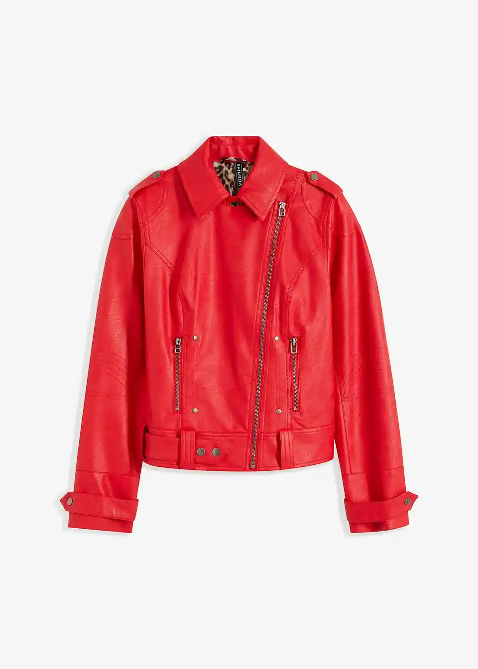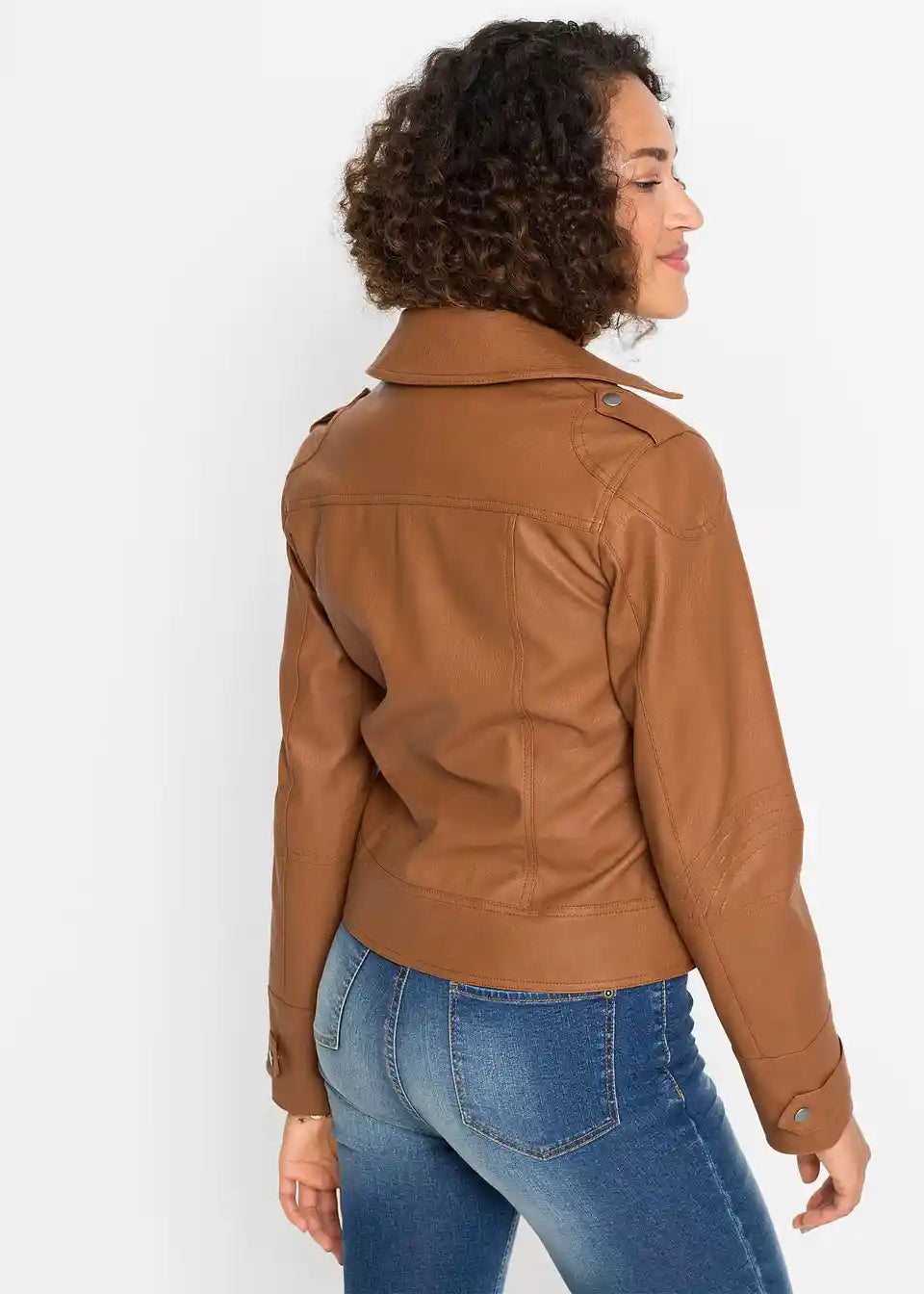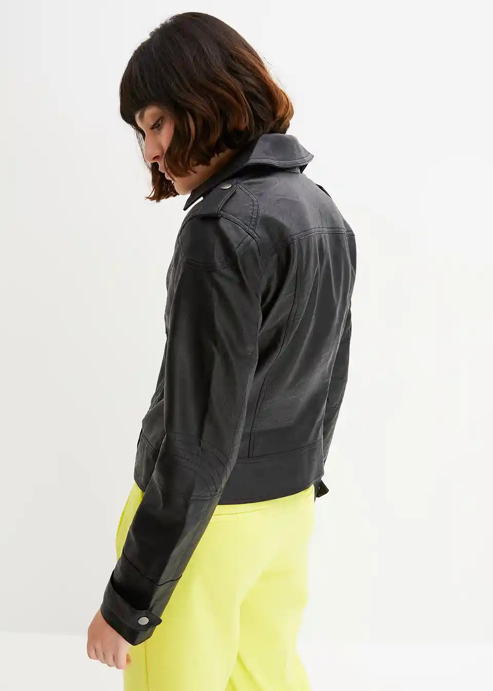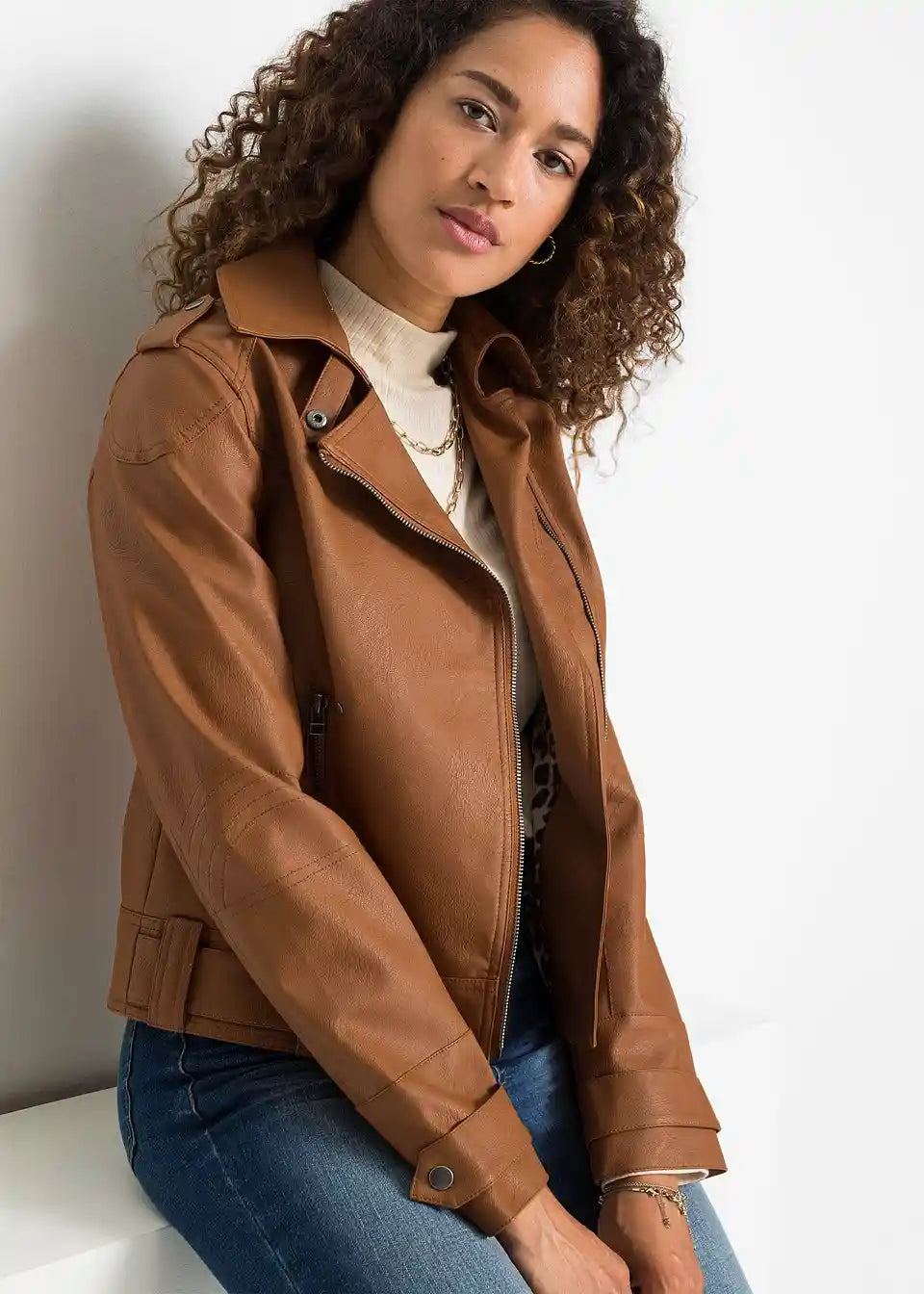 Biker-Jakna s svojim stilskim dizajnom poskrbi za izjemen vizualen učinek in outfitu doda rockerski videz. Trendni poudarki vključujejo prišite zanke ter vpadljive zakovice in pritiskače. Poleg tega se prilegata vstran nameščena zadrga in sprednji žepi. Zadrge na koncih rokavov dodajo kul poudarke. Podloga iz poliestra z leopardjim vzorcem ter zgornji material iz umetnega usnja dopolnjujeta izgled. V kombinaciji s potiskano obleko in gležnjarji se ženska s to Biker-Jakno pokaže v trendovskem slogu.