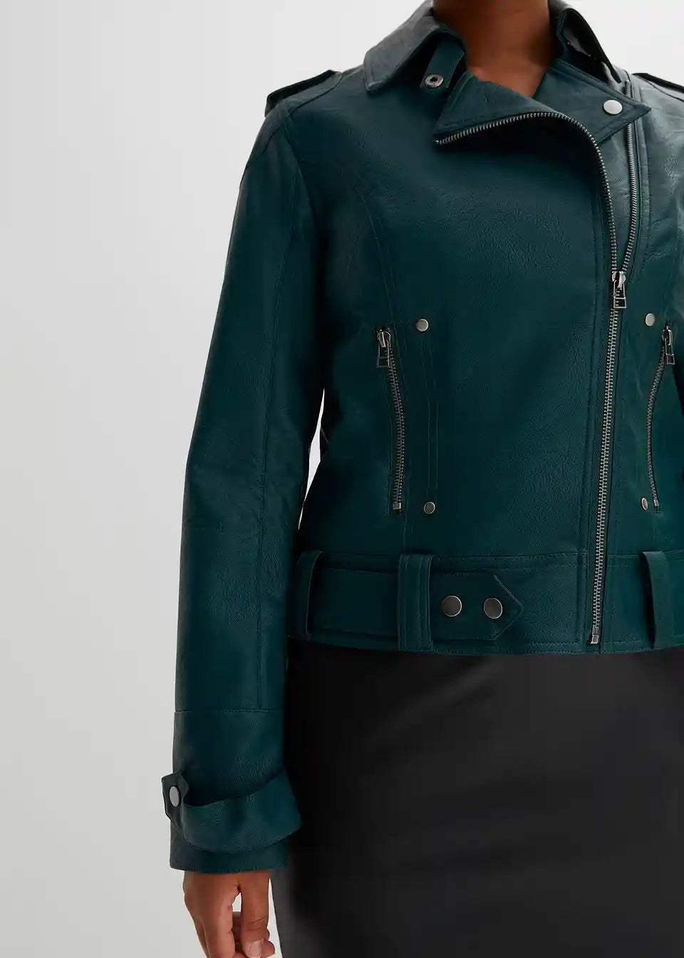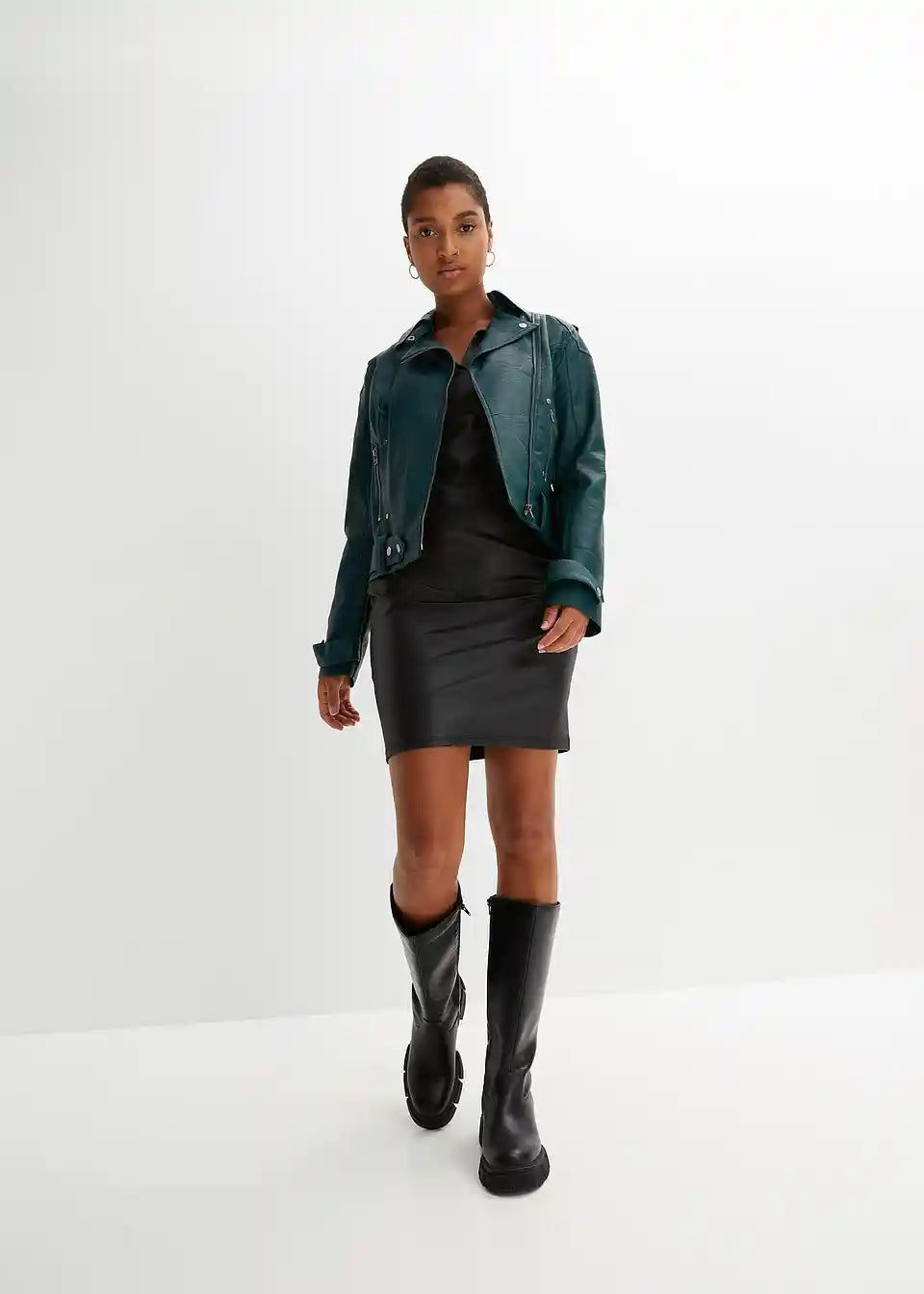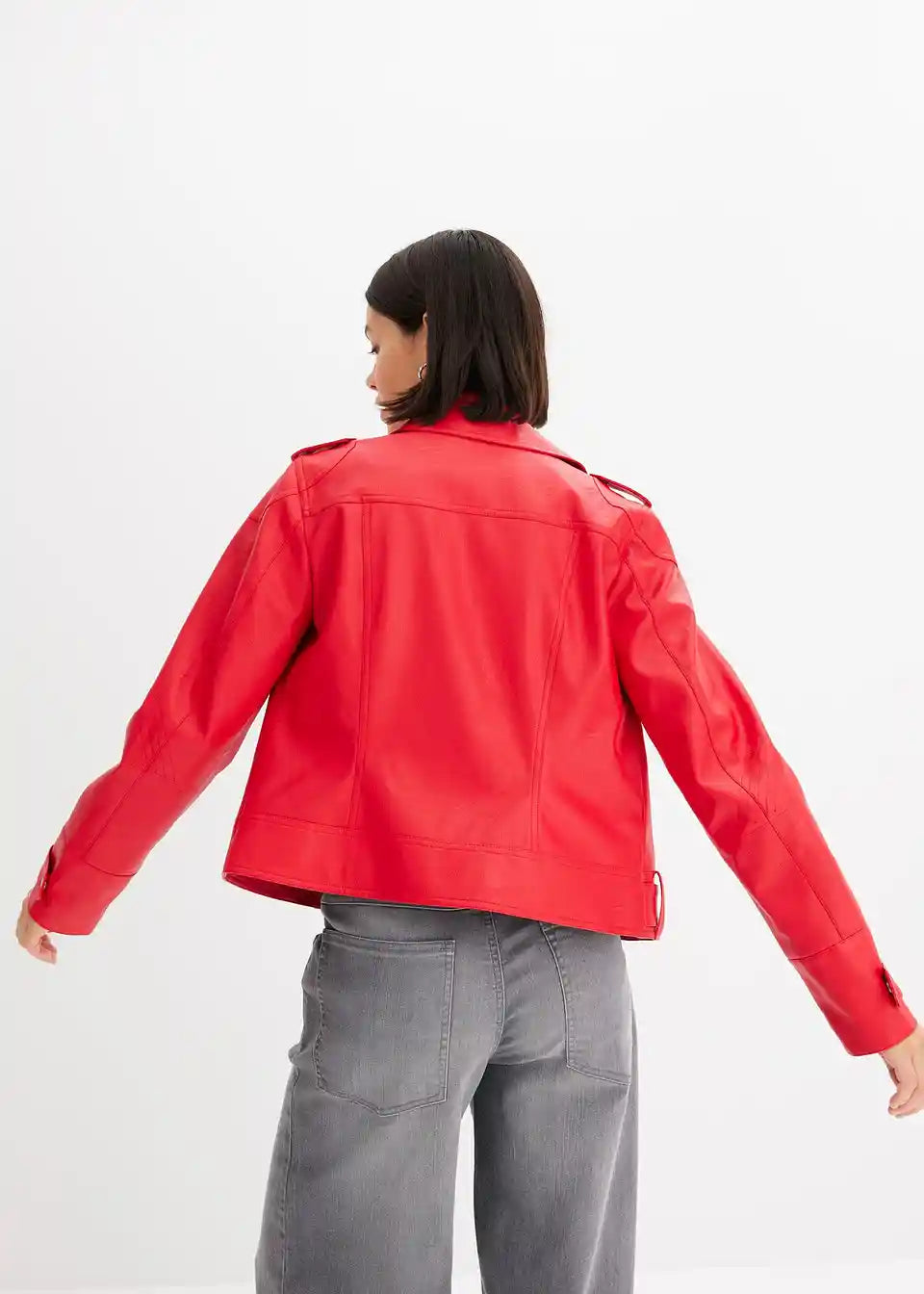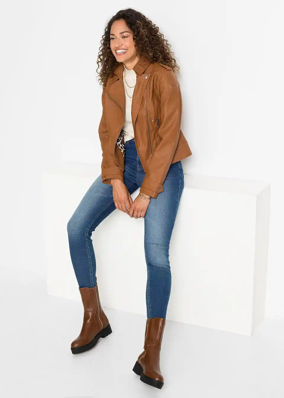 Biker-Jakna s svojim stilskim dizajnom poskrbi za izjemen vizualen učinek in outfitu doda rockerski videz. Trendni poudarki vključujejo prišite zanke ter vpadljive zakovice in pritiskače. Poleg tega se prilegata vstran nameščena zadrga in sprednji žepi. Zadrge na koncih rokavov dodajo kul poudarke. Podloga iz poliestra z leopardjim vzorcem ter zgornji material iz umetnega usnja dopolnjujeta izgled. V kombinaciji s potiskano obleko in gležnjarji se ženska s to Biker-Jakno pokaže v trendovskem slogu.