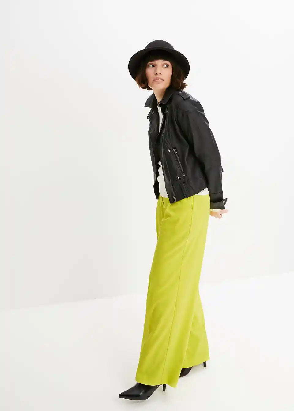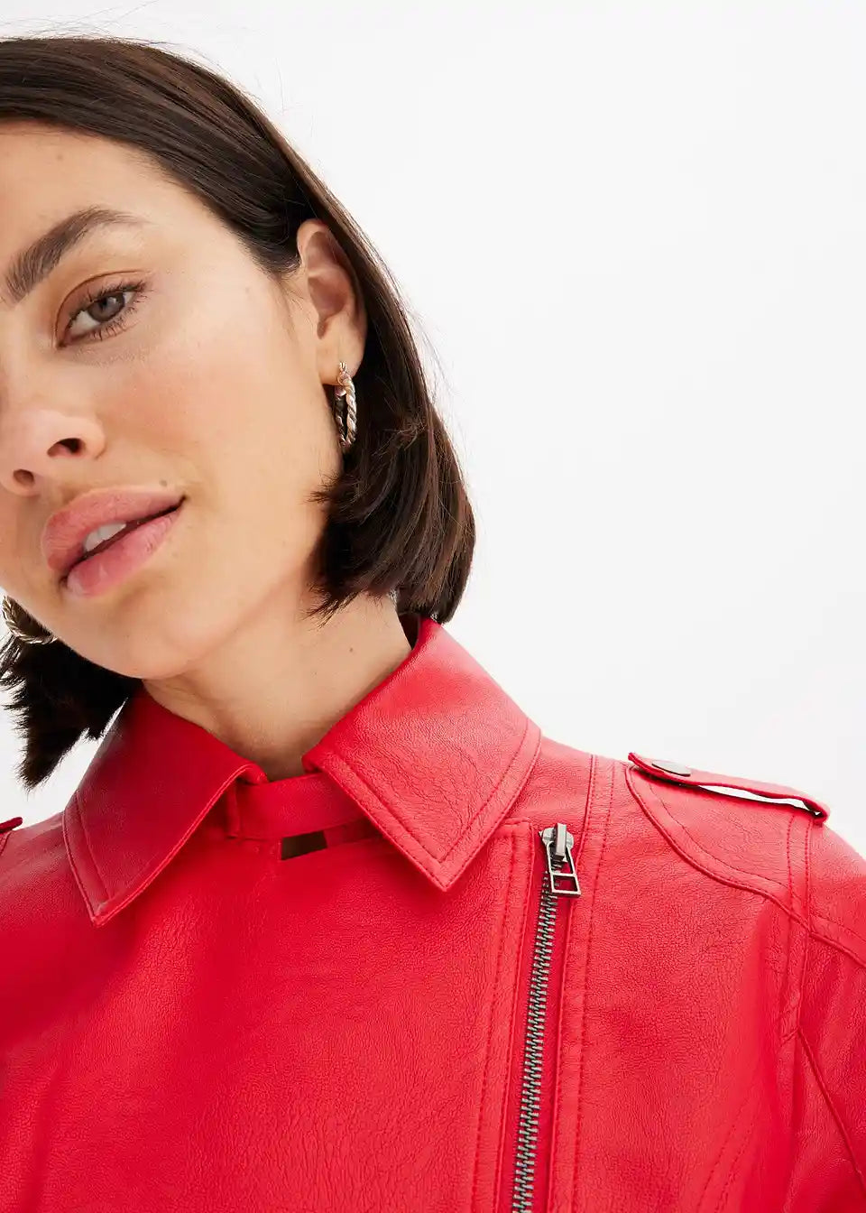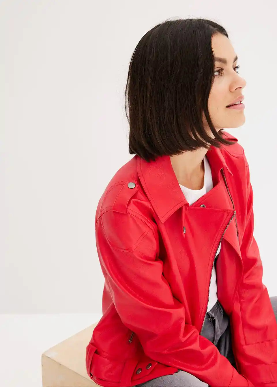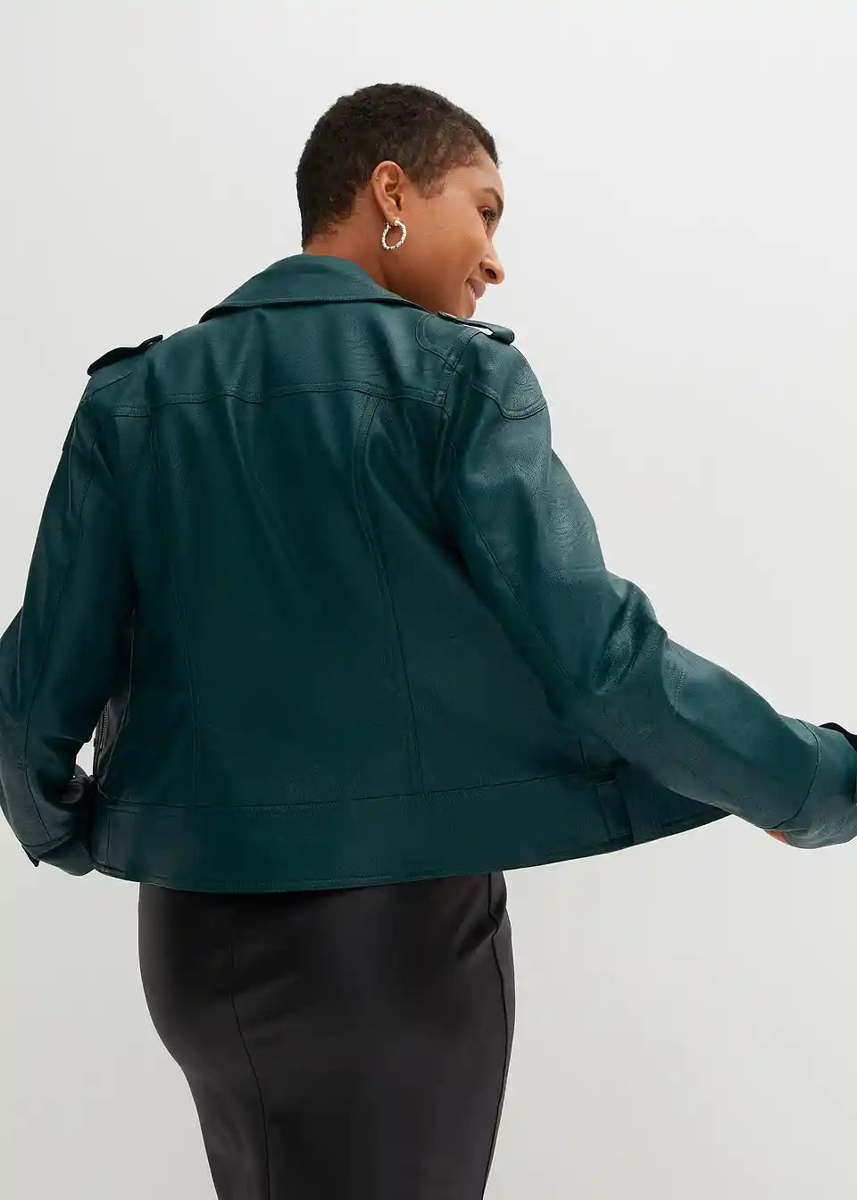Biker-Jakna s svojim stilskim dizajnom poskrbi za izjemen vizualen učinek in outfitu doda rockerski videz. Trendni poudarki vključujejo prišite zanke ter vpadljive zakovice in pritiskače. Poleg tega se prilegata vstran nameščena zadrga in sprednji žepi. Zadrge na koncih rokavov dodajo kul poudarke. Podloga iz poliestra z leopardjim vzorcem ter zgornji material iz umetnega usnja dopolnjujeta izgled. V kombinaciji s potiskano obleko in gležnjarji se ženska s to Biker-Jakno pokaže v trendovskem slogu.