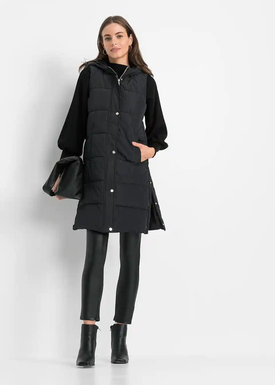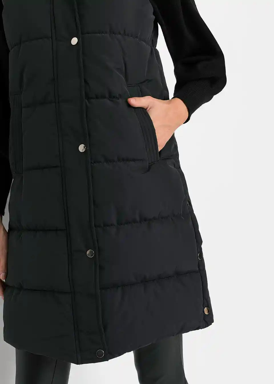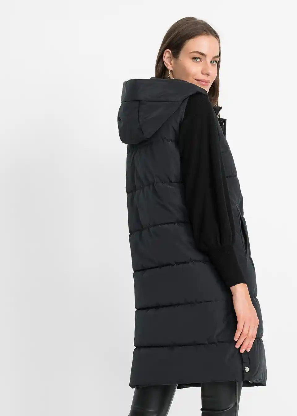 Moden prešit telovnik s funkcionalno kapuco in stranskimi režami, ki jih lahko zaprete z gumbi.