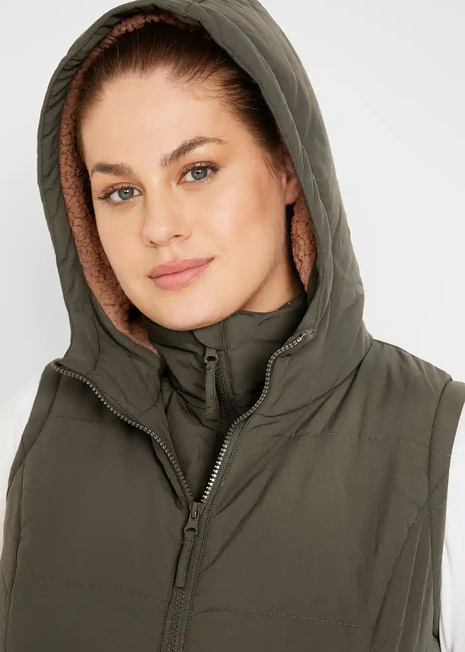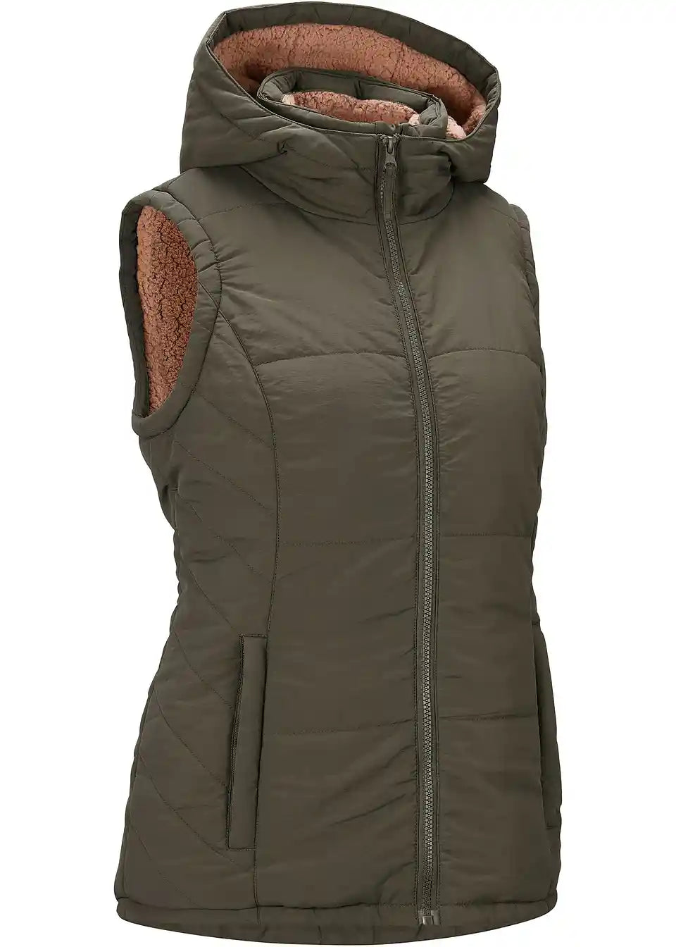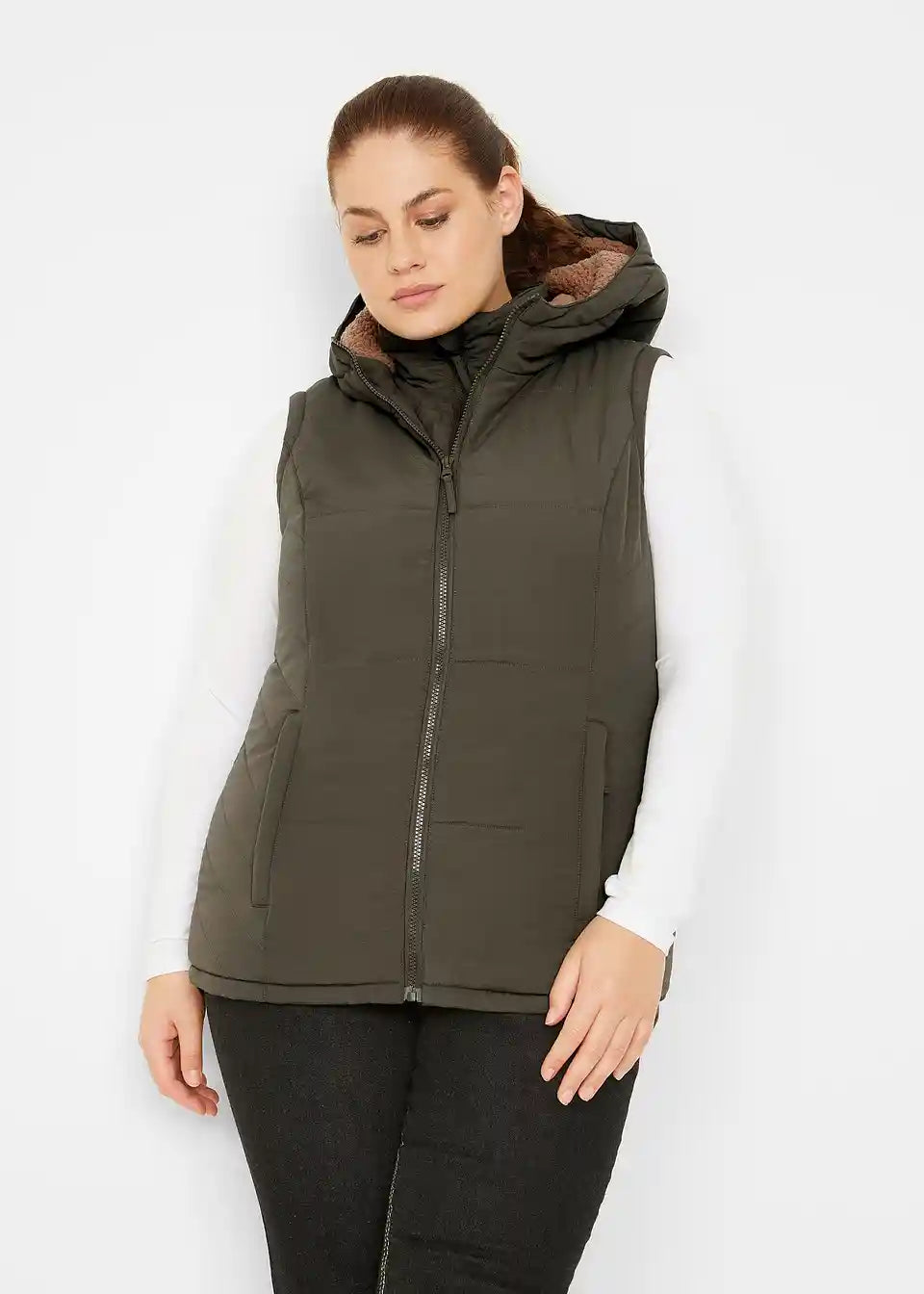 Prešiti telovnik z teddy podlogo, stranskimi vložki, žepi z zadrgo, notranji žep, dolžina v št. 42 približno 74 cm.