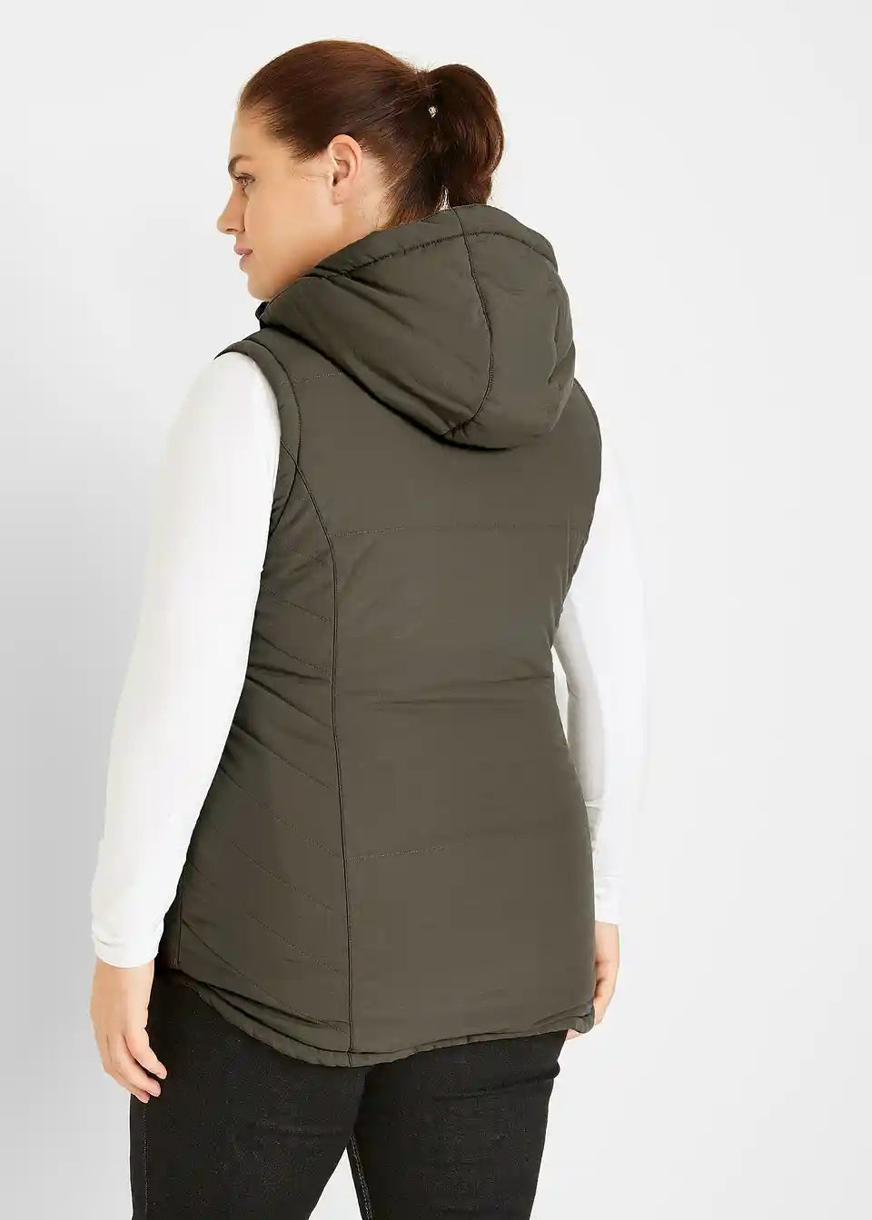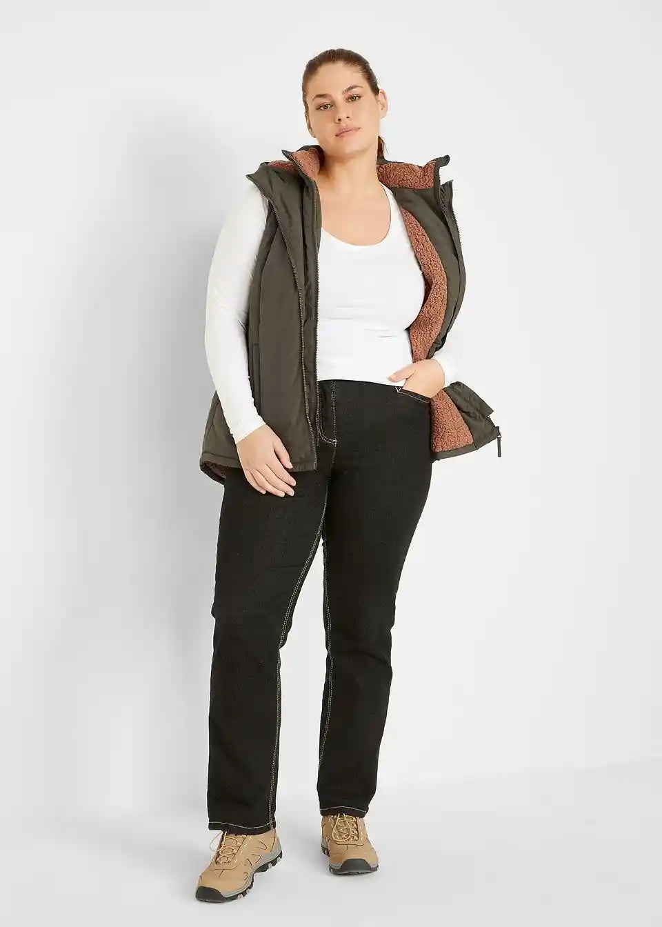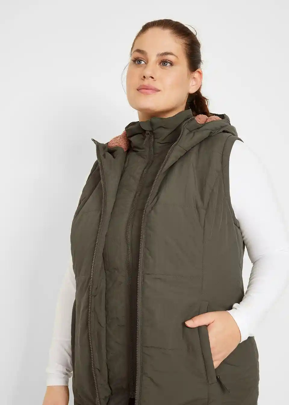 Prešiti telovnik z teddy podlogo, stranskimi vložki, žepi z zadrgo, notranji žep, dolžina v št. 42 približno 74 cm.