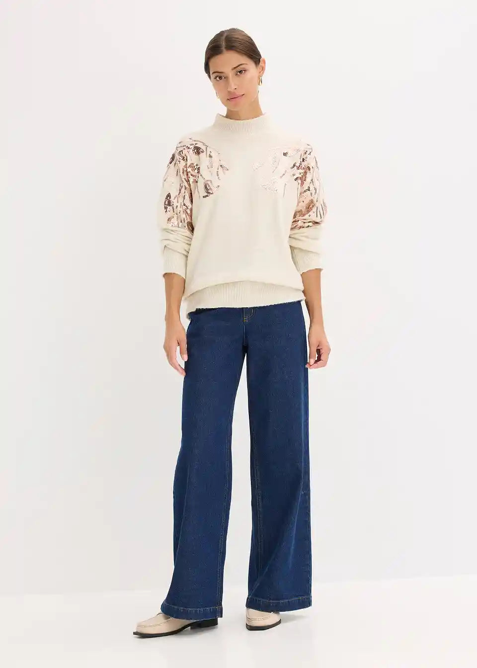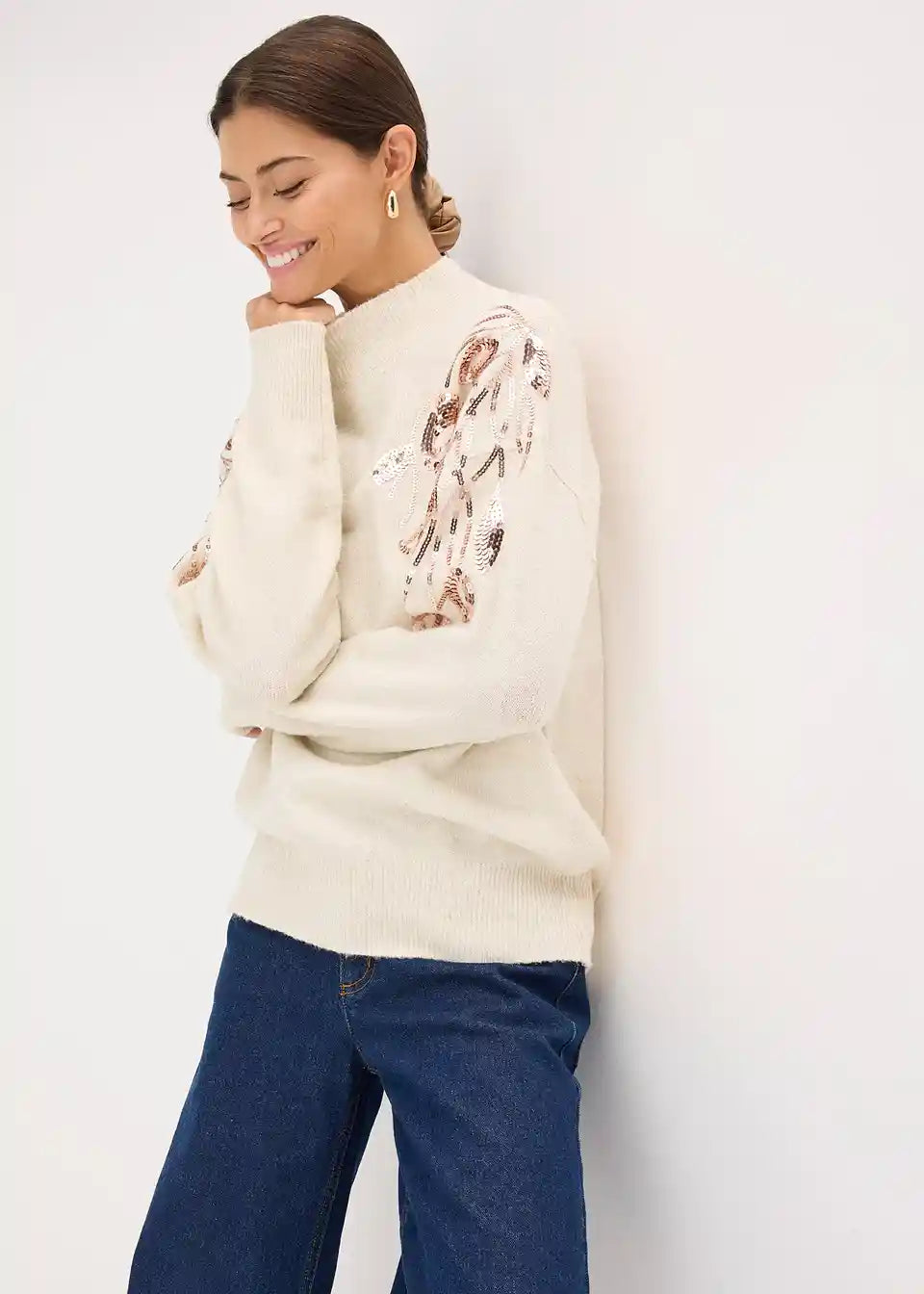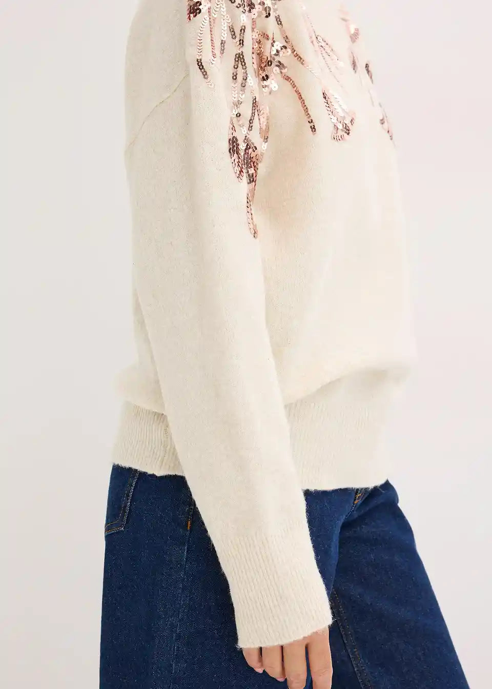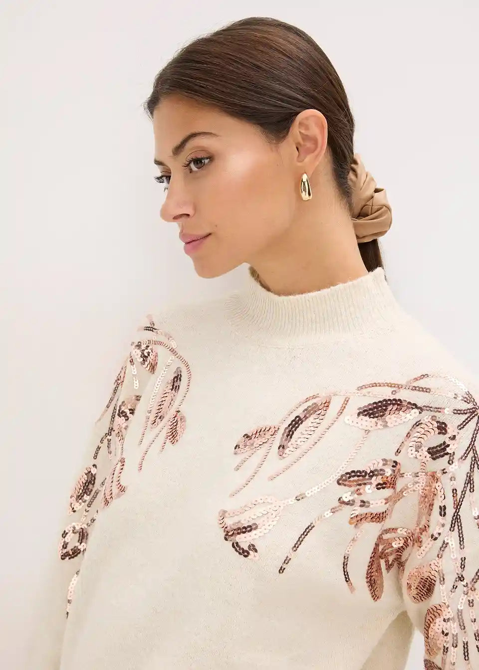 Mehek ohlapen pulover z okrasno aplikacijo bleščic spredaj in na rokavih