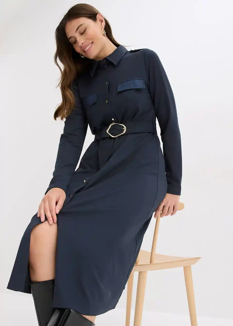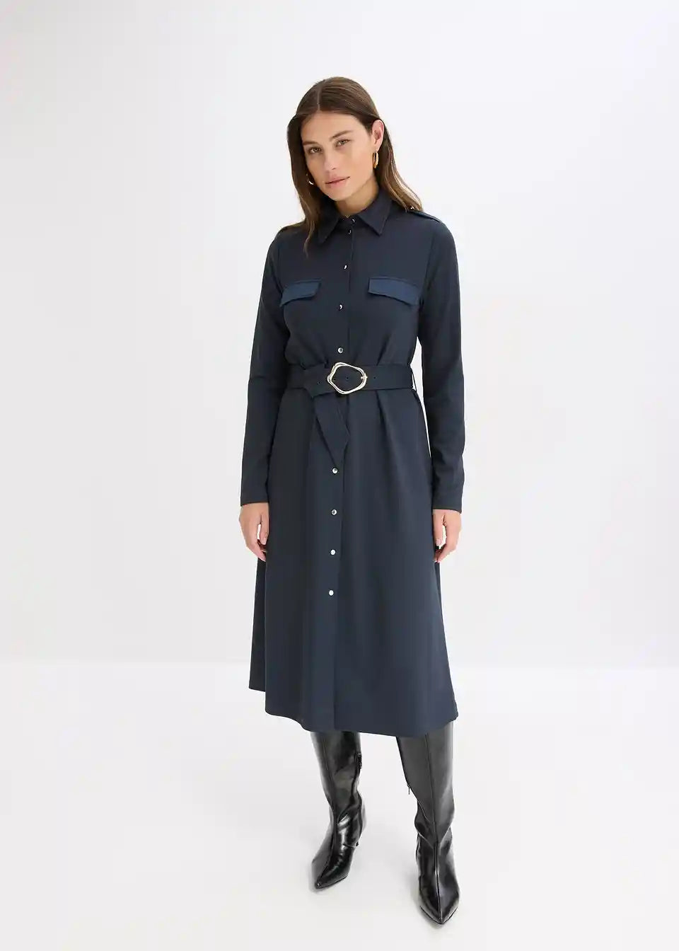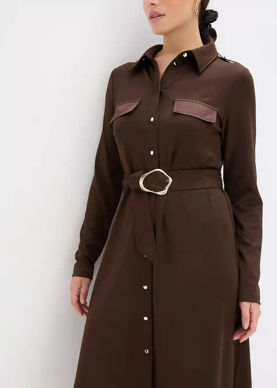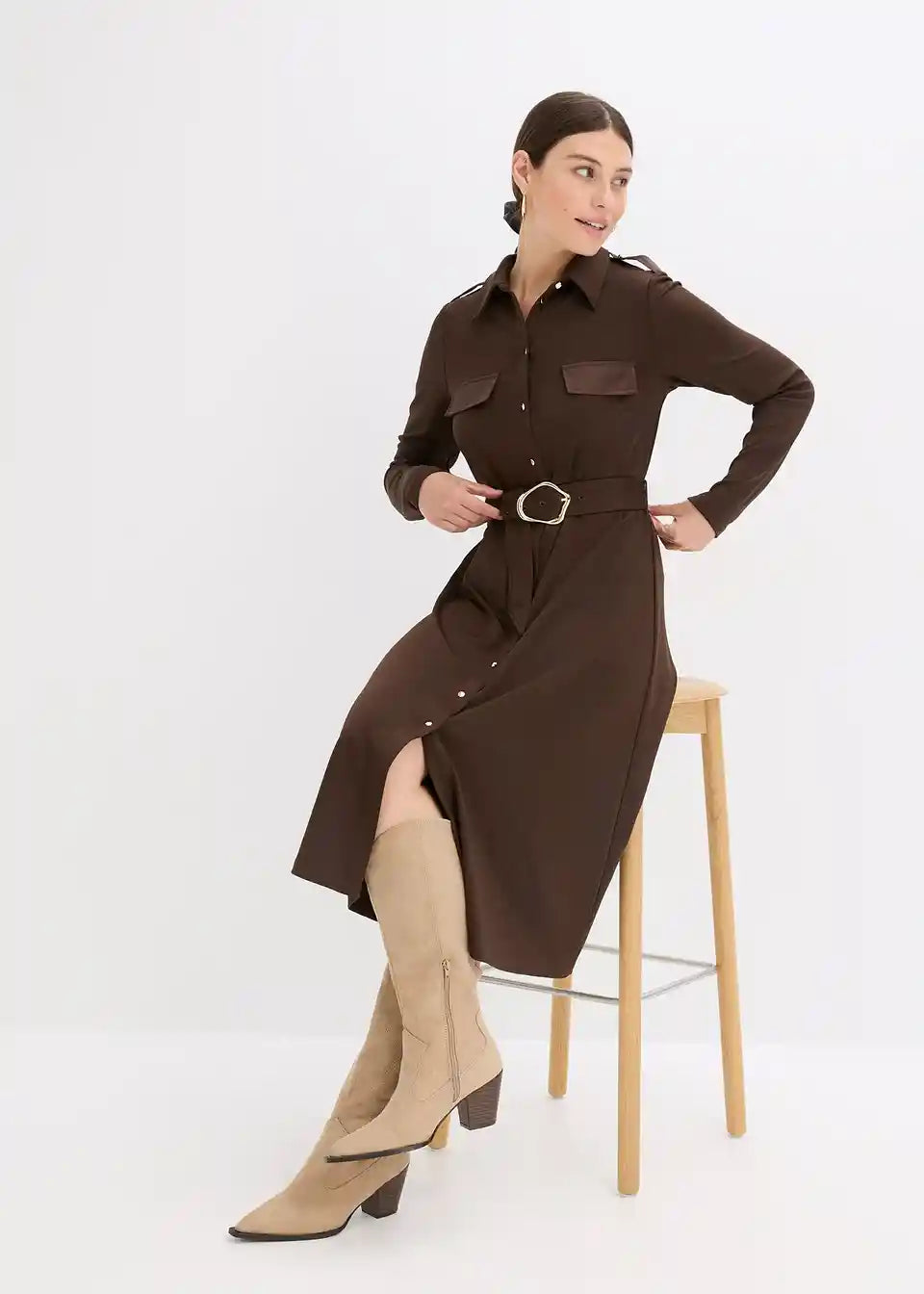 Moderna obleka s pasom in žepi