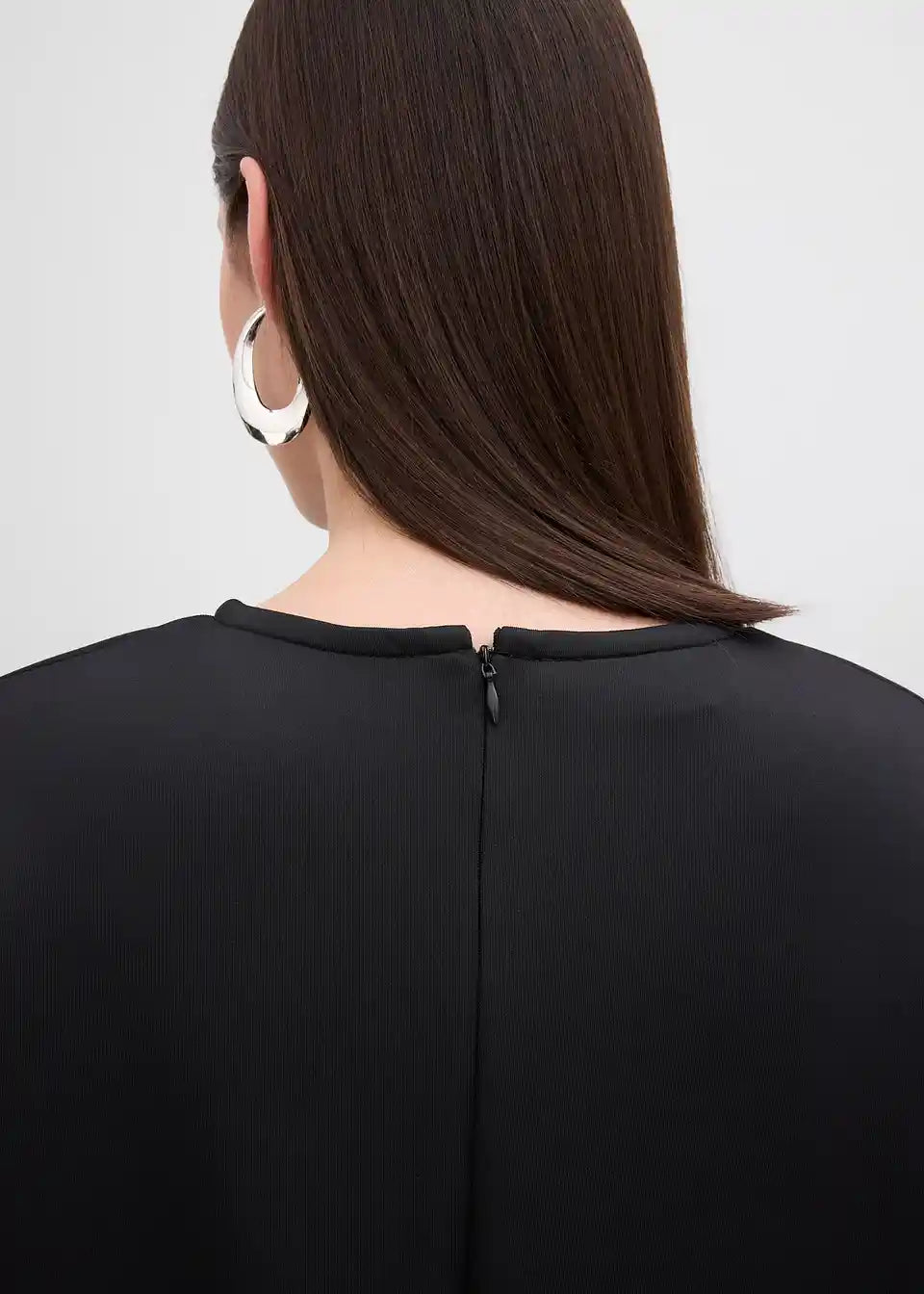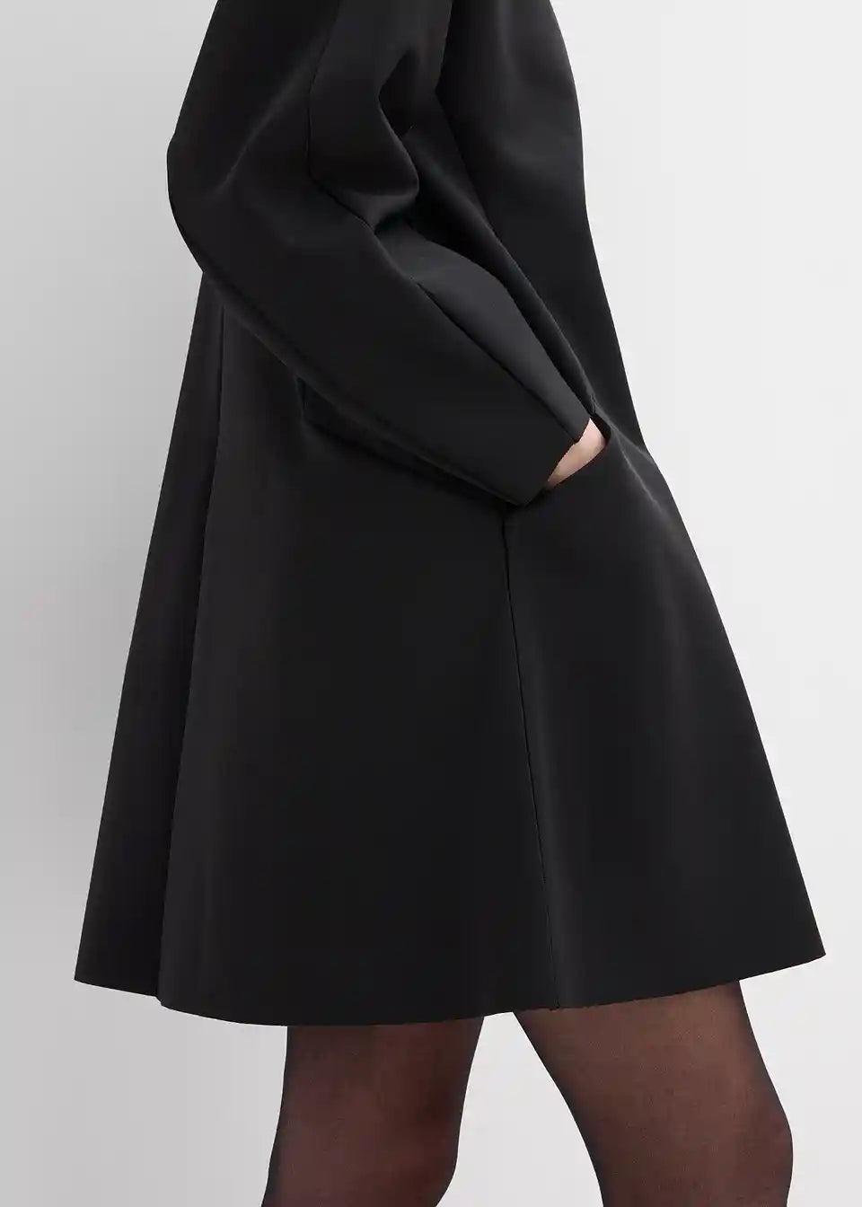 Mini obleka z okroglim izrezom, prešivi spredaj in na rokavih, zakrito zadrgo zadaj ter dvema žepoma v šivu spredaj.