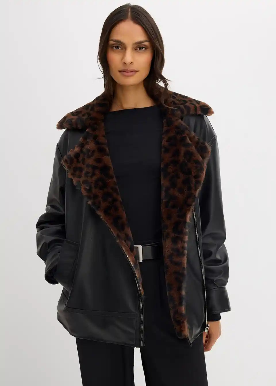 Moderna ohlapna jakna iz umetnega usnja z leopardjim umetnim krznom